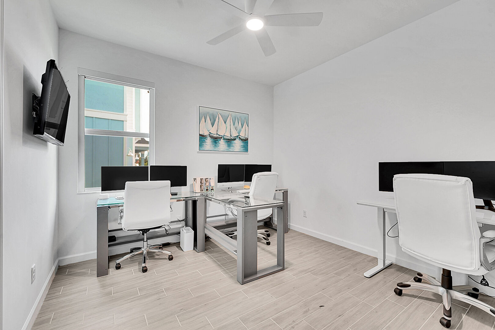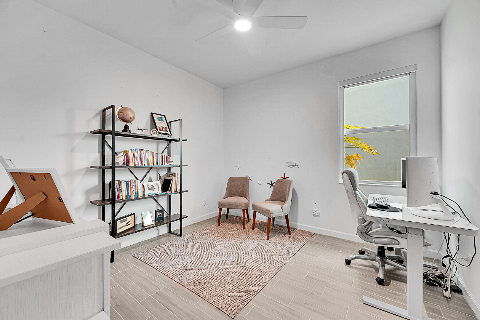 Baseboards Wall, Ceiling Fan, Drywall, Natural Light, Office Area, Wood Finish Floor, Baseboards Wall, Natural Light, Office Area