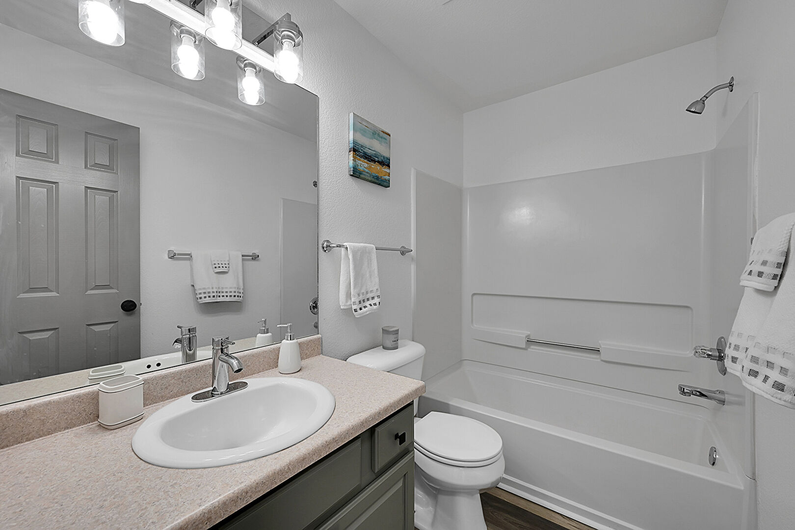 Combined Bath Shower, Drywall, Full Bathroom, Vanity, Wood Finish Floor