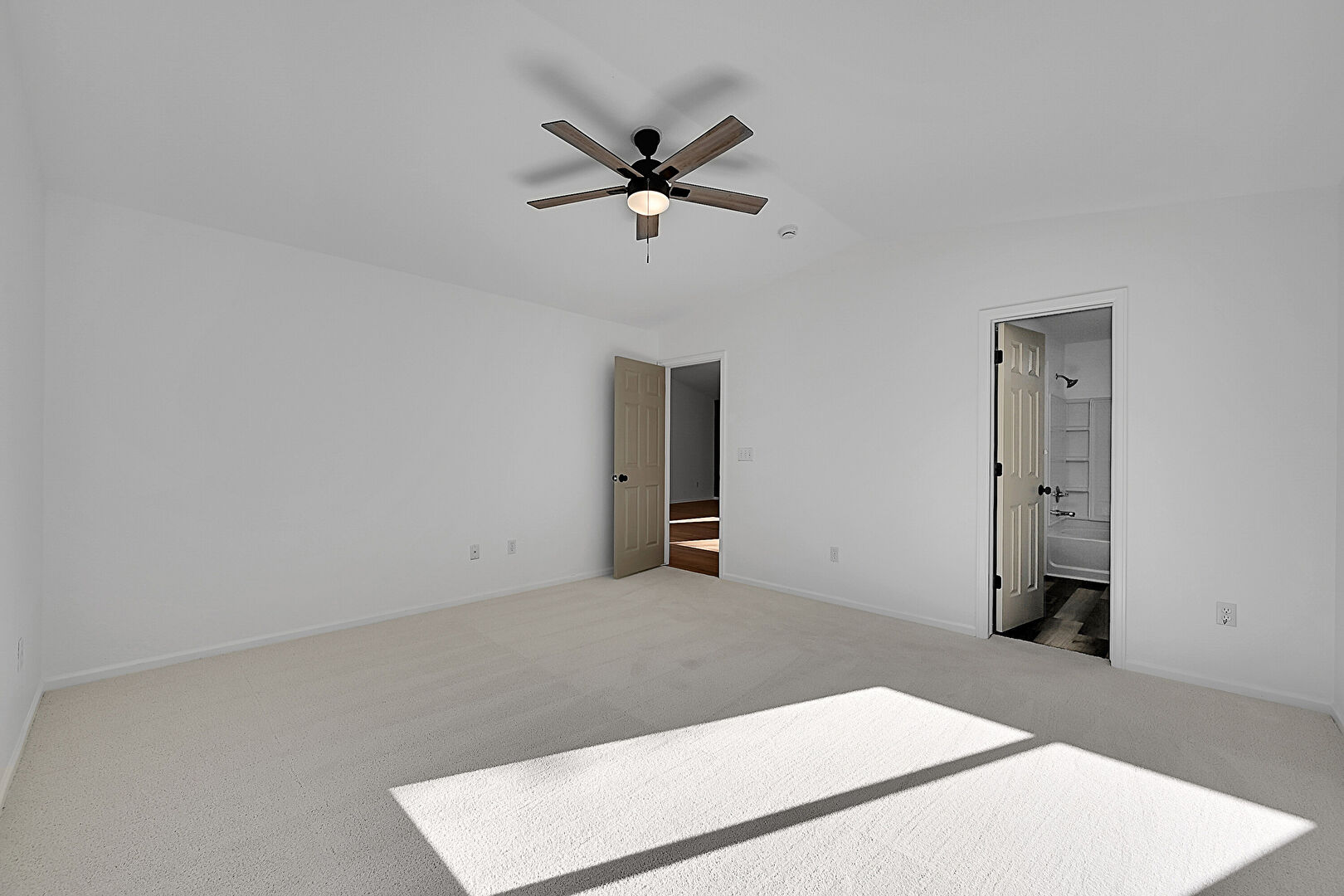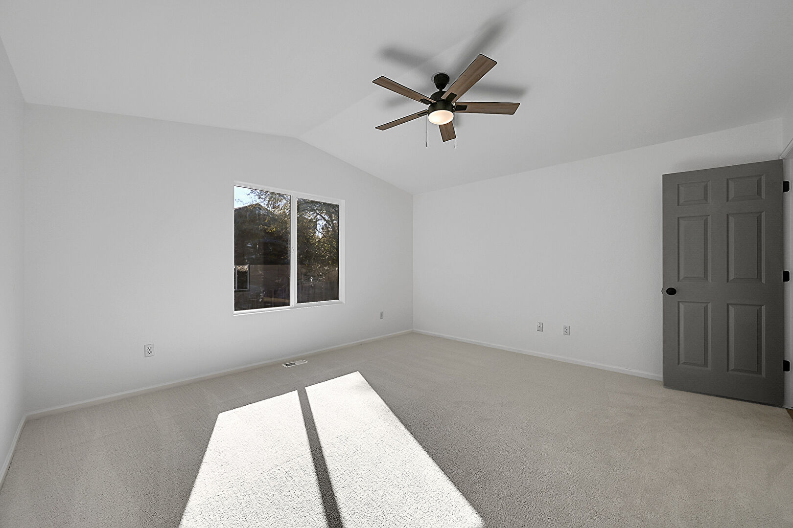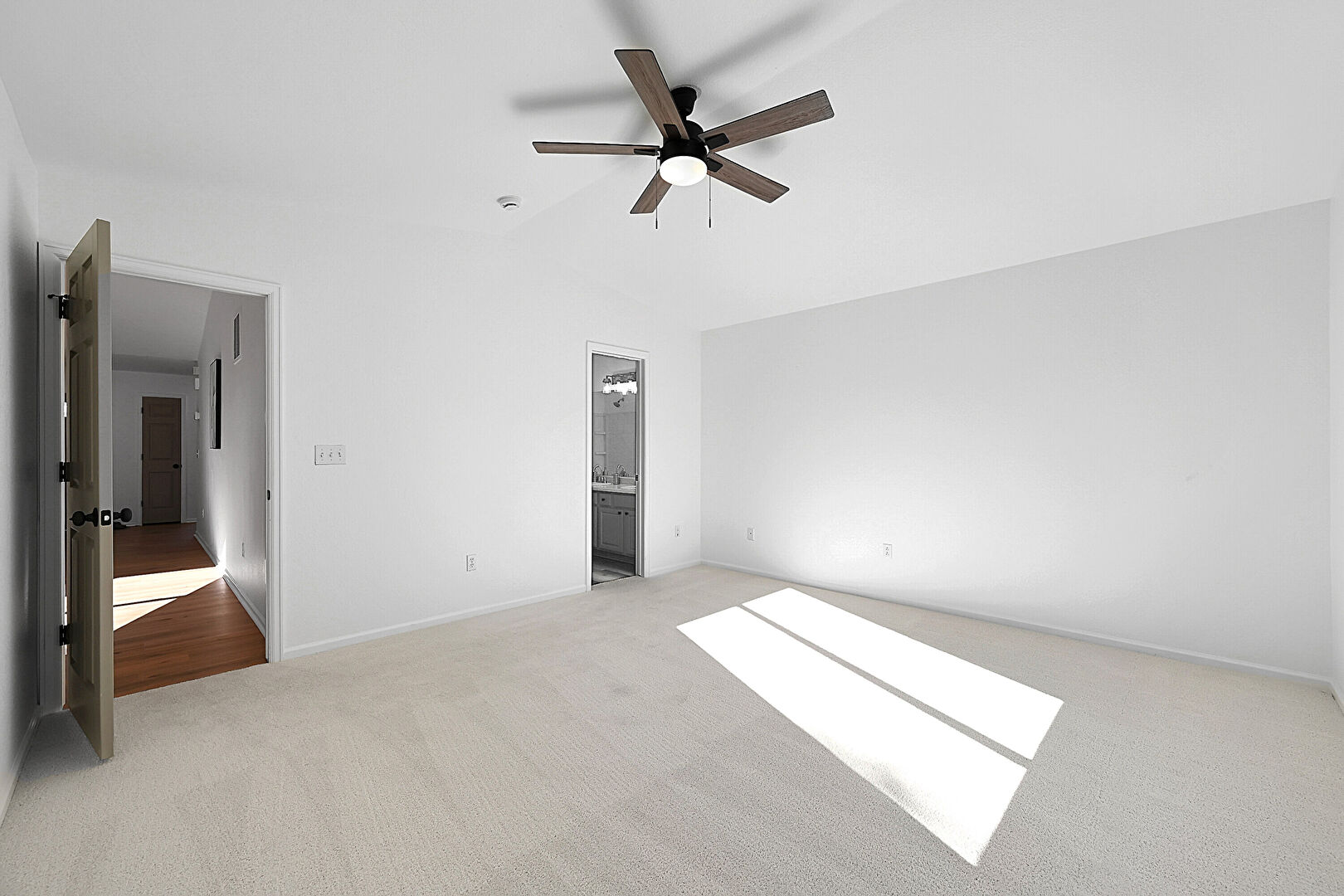 Baseboards Wall, Carpet, Cathedral Ceiling, Ceiling Fan, Drywall, Ensuite Bathroom, Natural Light, Vaulted Ceiling, Vent, Ceiling Fan, Drywall, Natural Light, Vaulted Ceiling