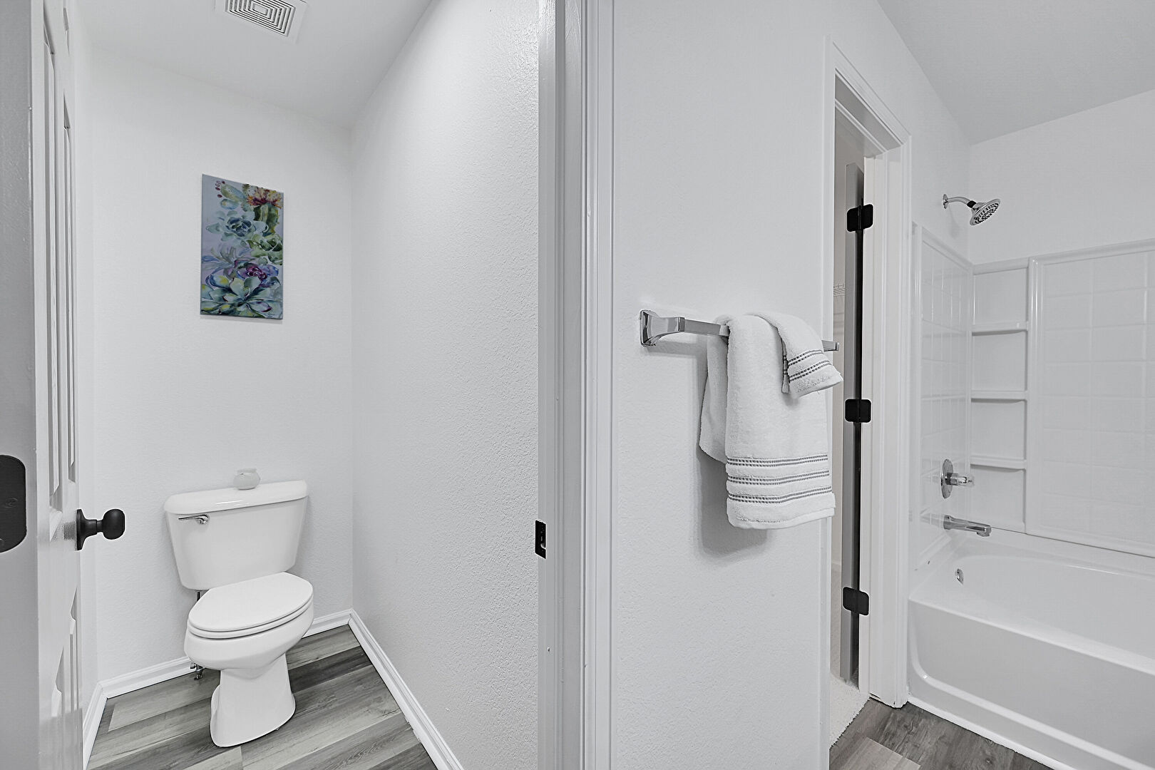 Baseboards Wall, Combined Bath Shower, Full Bathroom, Vent, Wood Finish Floor, Drywall