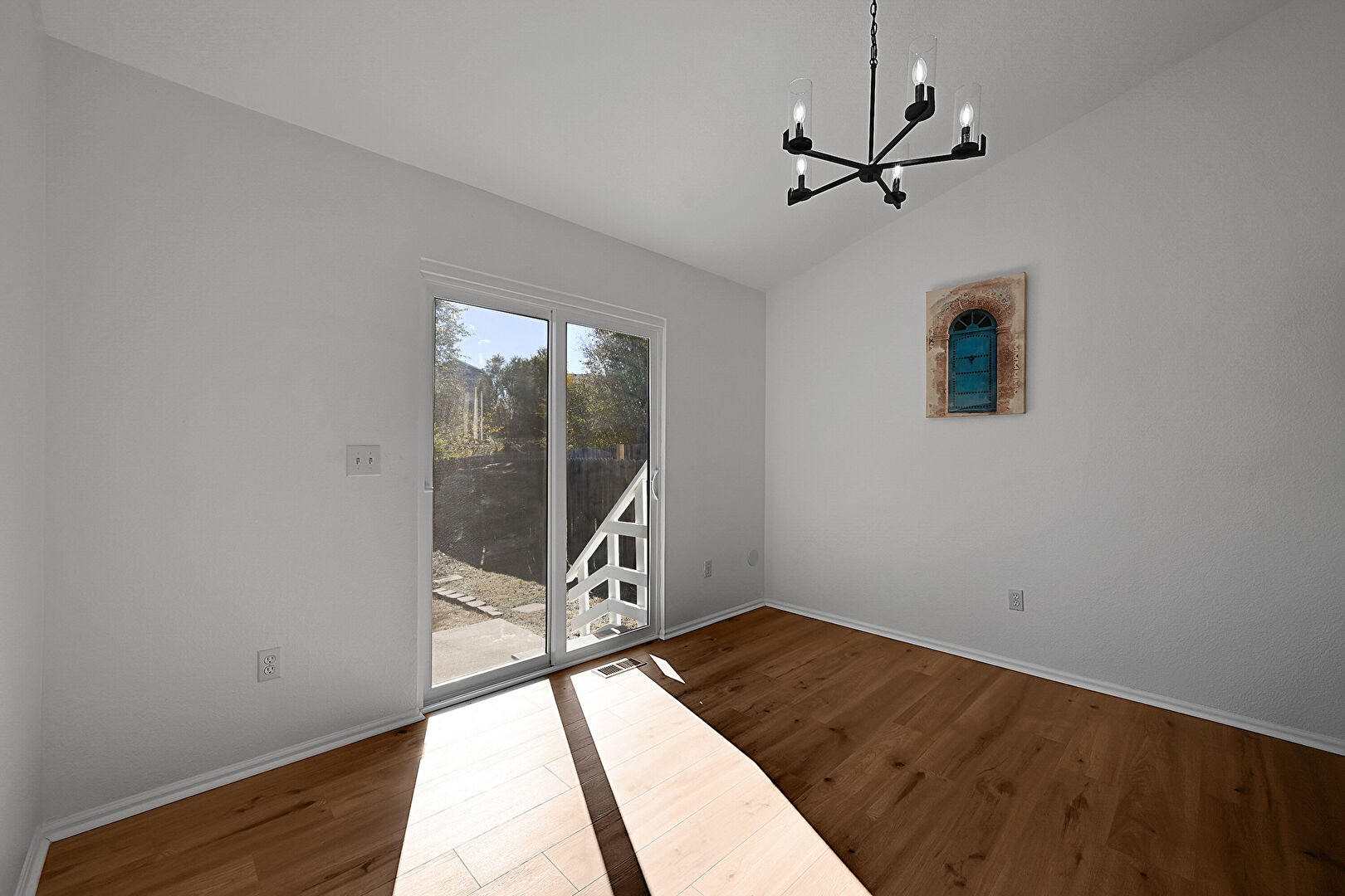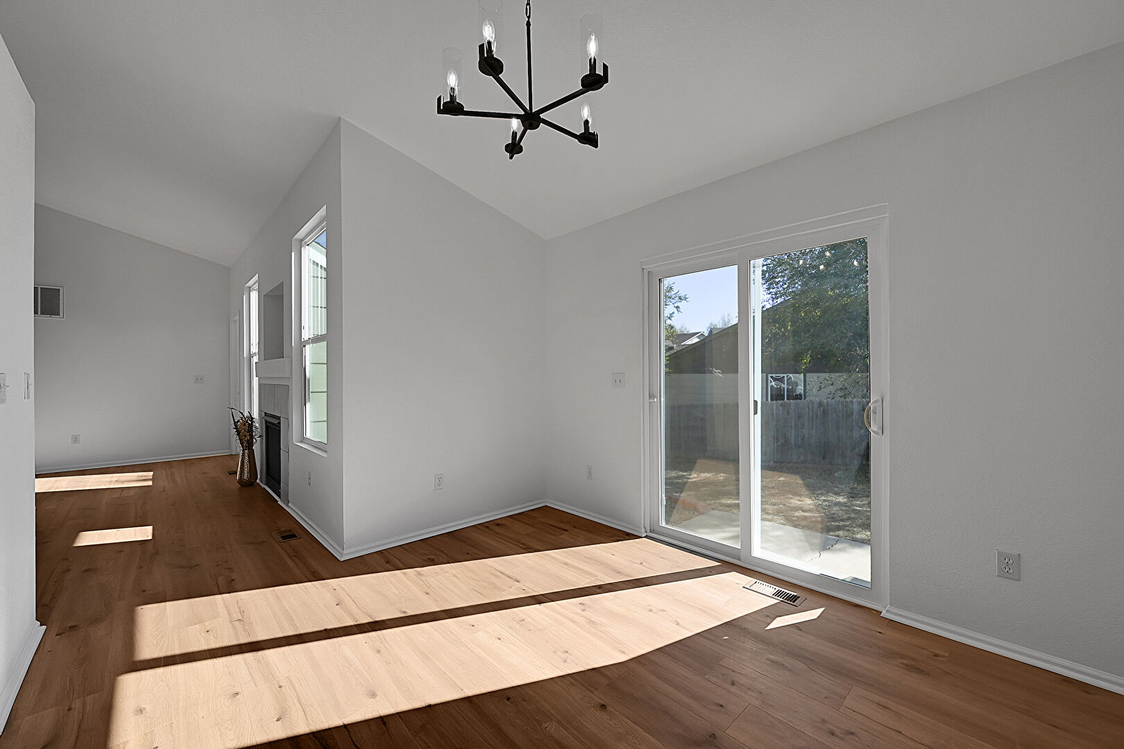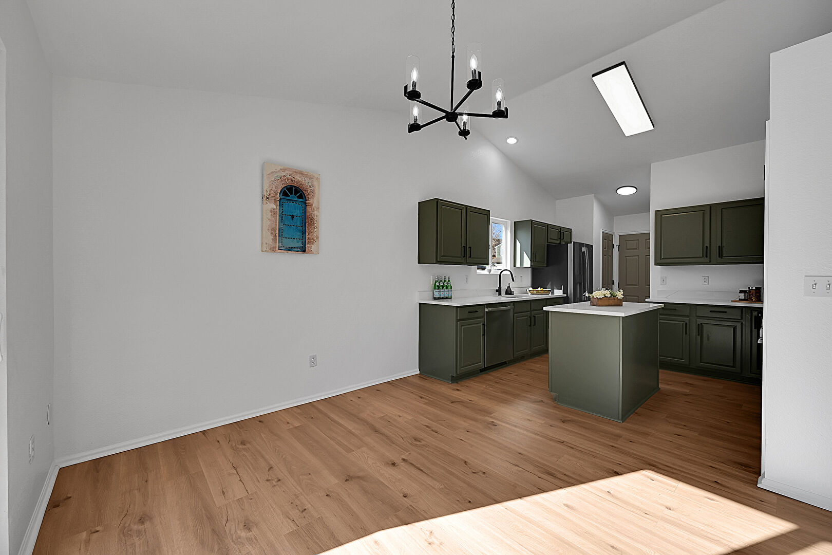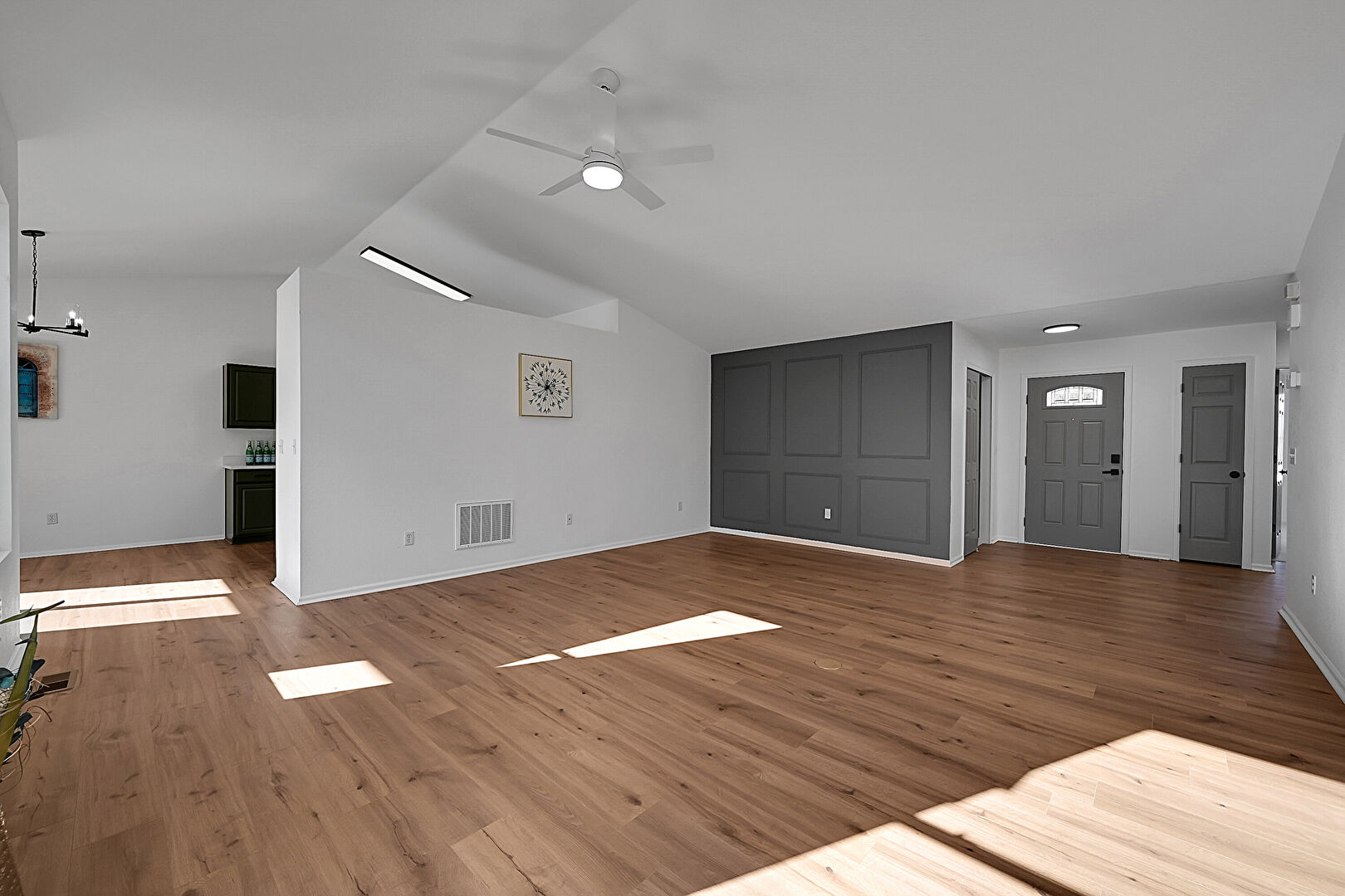 Baseboards Wall, Drywall, Natural Light, Notable Chandelier, Vaulted Ceiling, Vent, Wood Finish Floor, Vaulted Ceiling, Wood Finish Floor