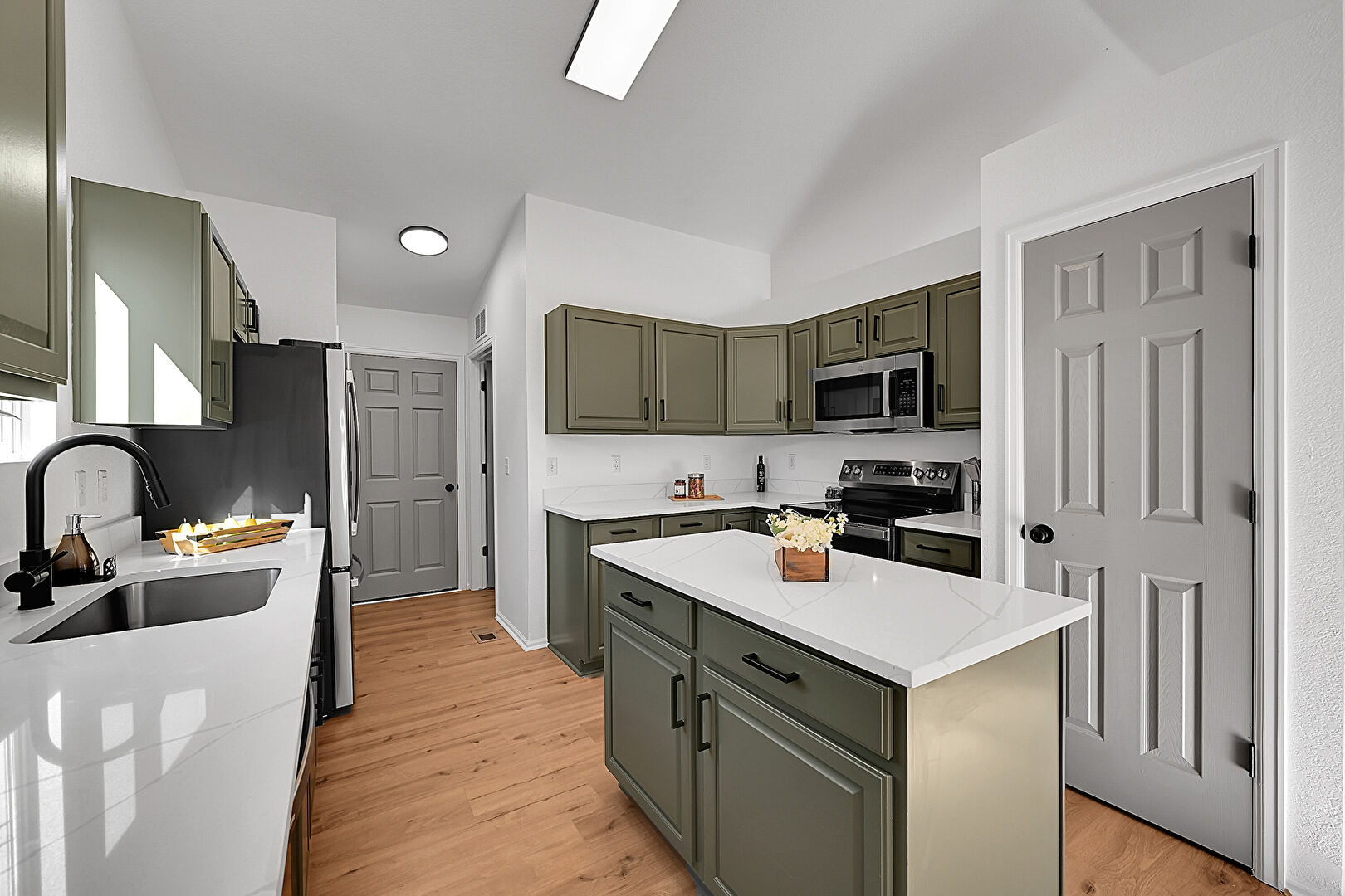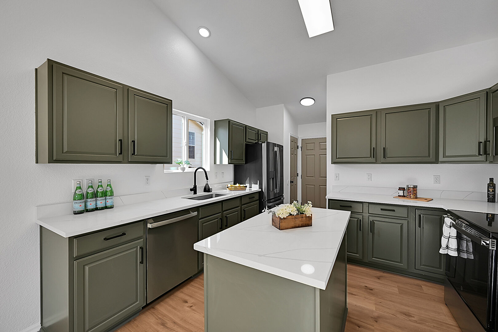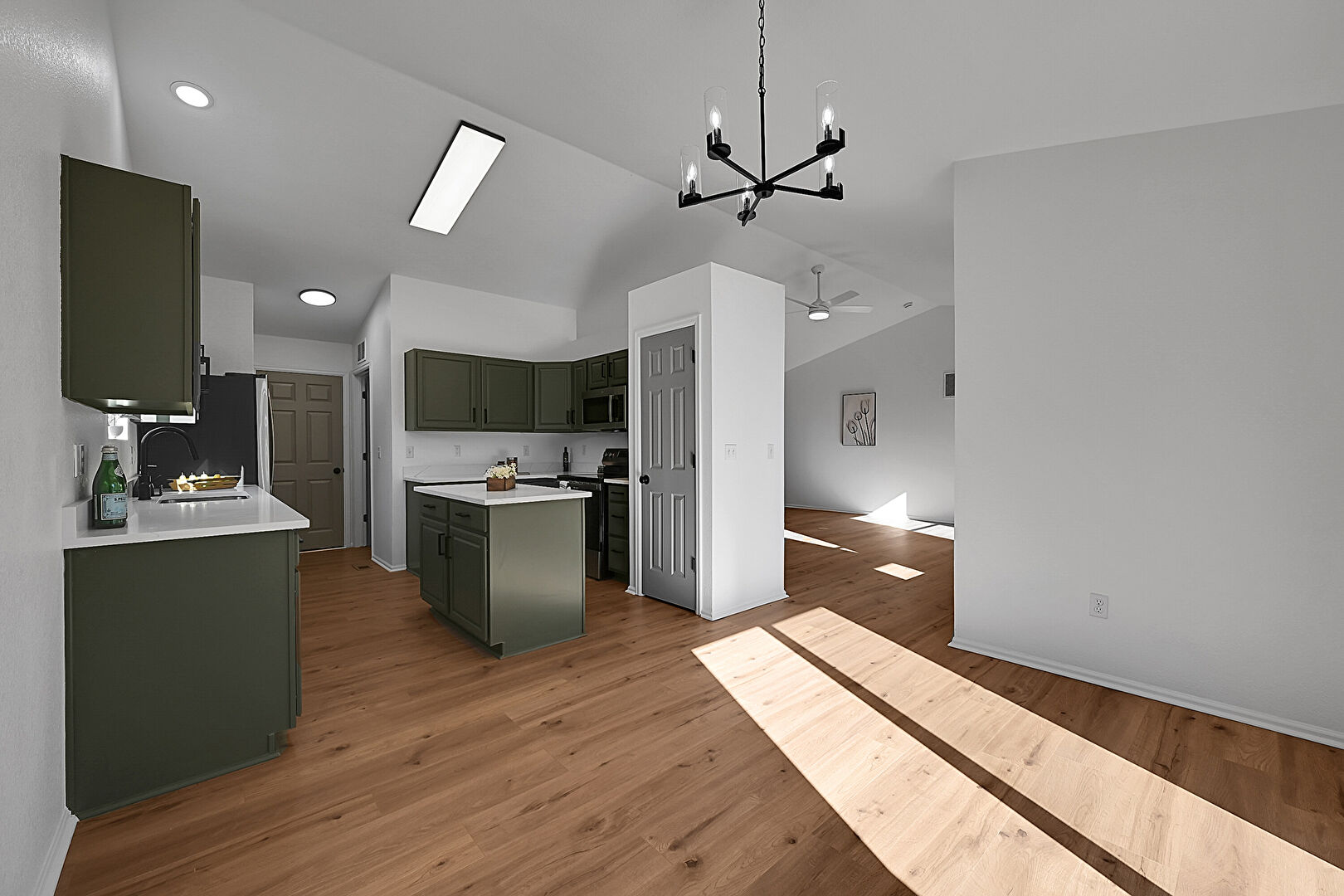 Baseboards Wall, Ceiling Fan, Drywall, Gray Cabinets, Green Cabinets, High Ceiling, Kitchen Island, Natural Light, Notable Chandelier, Pendant Lighting, Raised Cabinets, Recessed Lighting, Stone Countertops, U Shaped Kitchen, Vaulted Ceiling, Vent, Wood Finish Floor, Gray Cabinets, Notable Chandelier, Raised Cabinets, Vaulted Ceiling, Wood Finish Floor