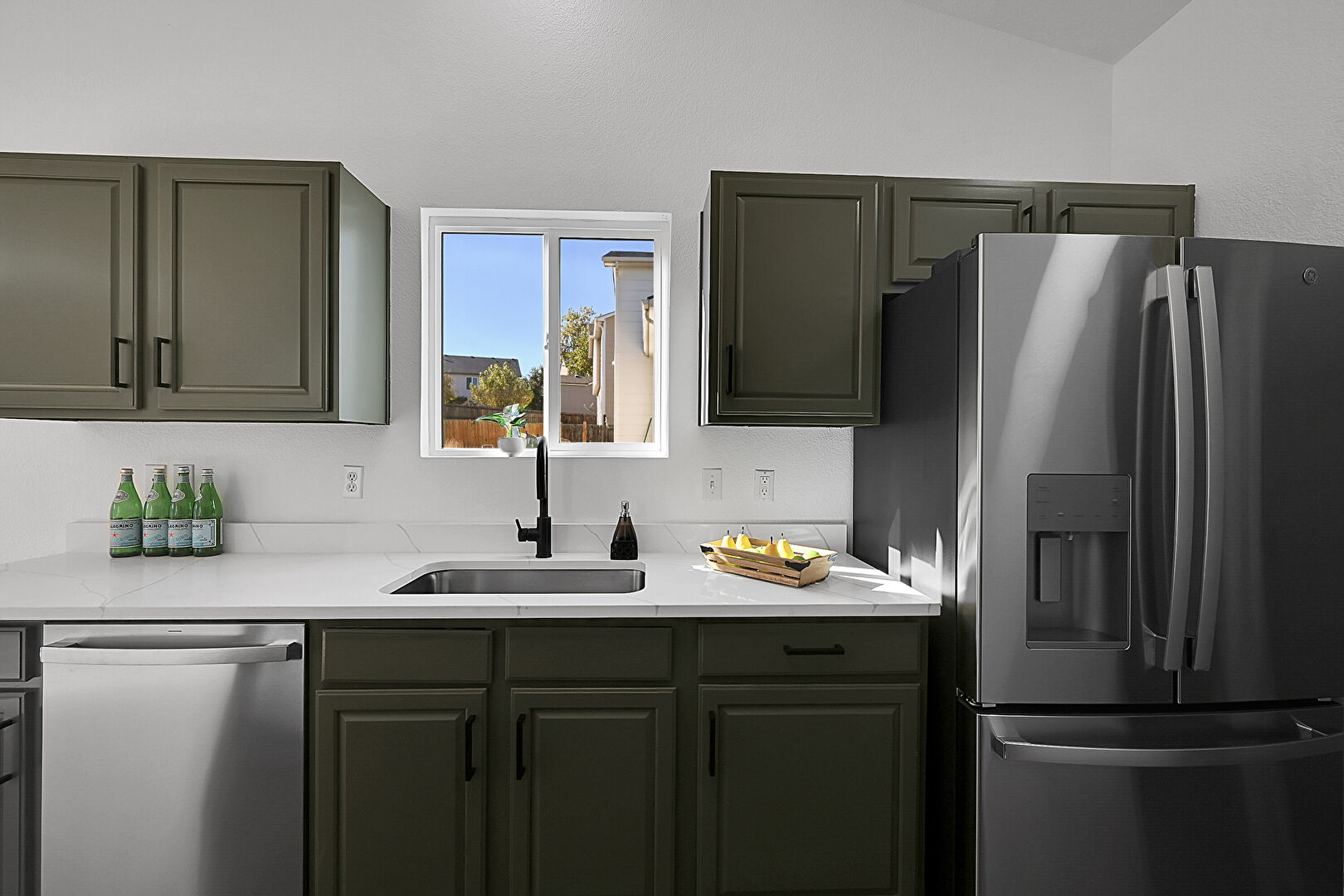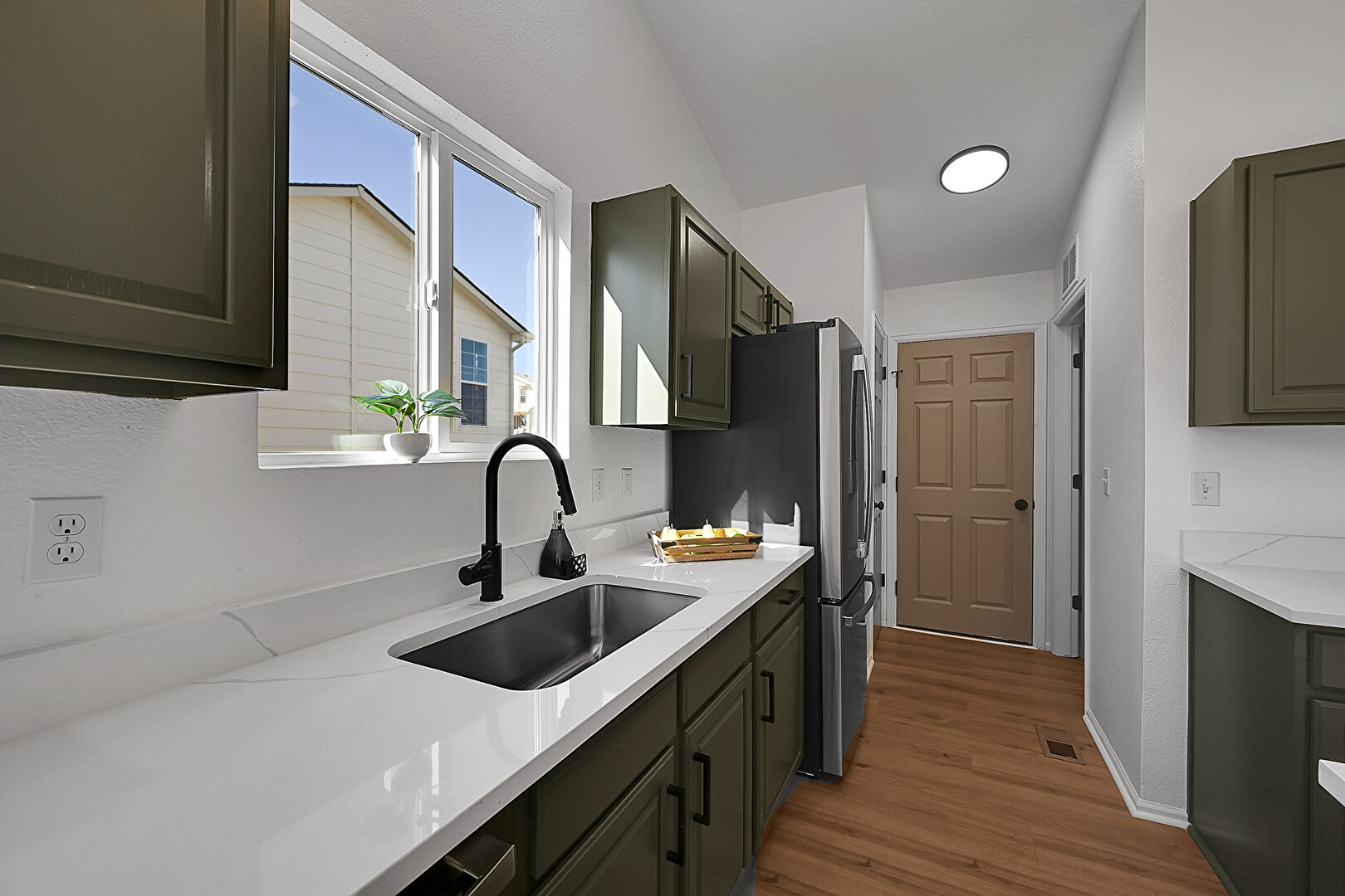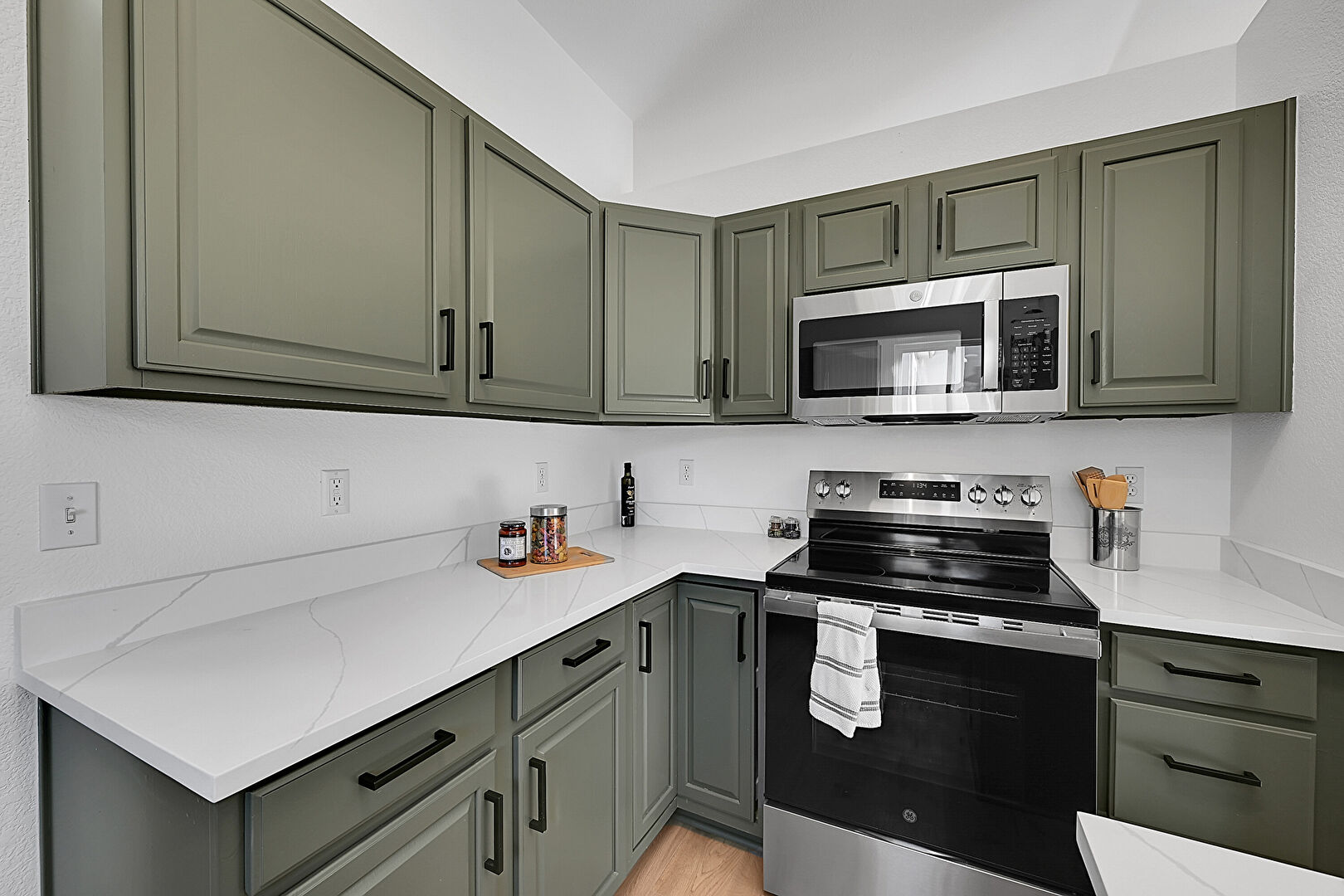 Baseboards Wall, Ceiling Fan, Drywall, Gray Cabinets, Green Cabinets, High Ceiling, Kitchen Island, Natural Light, Notable Chandelier, Pendant Lighting, Raised Cabinets, Recessed Lighting, Stone Countertops, U Shaped Kitchen, Vaulted Ceiling, Vent, Wood Finish Floor, Gray Cabinets, Notable Chandelier, Raised Cabinets, Vaulted Ceiling, Wood Finish Floor