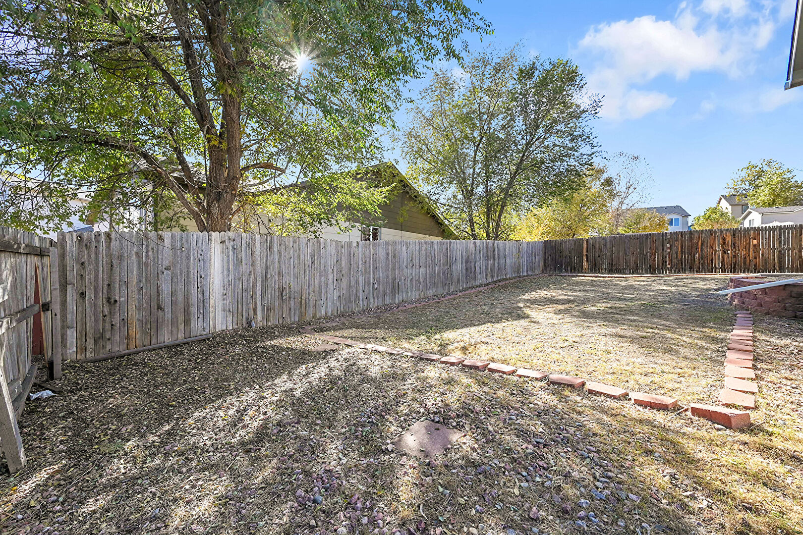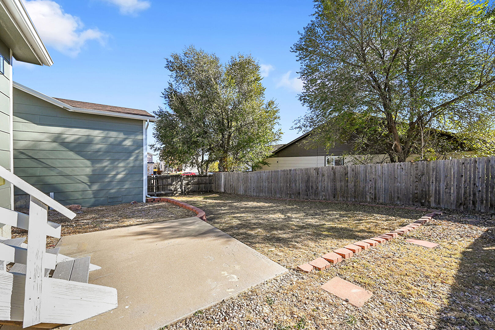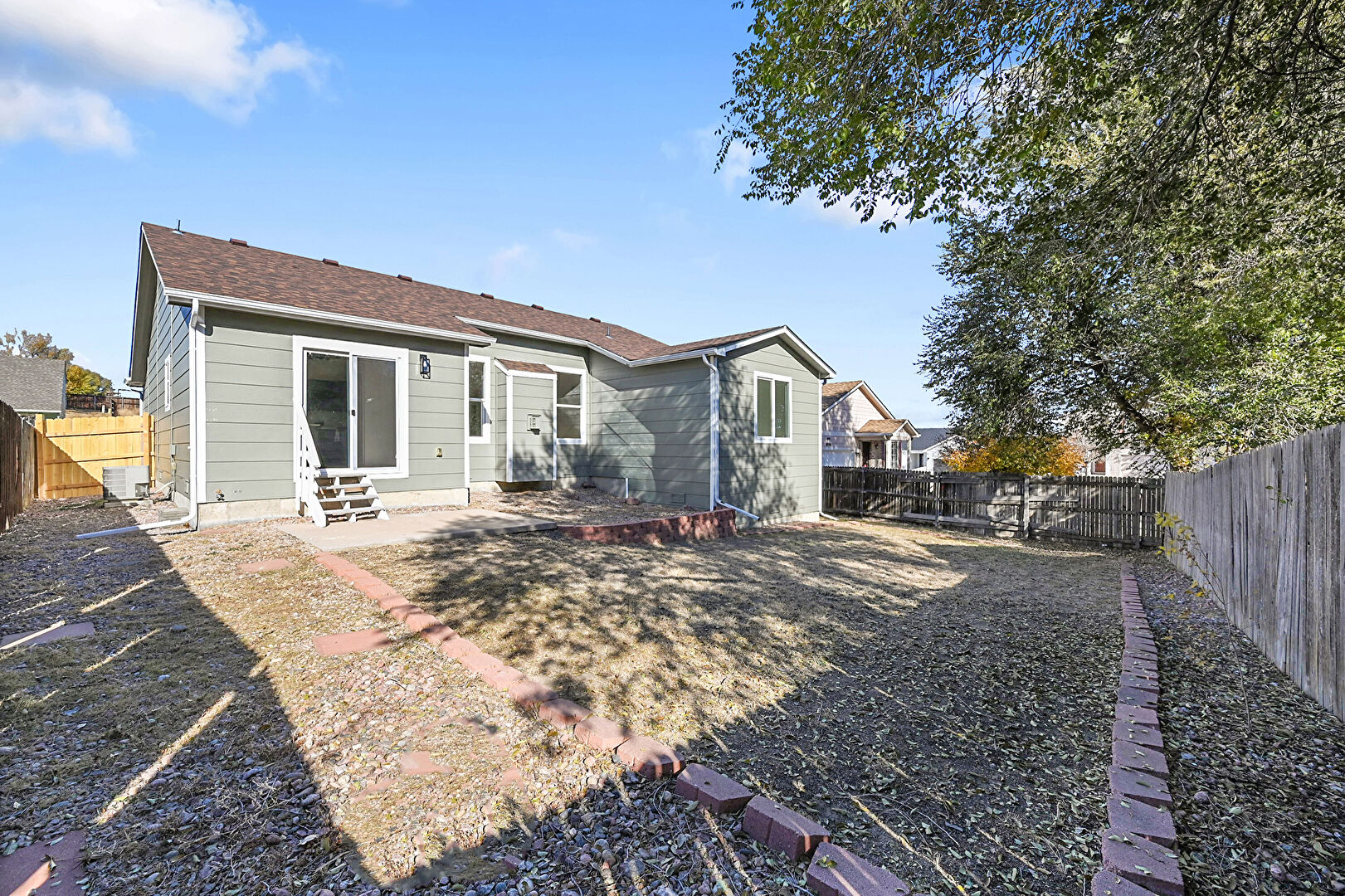 Concrete Foundation, Downspout, Fence, Gutters, Horizontal Siding, Lawn, Patio, Entry Steps, Fence, Residential View