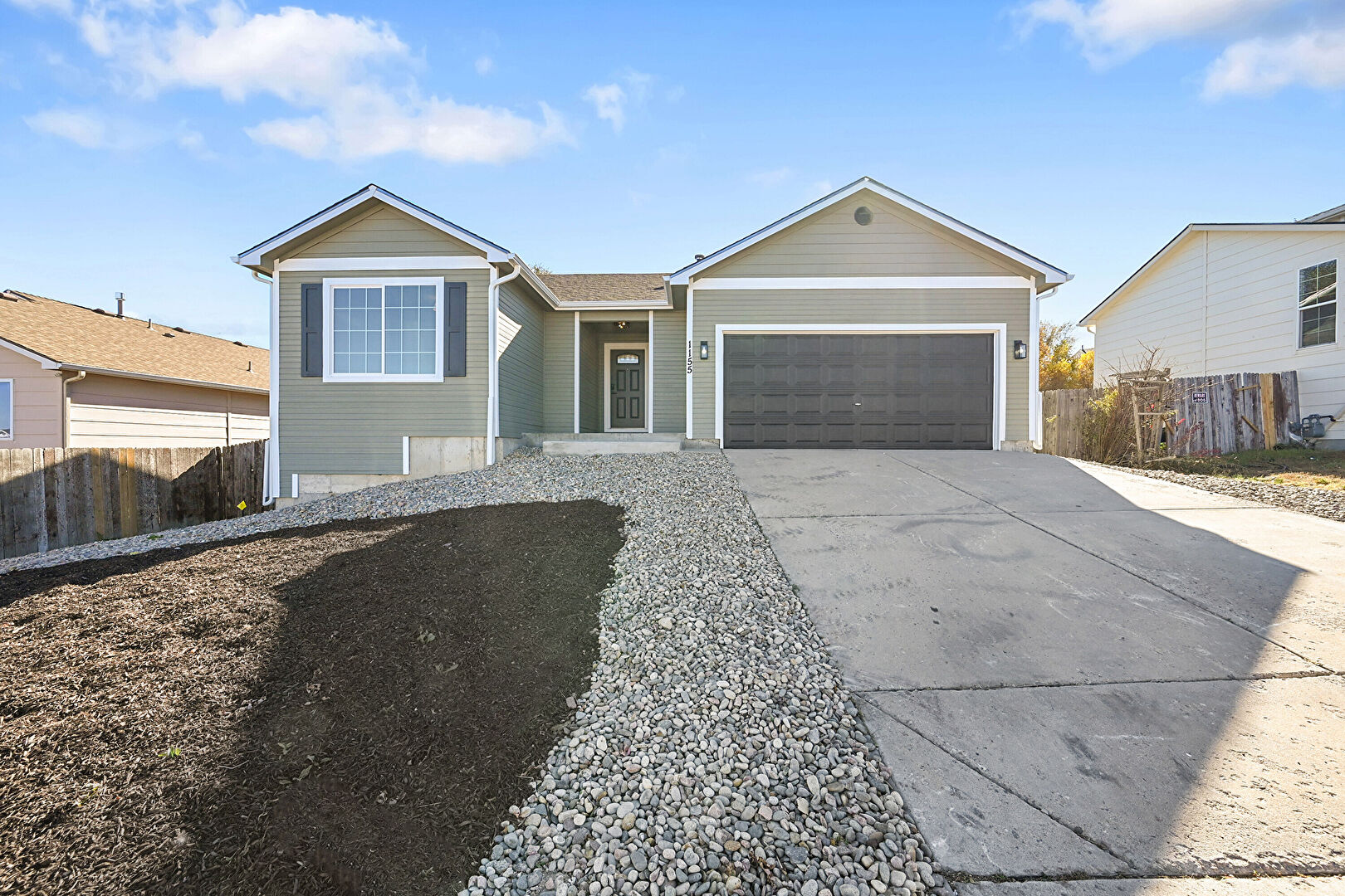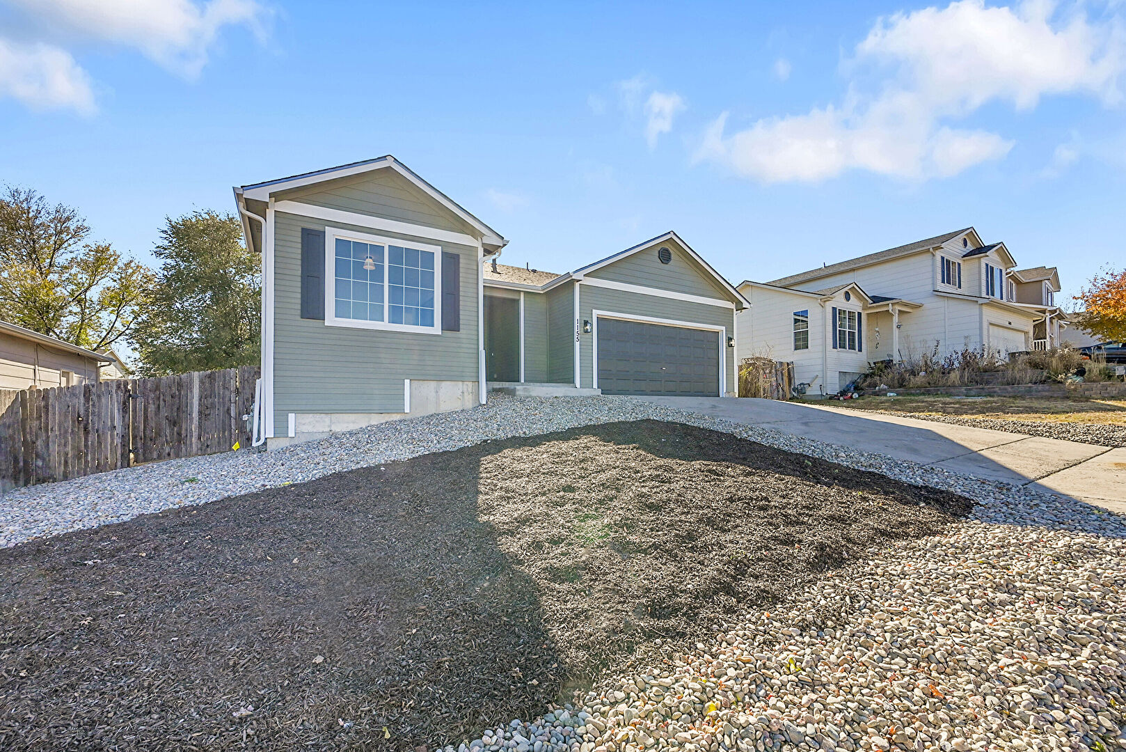 Concrete Foundation, Downspout, Garage, Gutters, Horizontal Siding, Stoop, Horizontal Siding, Porch