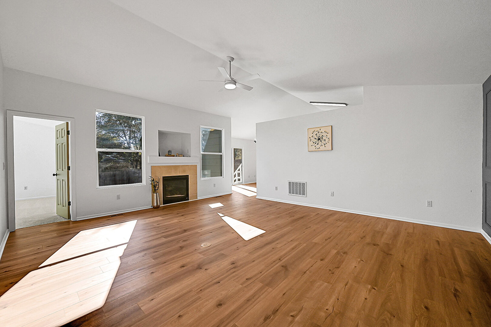 Baseboards Wall, Cathedral Ceiling, Ceiling Fan, Drywall, Fireplace, Natural Light, Vaulted Ceiling, Vent, Wood Finish Floor, Notable Chandelier, Vaulted Ceiling, Vent
