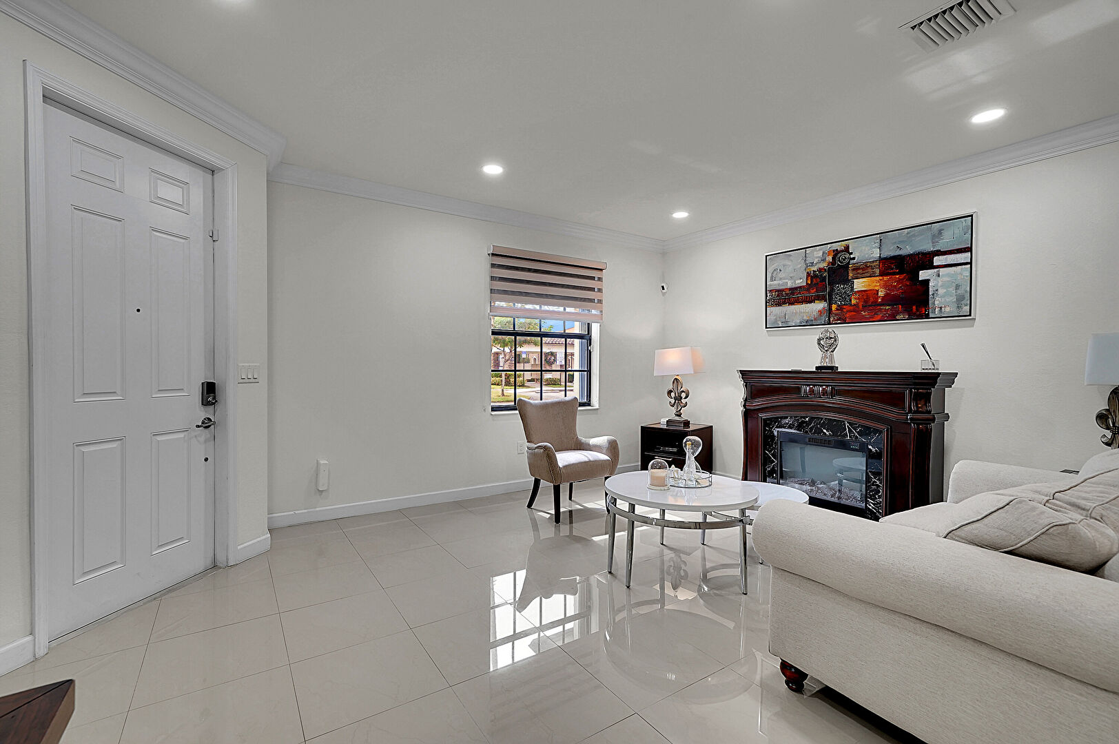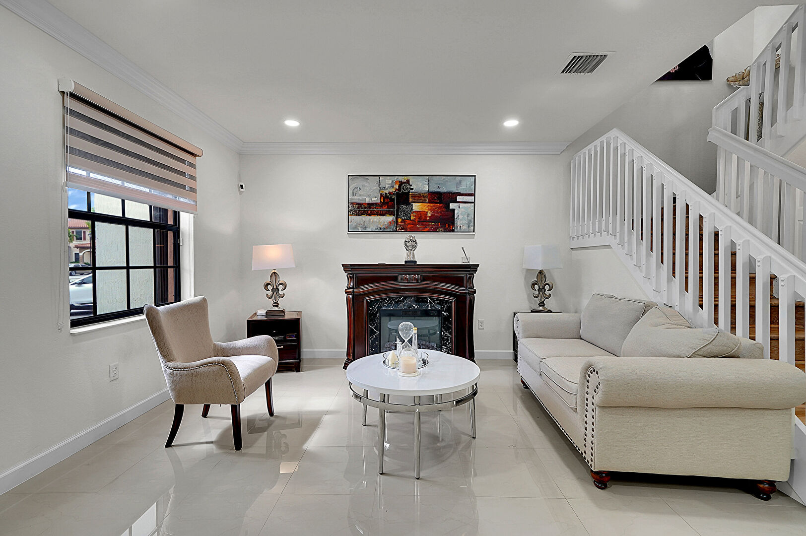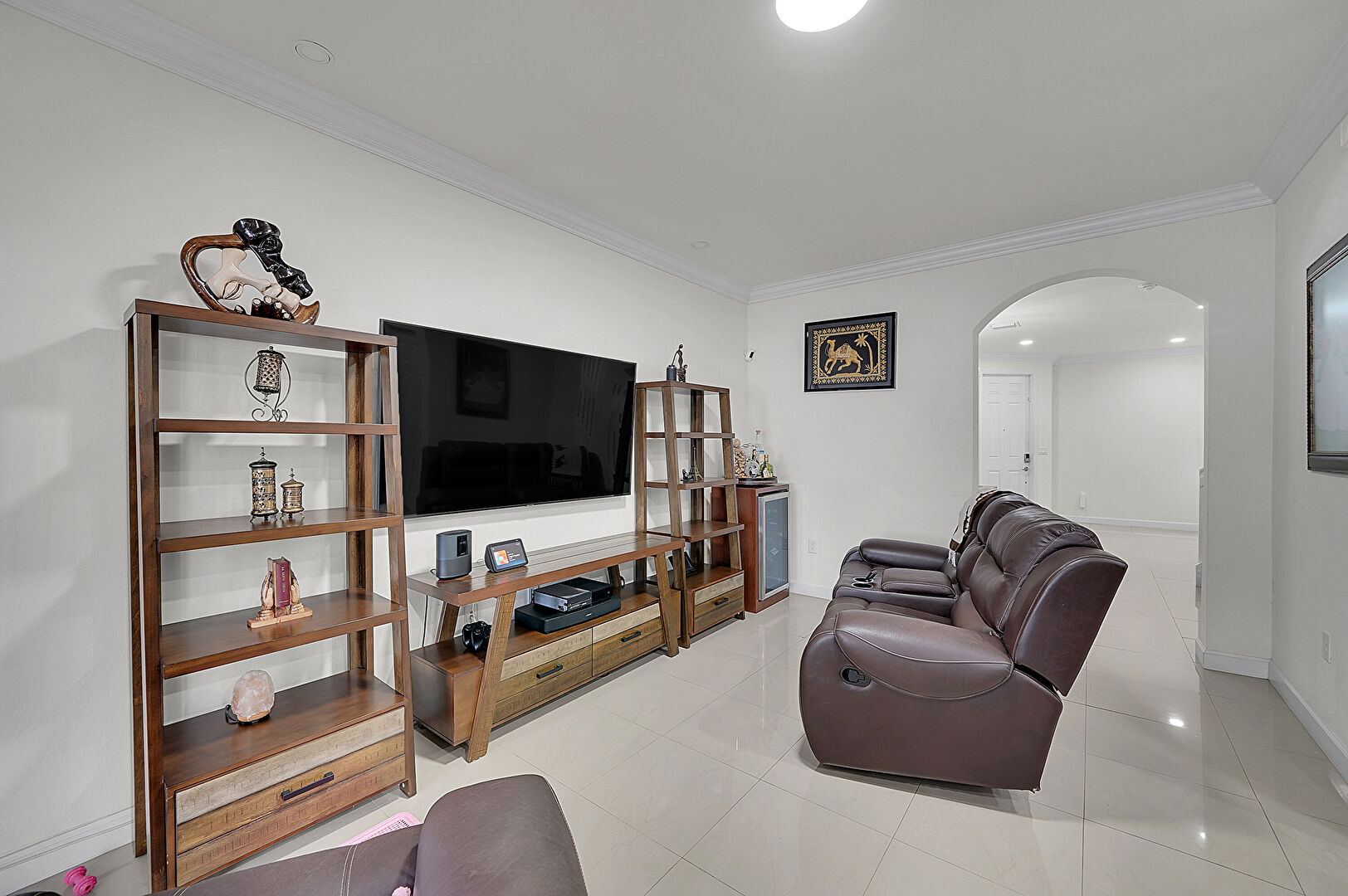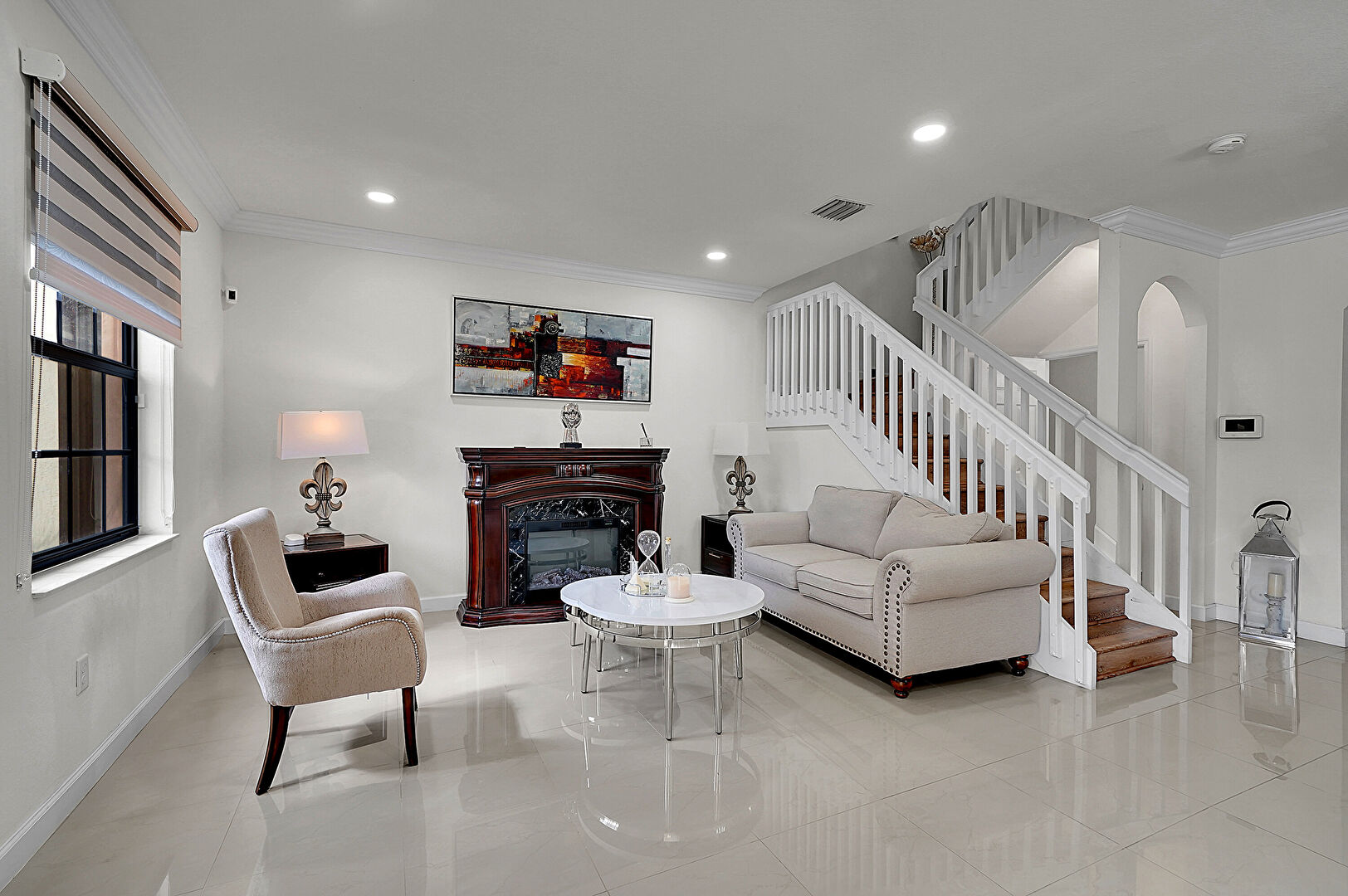 Arched Walkways, Baseboards Wall, Crown Molding, Drywall, Fireplace, Natural Light, Recessed Lighting, Stairs, Tile Floor, Vent, Baseboards Wall, Drywall, Natural Light