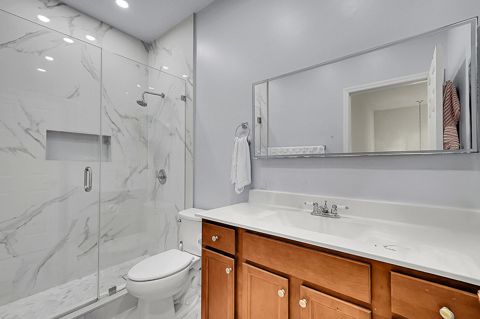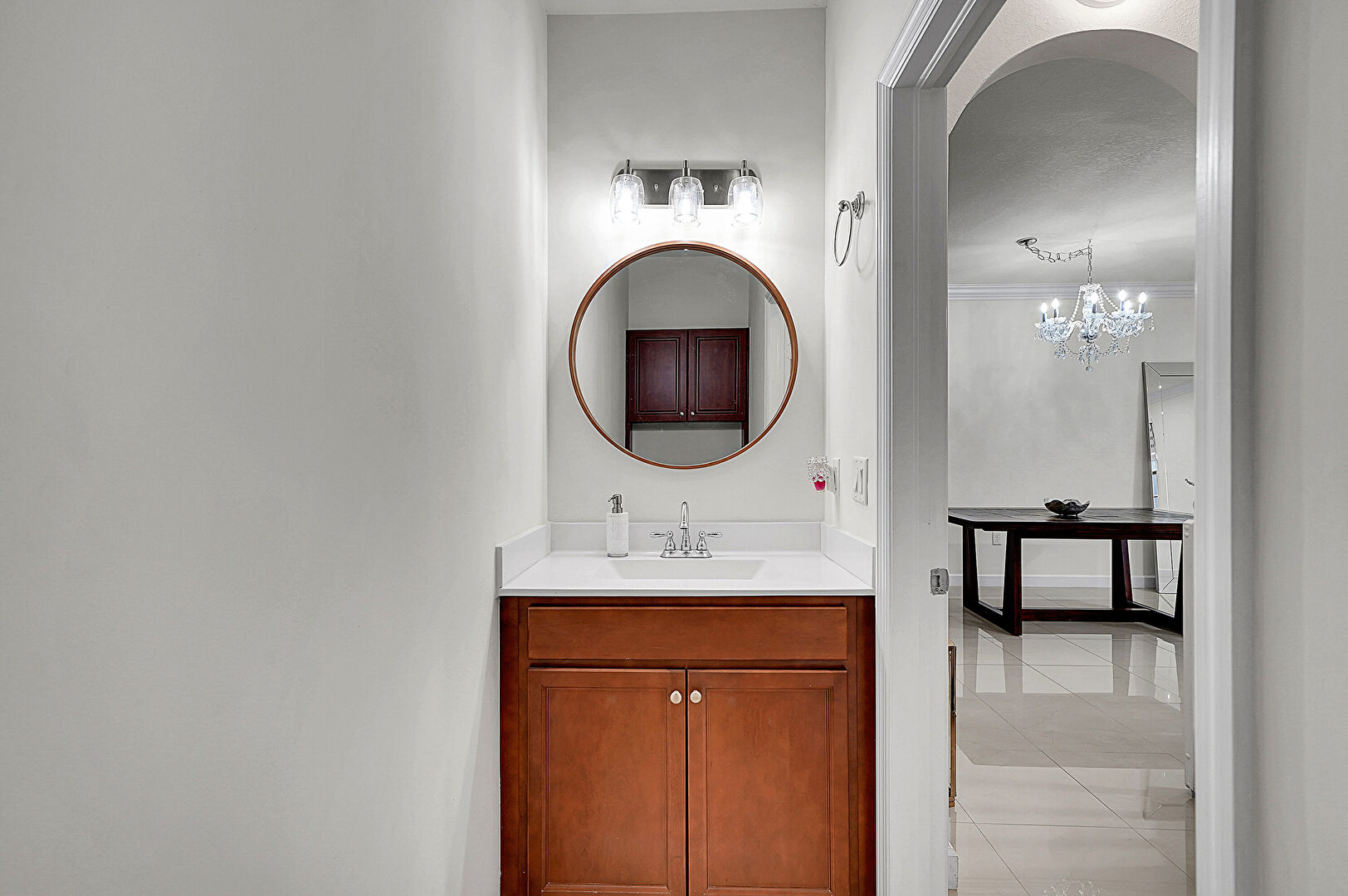 Drywall, Full Bathroom, Half Bathroom, Marble Finish Floor, Natural Light, Notable Chandelier, Recessed Lighting, Tile Floor, Vanity, Crown Molding, Full Bathroom, Tile Floor