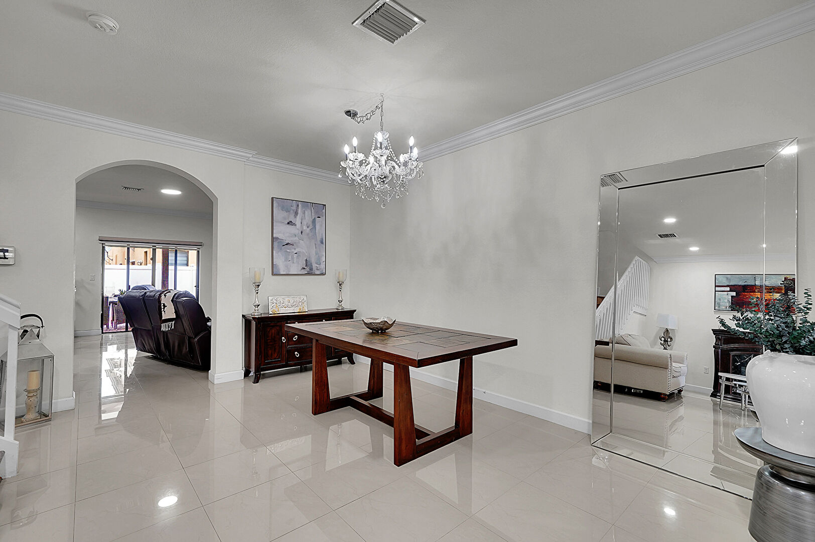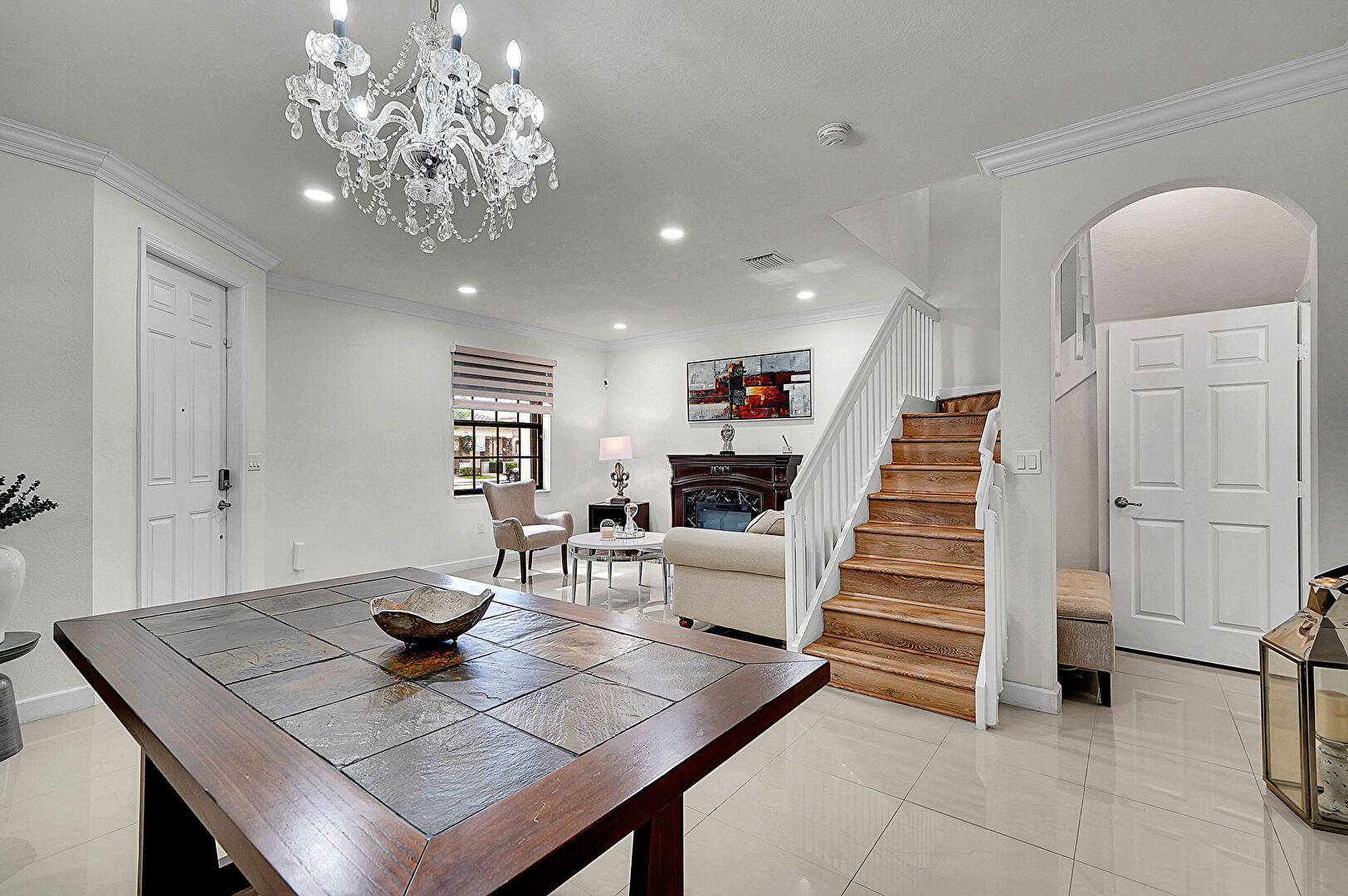 Arched Walkways, Baseboards Wall, Crown Molding, Drywall, Fireplace, Natural Light, Notable Chandelier, Recessed Lighting, Smoke Carbon Monoxide Detector, Stairs, Tile Floor, Vent, Baseboards Wall, Recessed Lighting