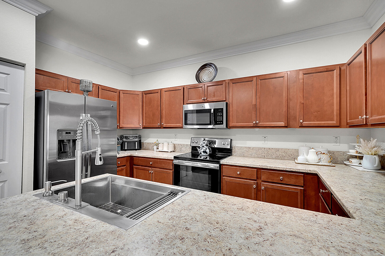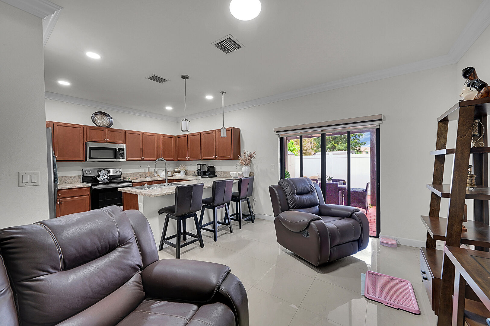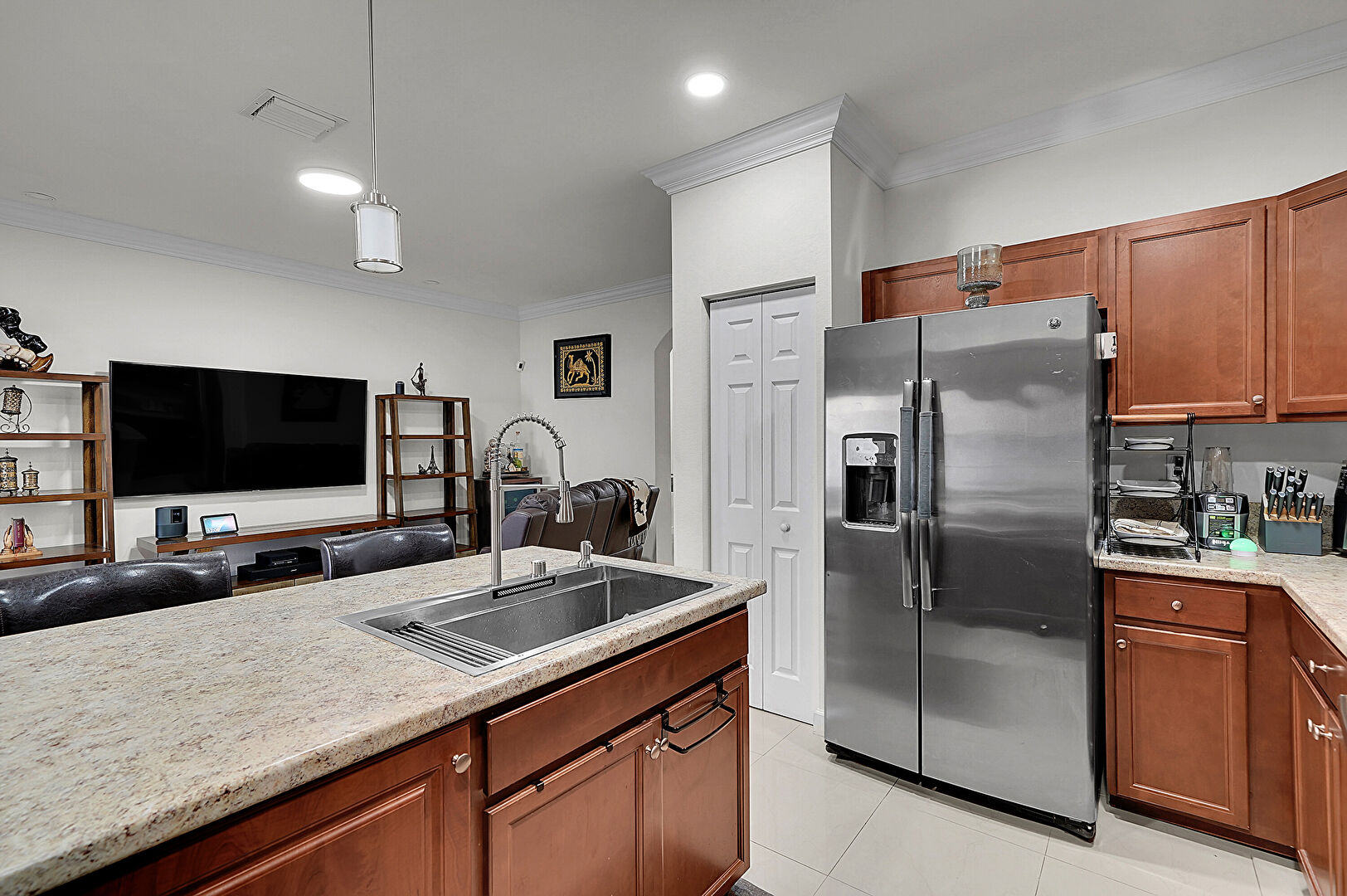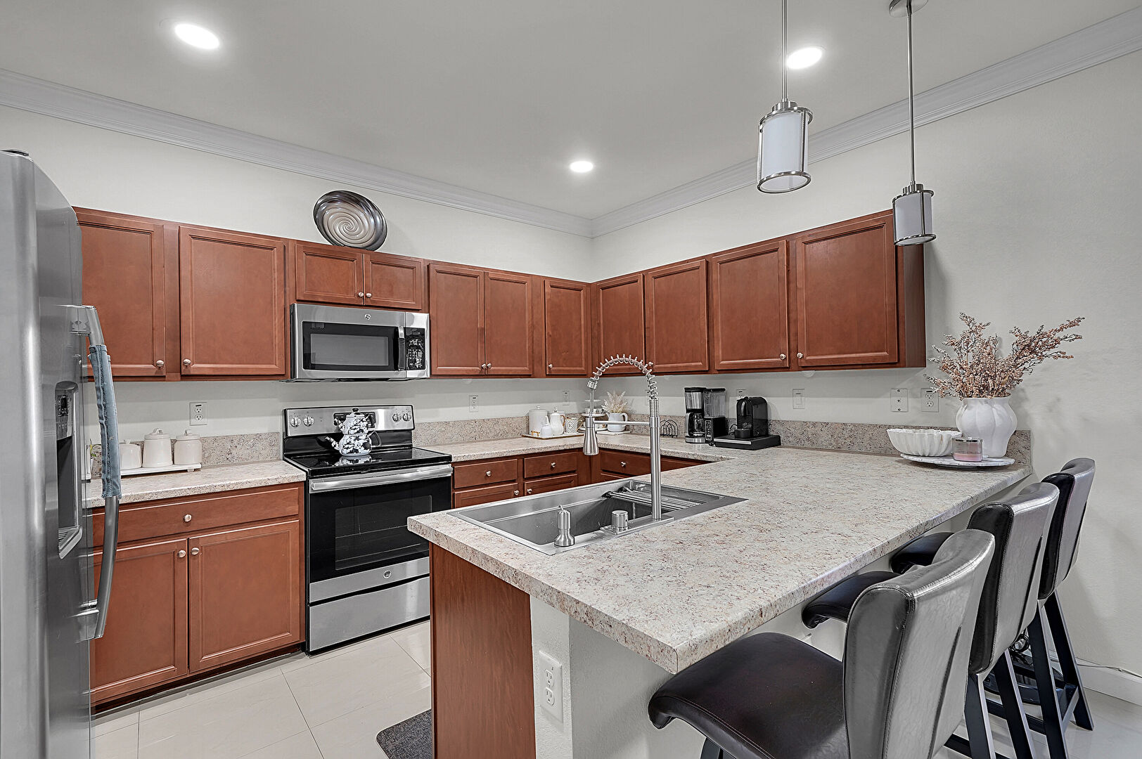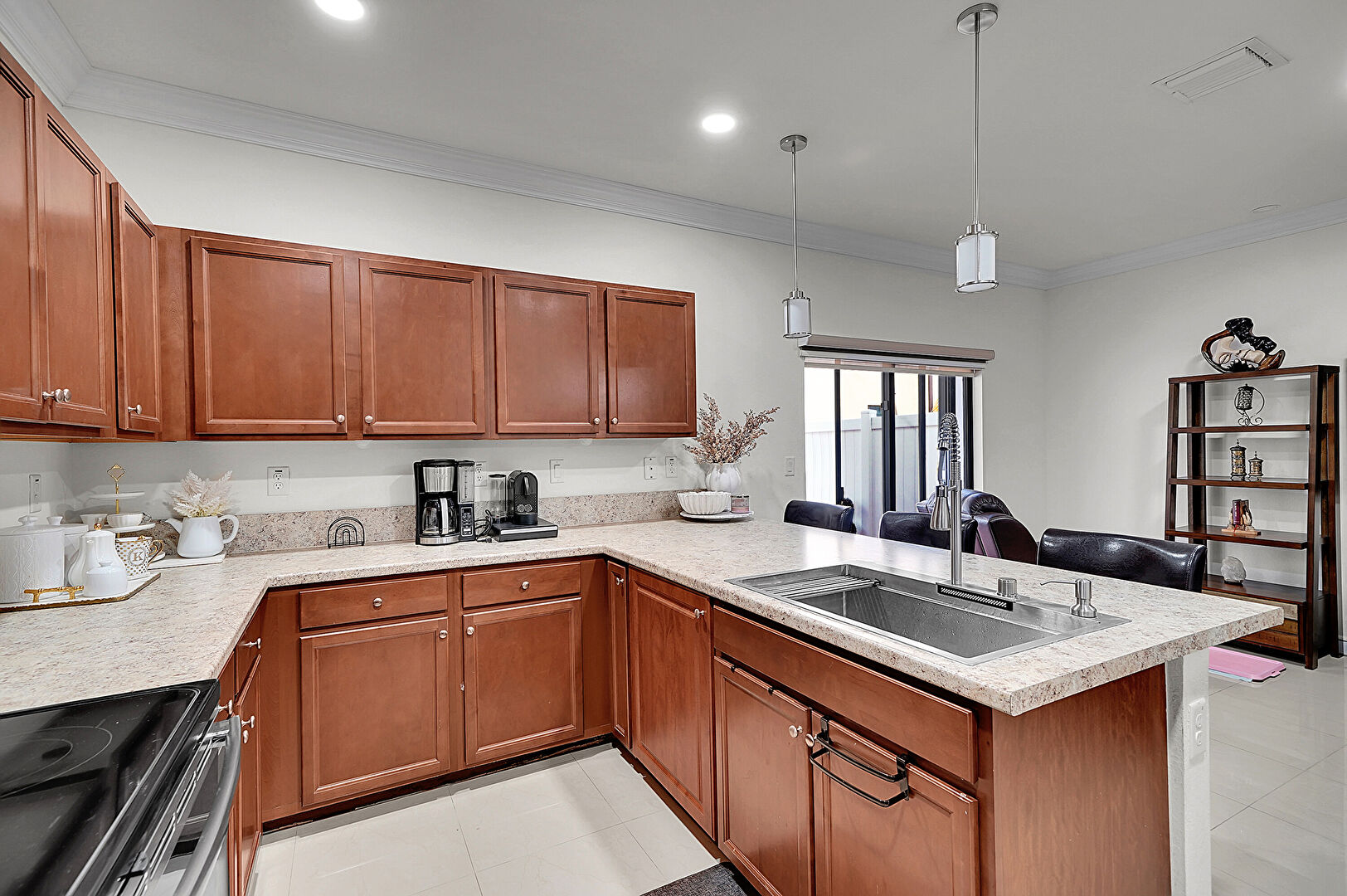 Crown Molding, Drywall, G Shaped Kitchen, Kitchen Bar, Kitchen Peninsula, Medium Brown Cabinets, Natural Light, Opens To Living Area, Pendant Lighting, Recessed Lighting, Shaker Cabinets, Stone Countertops, Tile Floor, Vent, Crown Molding, Kitchen Bar, Shaker Cabinets