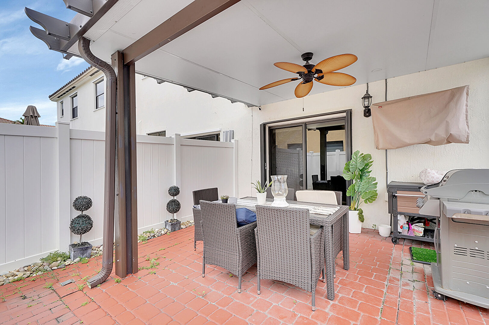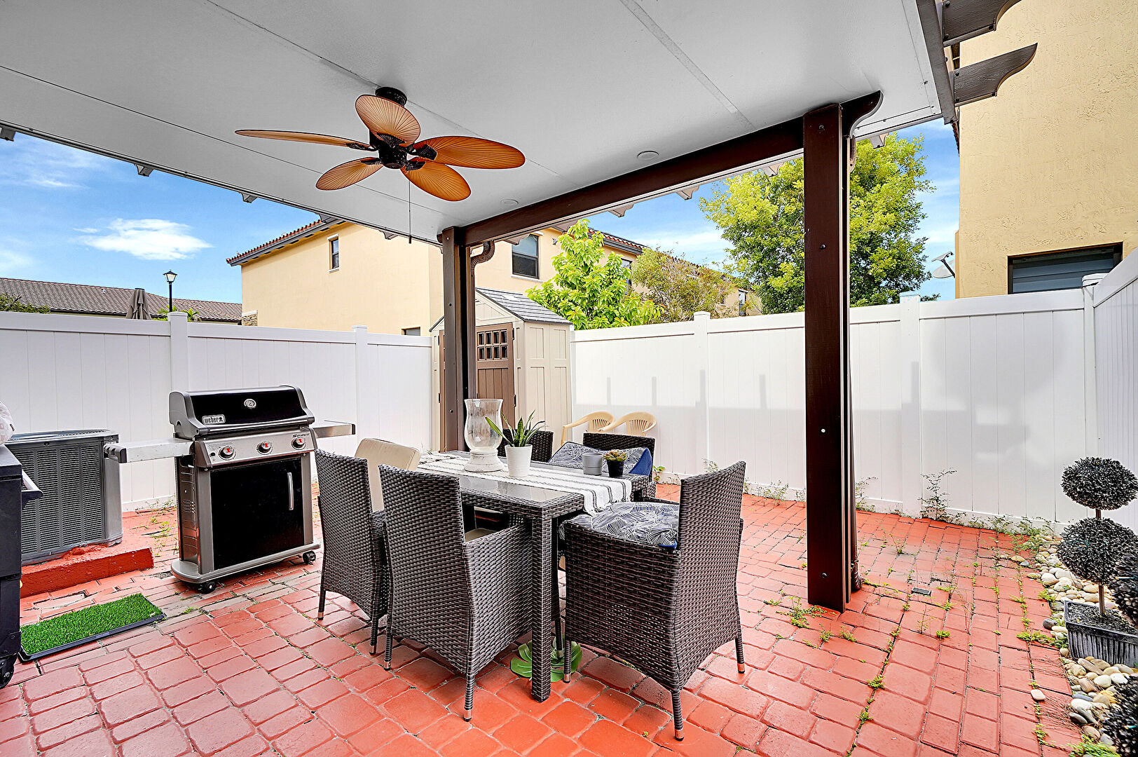 Ceiling Fan, Fence, Grill, Outdoor Dining Area, Patio, Satellite Dish, Shed, Outdoor Dining Area, Outdoor Structure