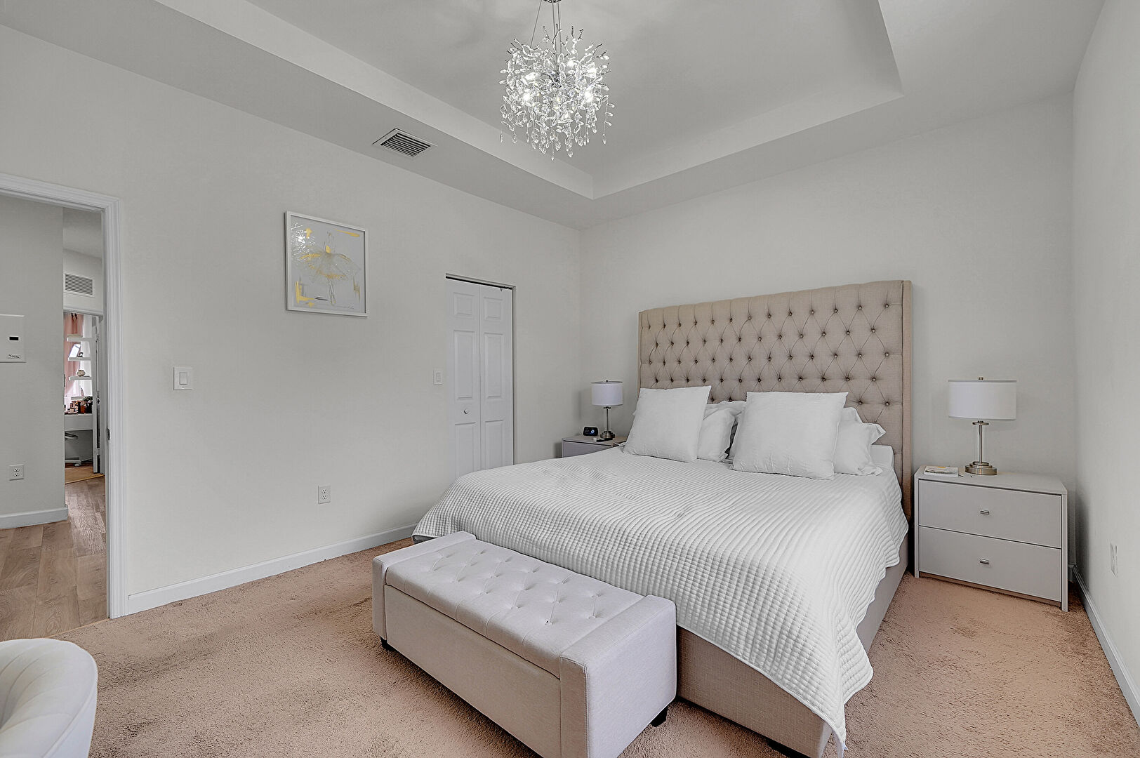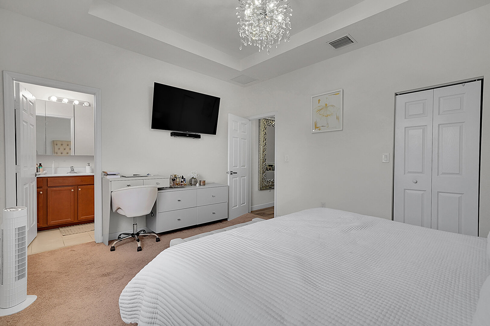 Baseboards Wall, Carpet, Closet, Dehumidifier, Drywall, Ensuite Bathroom, Natural Light, Notable Chandelier, Office Area, Tray Ceiling, Vent, Carpet, Tray Ceiling, Vent