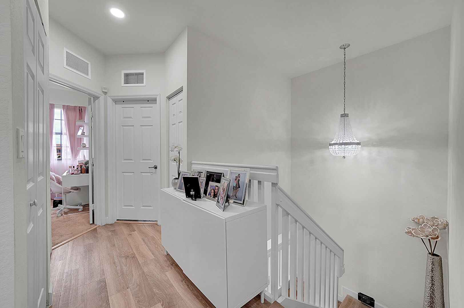 Baseboards Wall, Drywall, Recessed Lighting, Upstairs Landing, Vent, Wood Finish Floor, Natural Light