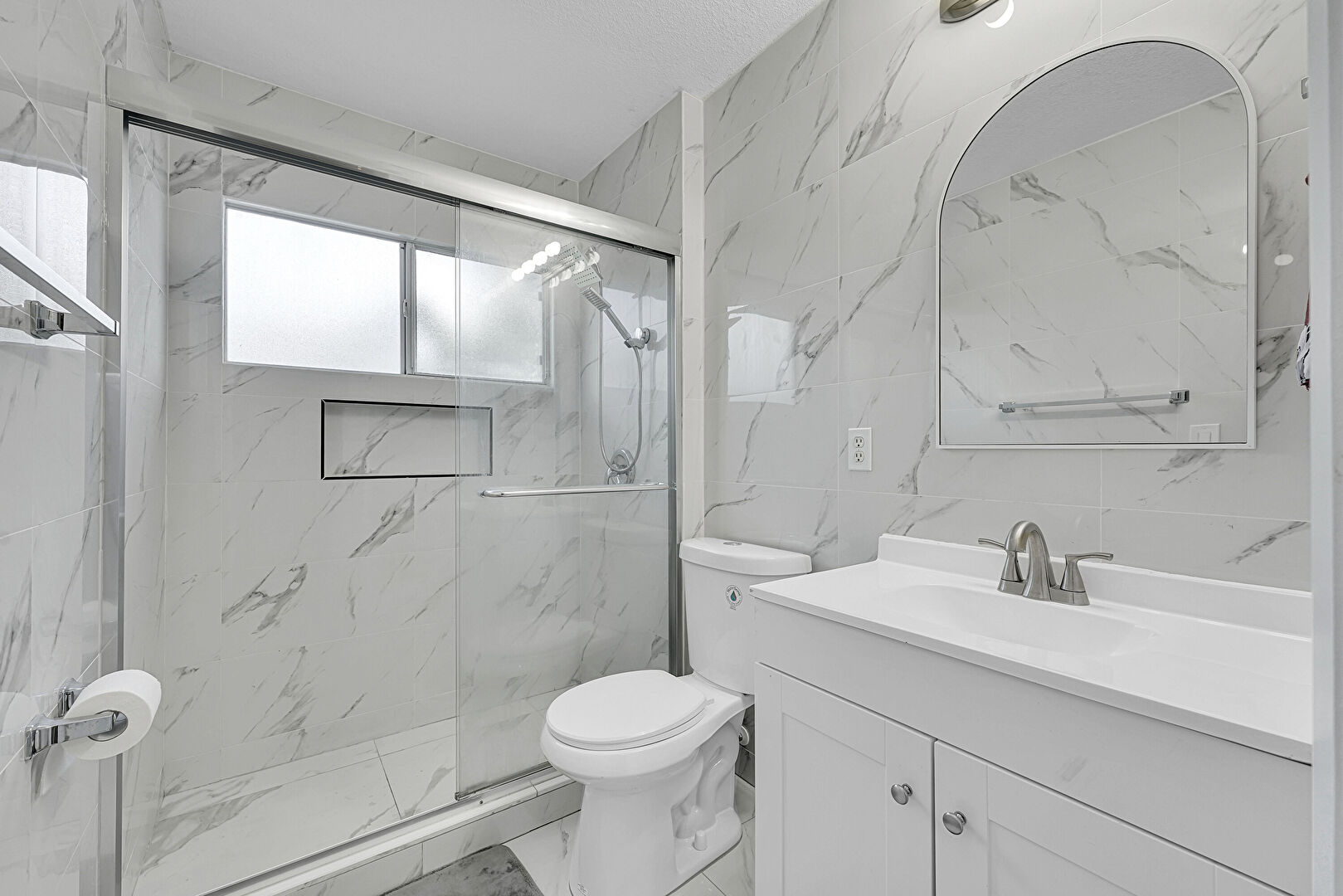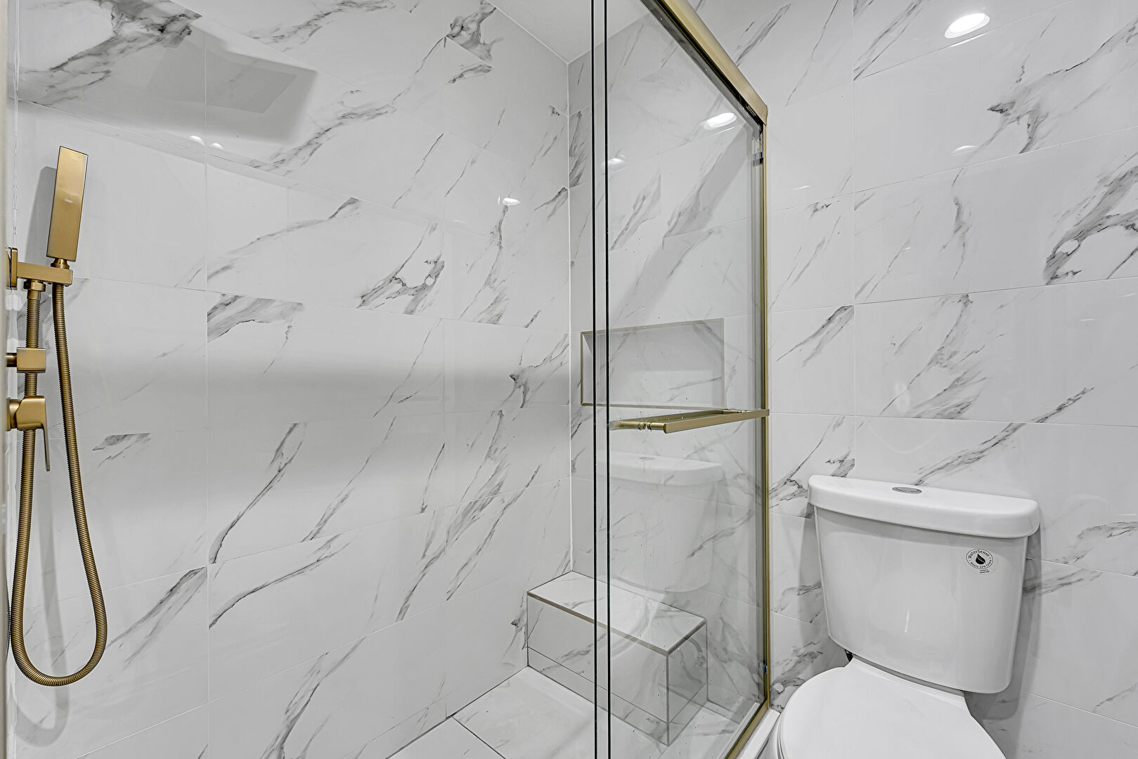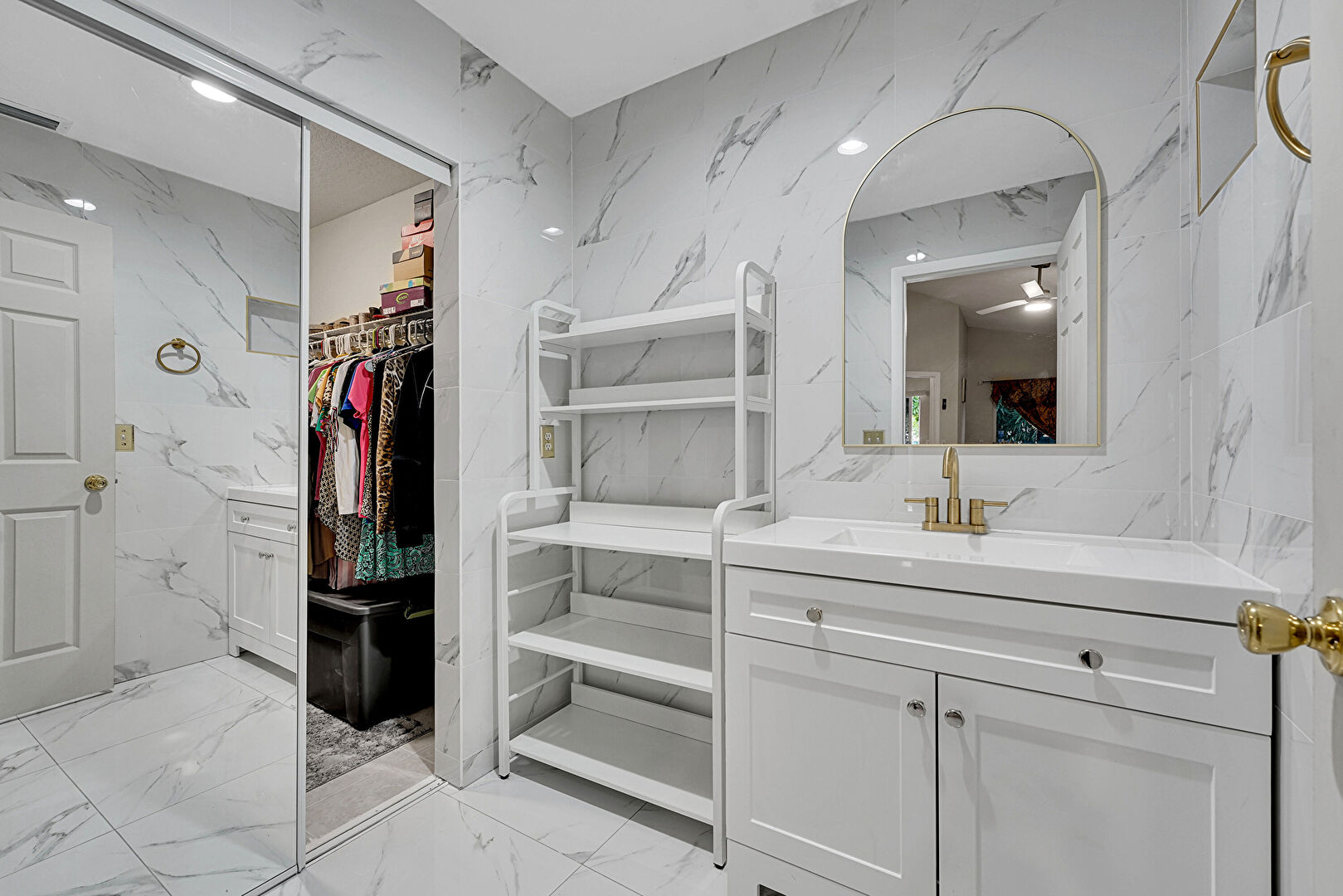 Baseboards Wall, Drywall, Ensuite Bathroom, Full Bathroom, Marble Finish Floor, Marble Wall, Natural Light, Recessed Lighting, Tile Floor, Tile Wall, Vanity, Vent, Walk In Closet, Full Bathroom, Marble Finish Floor, Natural Light, Vanity