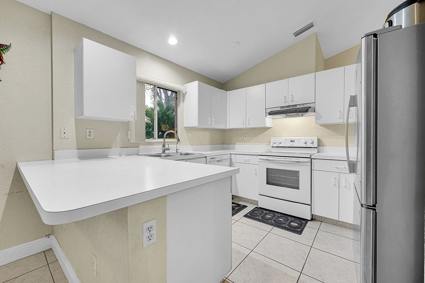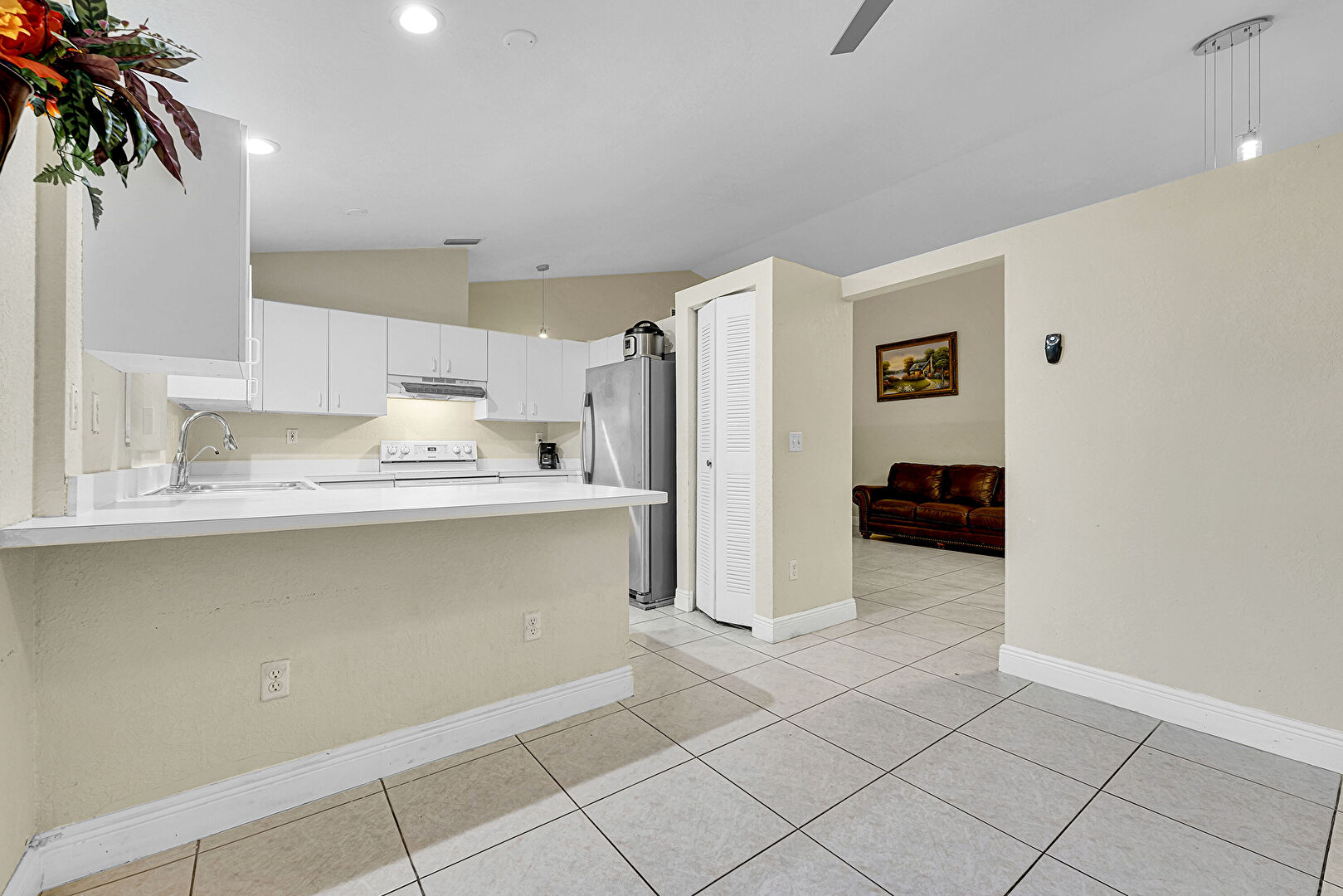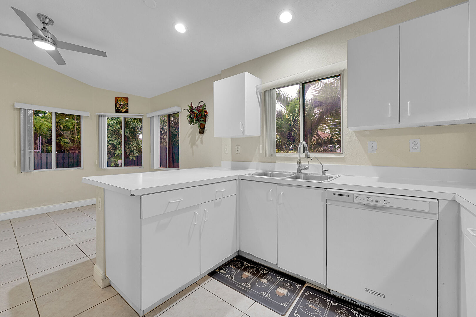 Baseboards Wall, Ceiling Fan, Drywall, Flat Panel Cabinets, G Shaped Kitchen, Kitchen Bar, Kitchen Peninsula, Natural Light, Pendant Lighting, Recessed Lighting, Textured Wall, Tile Floor, Vaulted Ceiling, Vent, Baseboards Wall, Ceiling Fan, Drywall, Kitchen Peninsula, Natural Light, Tile Floor