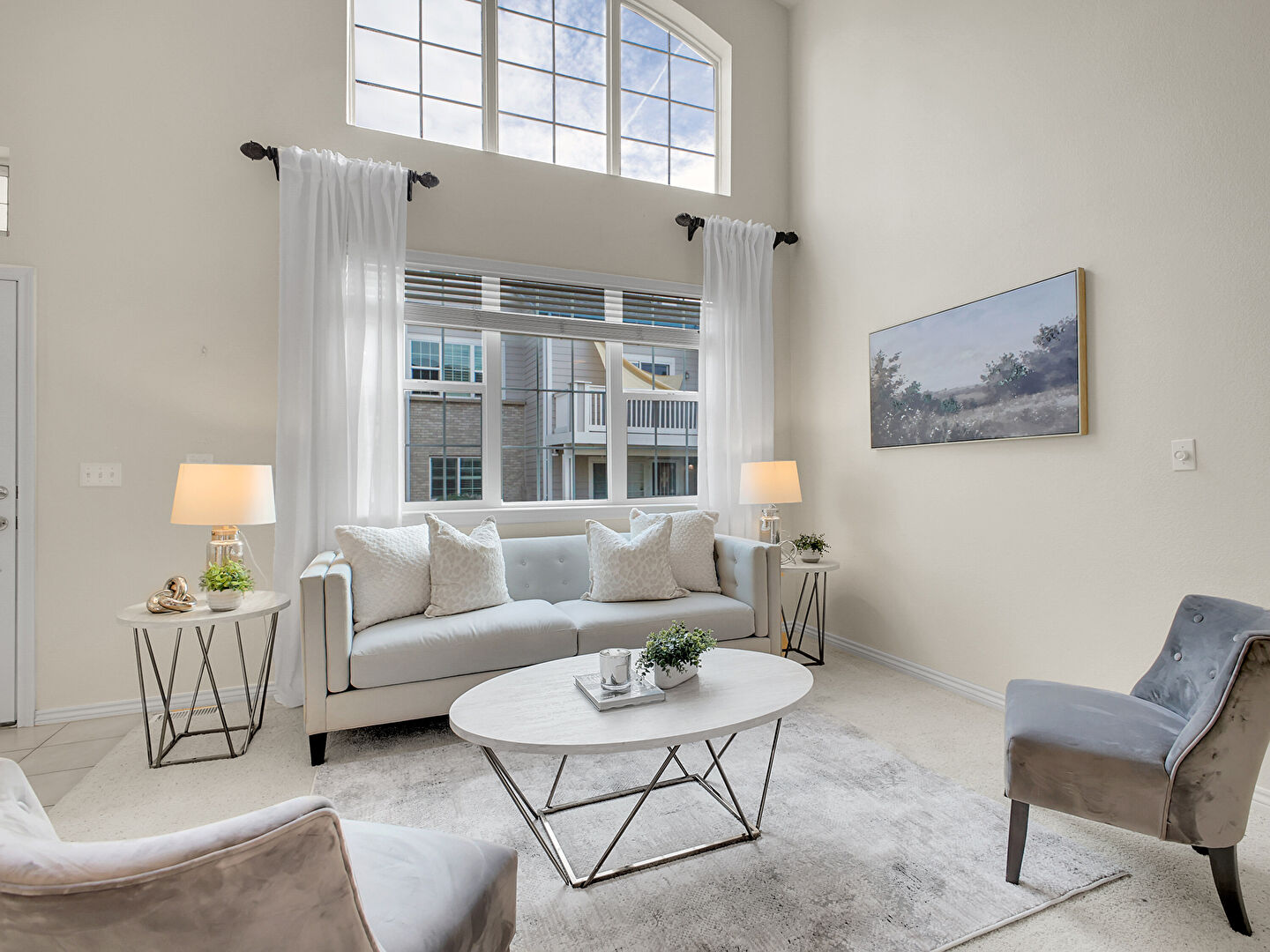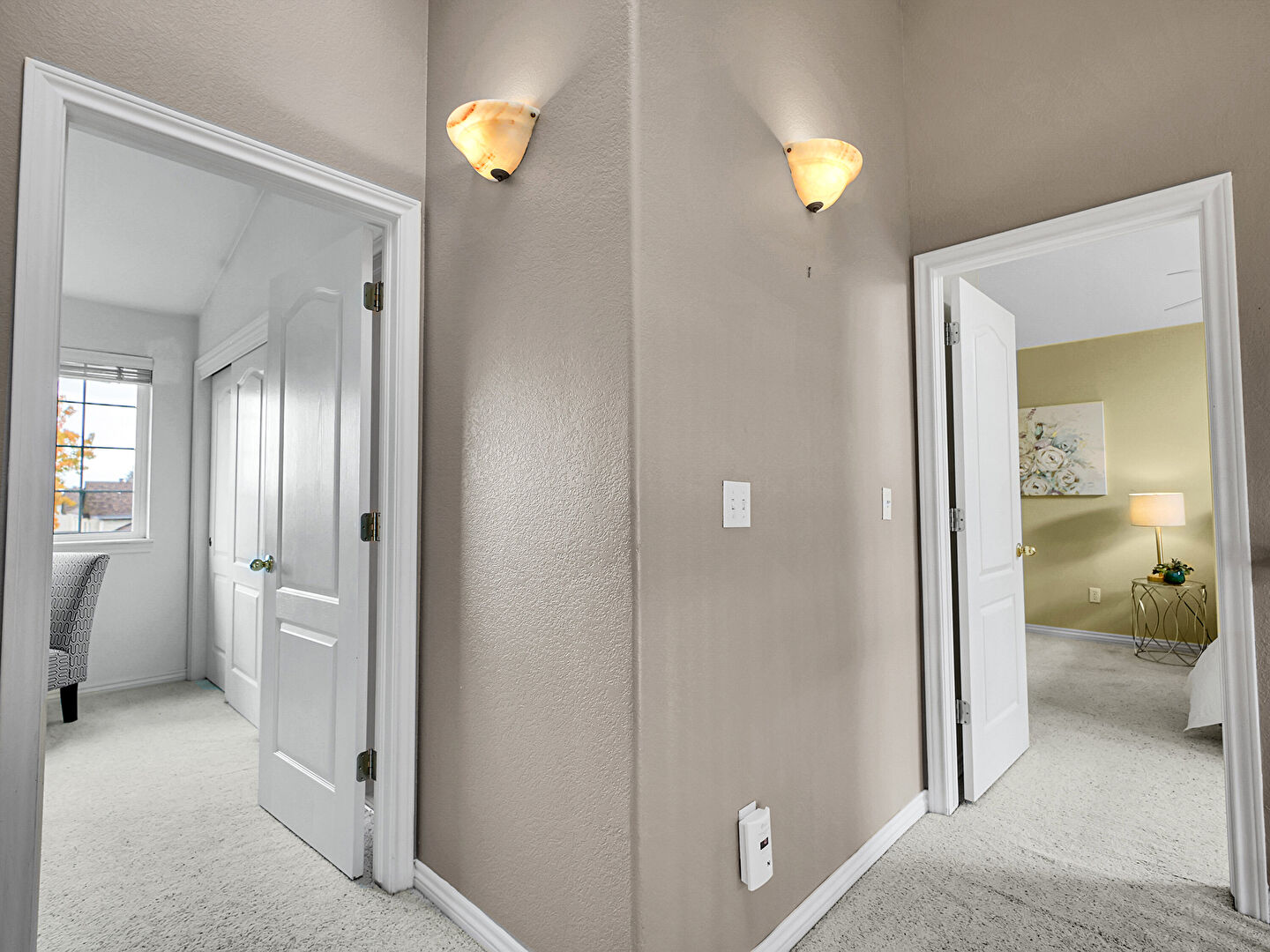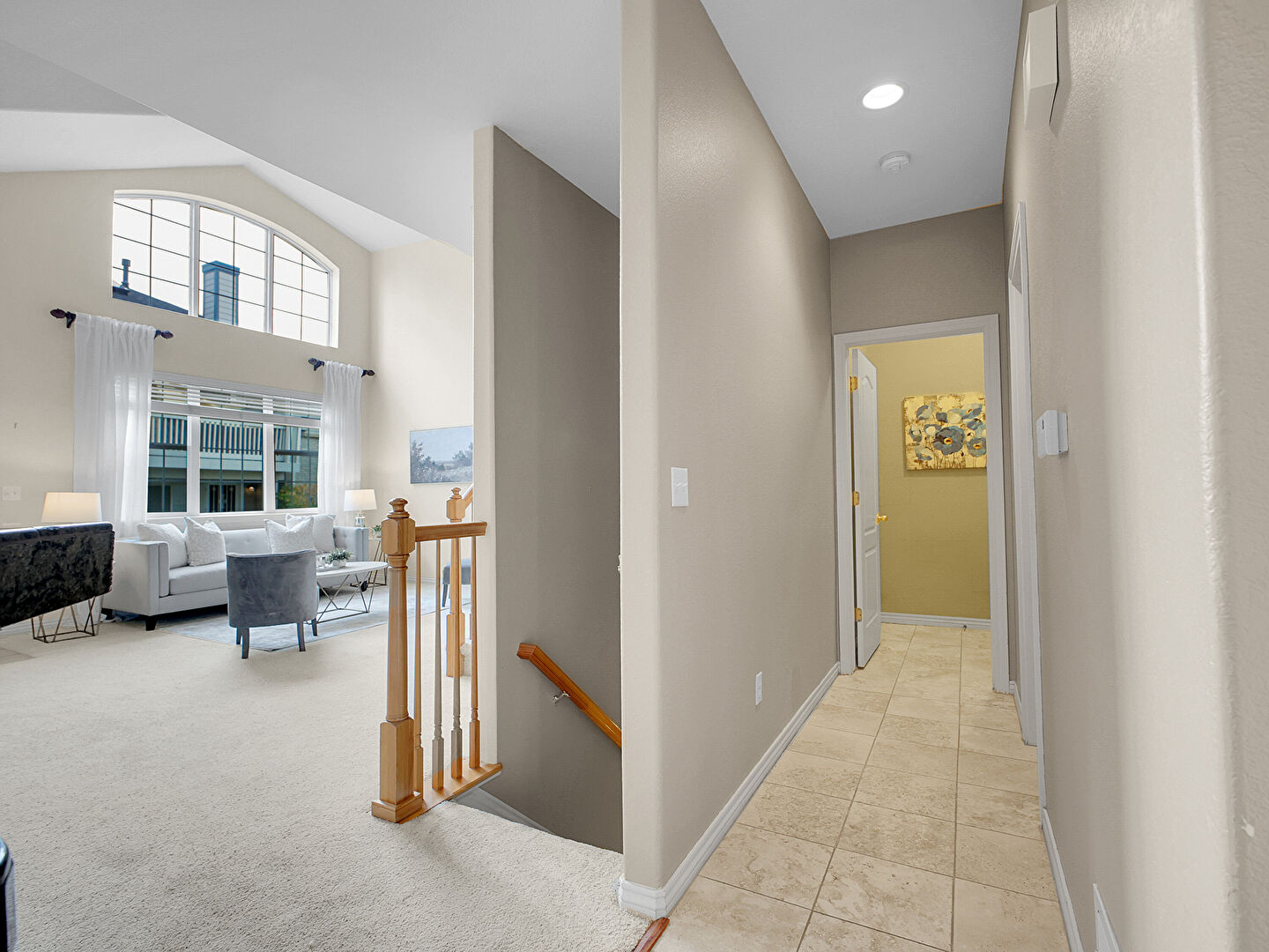 Baseboards Wall, Carpet, Drywall, High Ceiling, Natural Light, Recessed Lighting, Textured Wall, Tile Floor, Upstairs Landing, Vaulted Ceiling, Carpet, Natural Light
