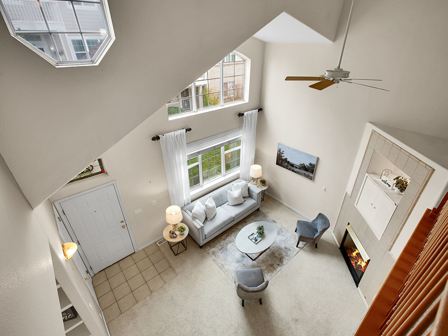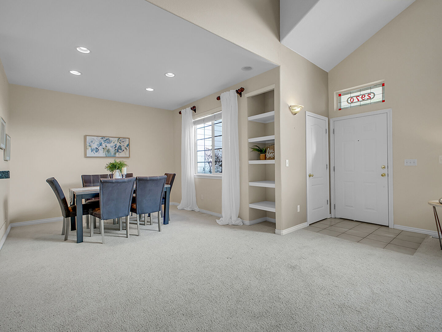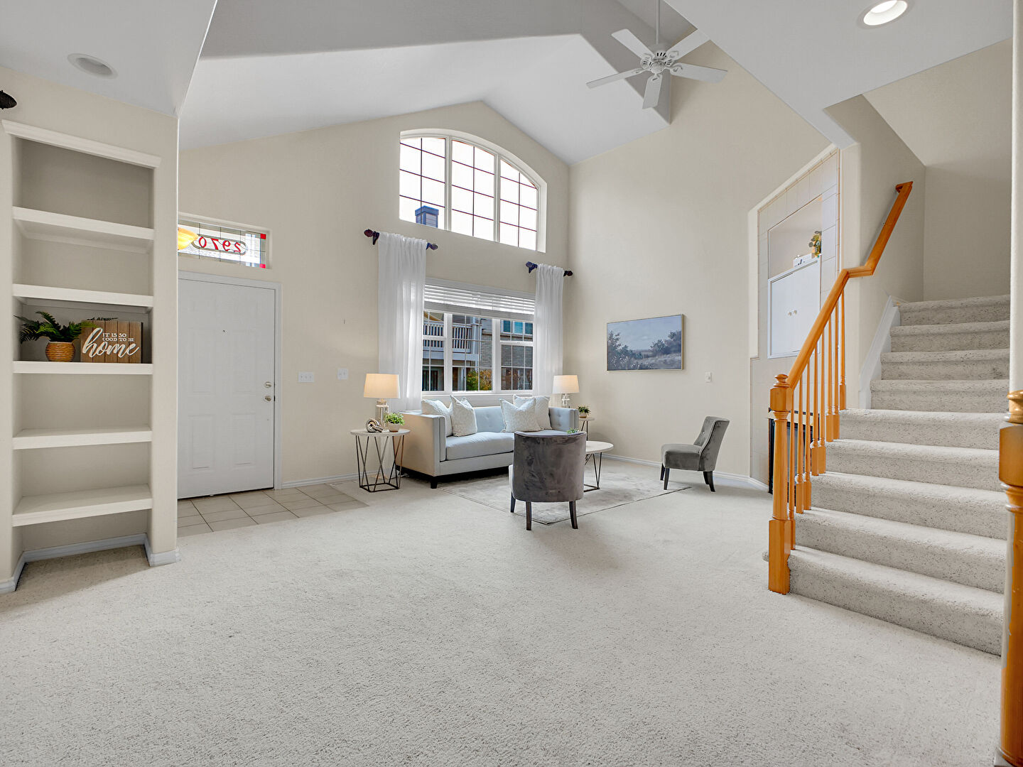 Baseboards Wall, Built In Shelves, Carpet, Cathedral Ceiling, Ceiling Fan, Drywall, Fireplace, G Shaped Kitchen, High Ceiling, Natural Light, Recessed Lighting, Stairs, Tile Floor, Vaulted Ceiling, Vent, Carpet, Cathedral Ceiling, Natural Light, Stairs