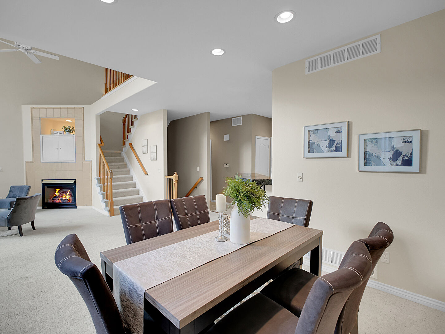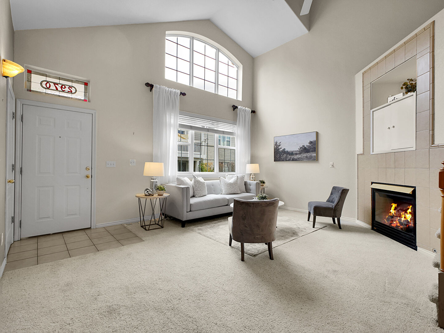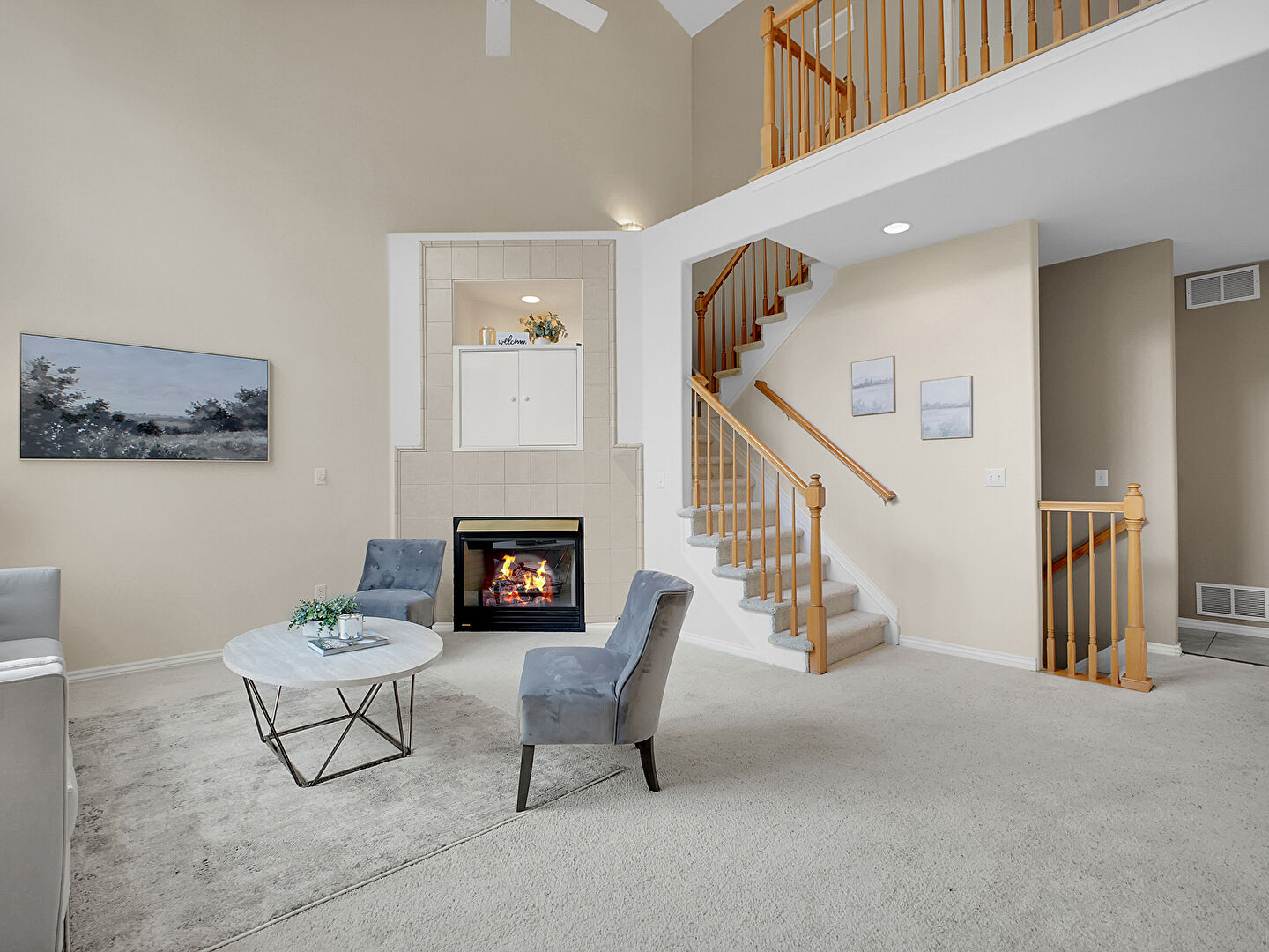 Baseboards Wall, Carpet, Drywall, Fireplace, High Ceiling, Recessed Lighting, Vaulted Ceiling, Vent, Stairs