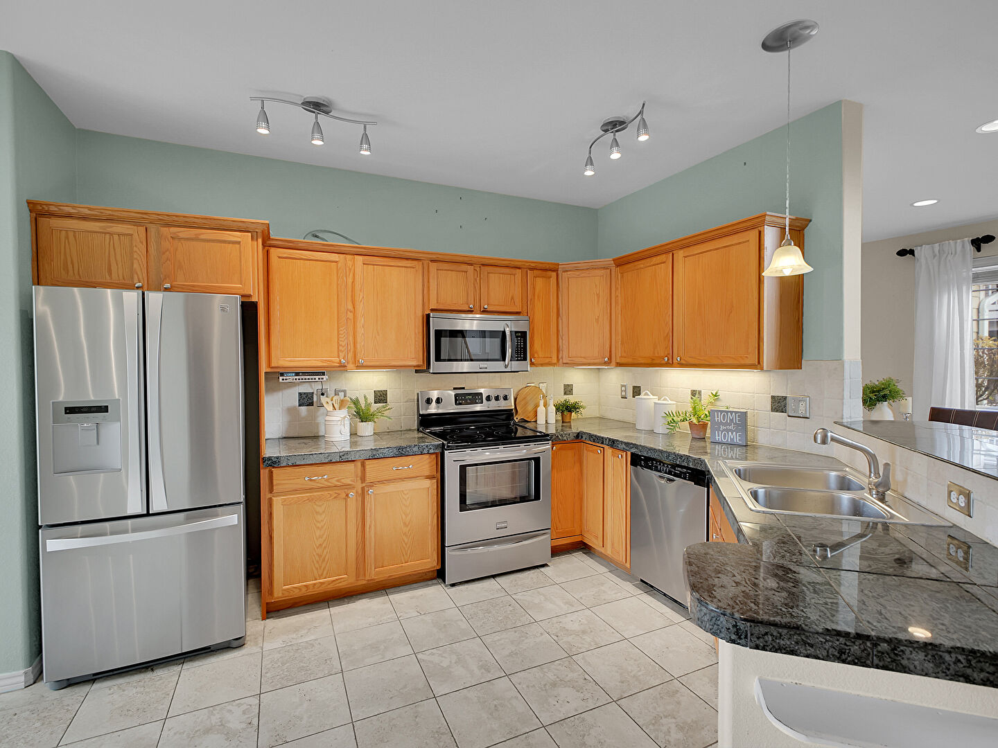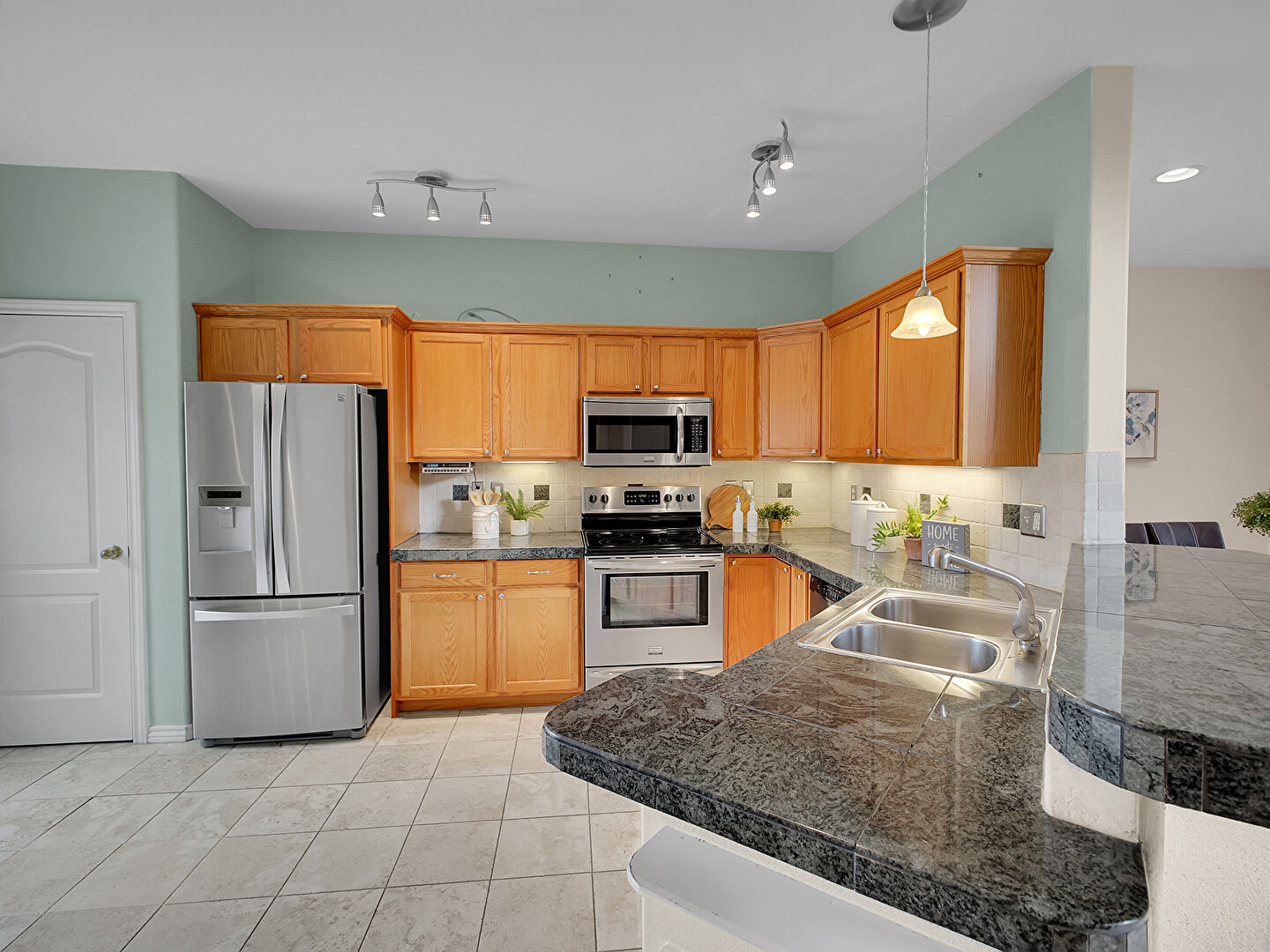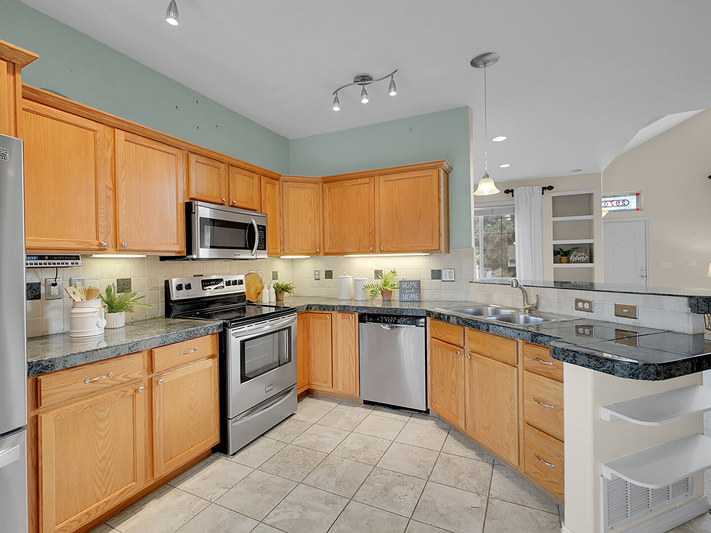 Crown Molding Cabinets, Drywall, High Ceiling, Kitchen Bar, Kitchen Peninsula, Medium Brown Cabinets, Natural Light, Open Shelves, Pendant Lighting, Recessed Lighting, Shaker Cabinets, Stone Tile Countertops, Tile Floor, Track Lighting, U Shaped Kitchen, Vent, Baseboards Wall, Kitchen Peninsula, Pendant Lighting, Recessed Lighting, Shaker Cabinets, U Shaped Kitchen