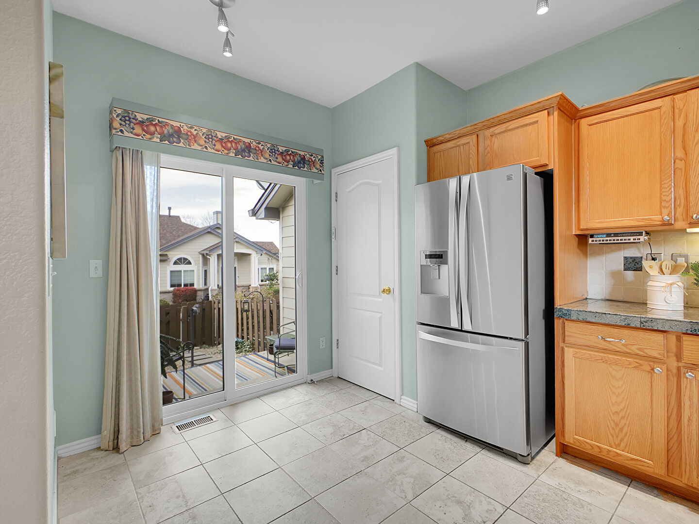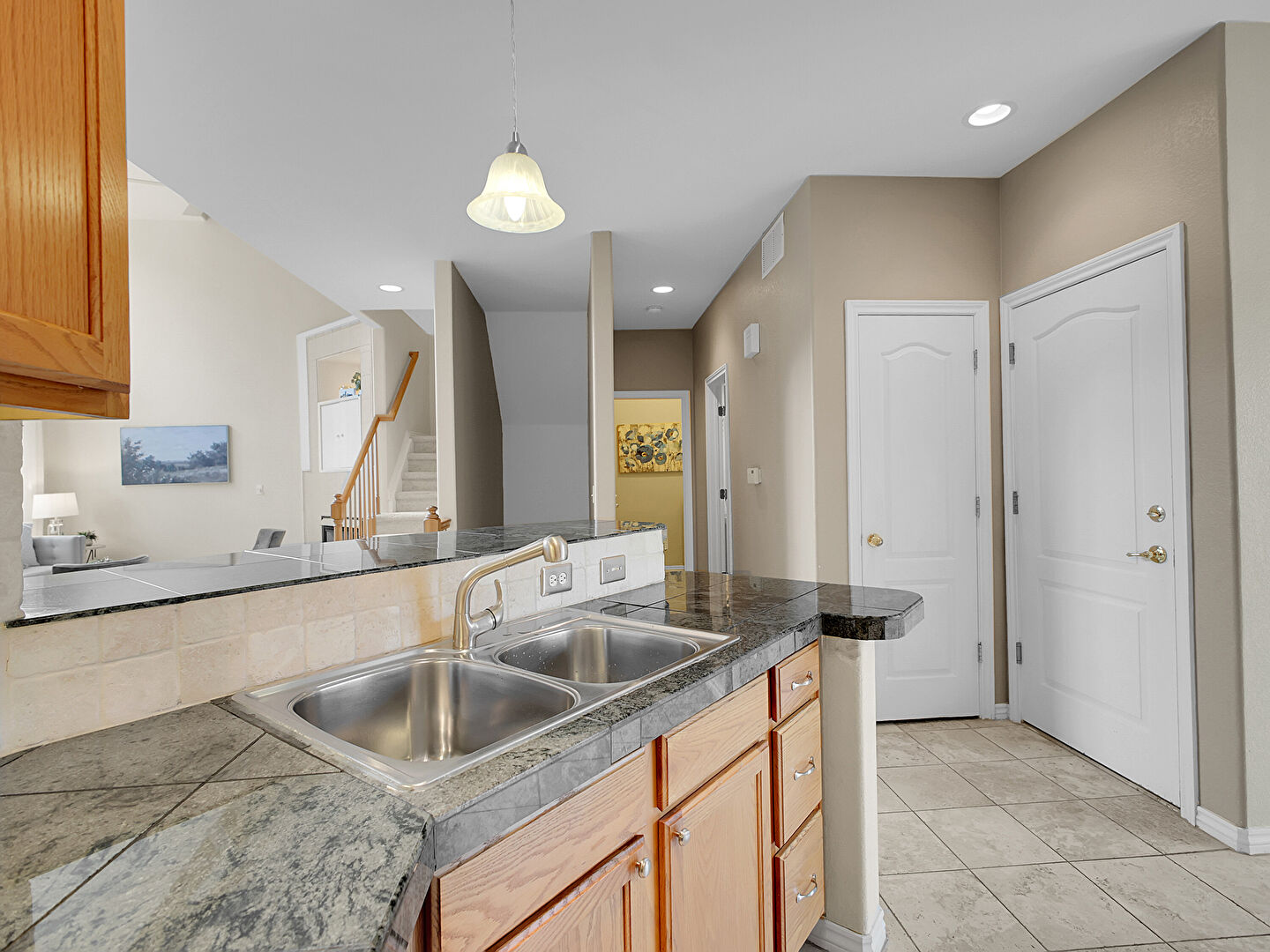 Baseboards Wall, Built In Shelves, Carpet, Ceiling Fan, Drywall, Fireplace, Medium Brown Cabinets, Natural Light, Recessed Lighting, Shaker Cabinets, Stairs, Stone Tile Countertops, Tile Floor, Track Lighting, Vaulted Ceiling, Vent, Baseboards Wall, Crown Molding Cabinets, Drywall, Natural Light, Recessed Lighting, Sunroom, Vaulted Ceiling
