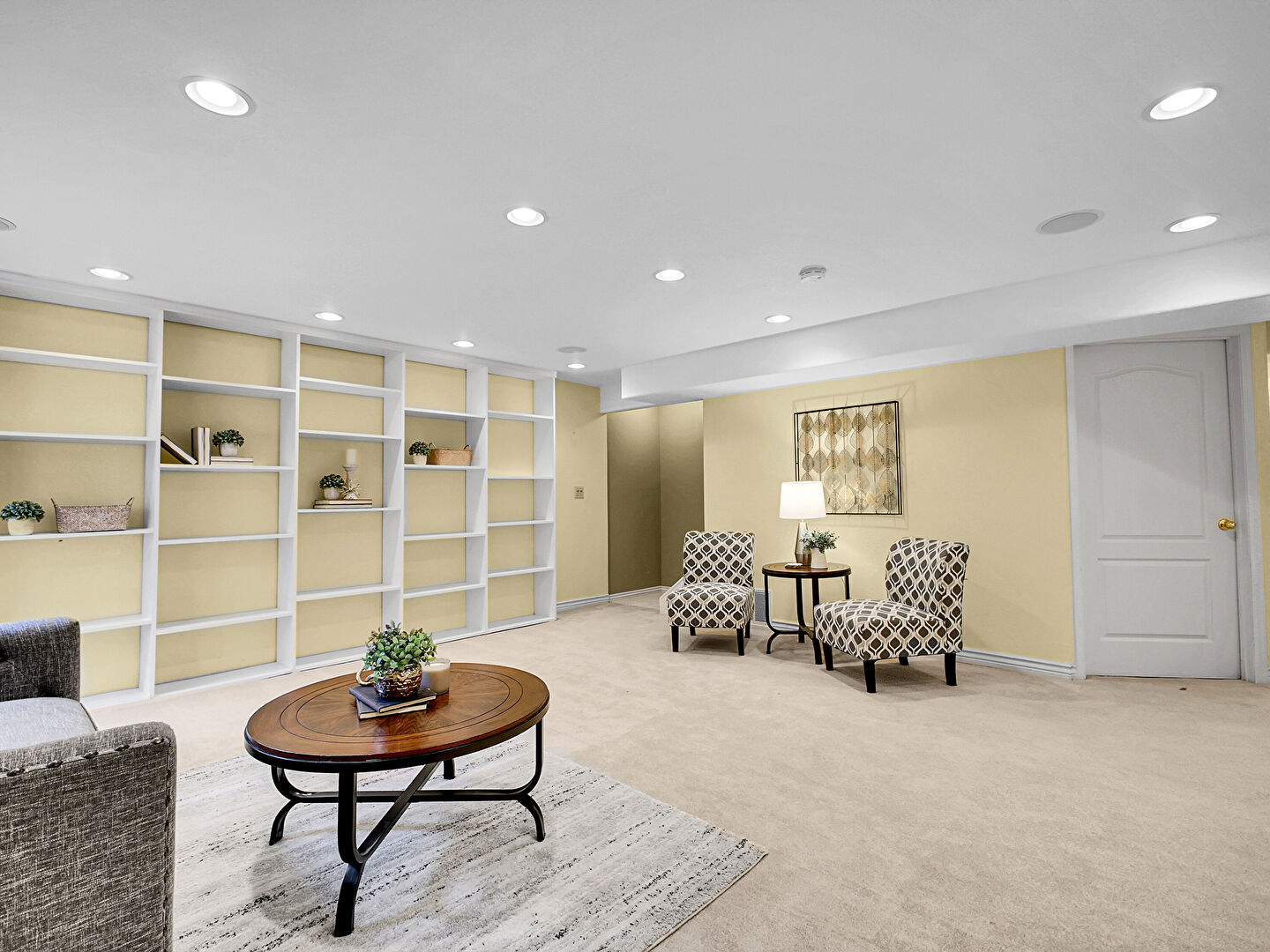 Baseboards Wall, Basement, Carpet, Drywall, Natural Light, Recessed Lighting, Vent, Baseboards Wall, Drywall