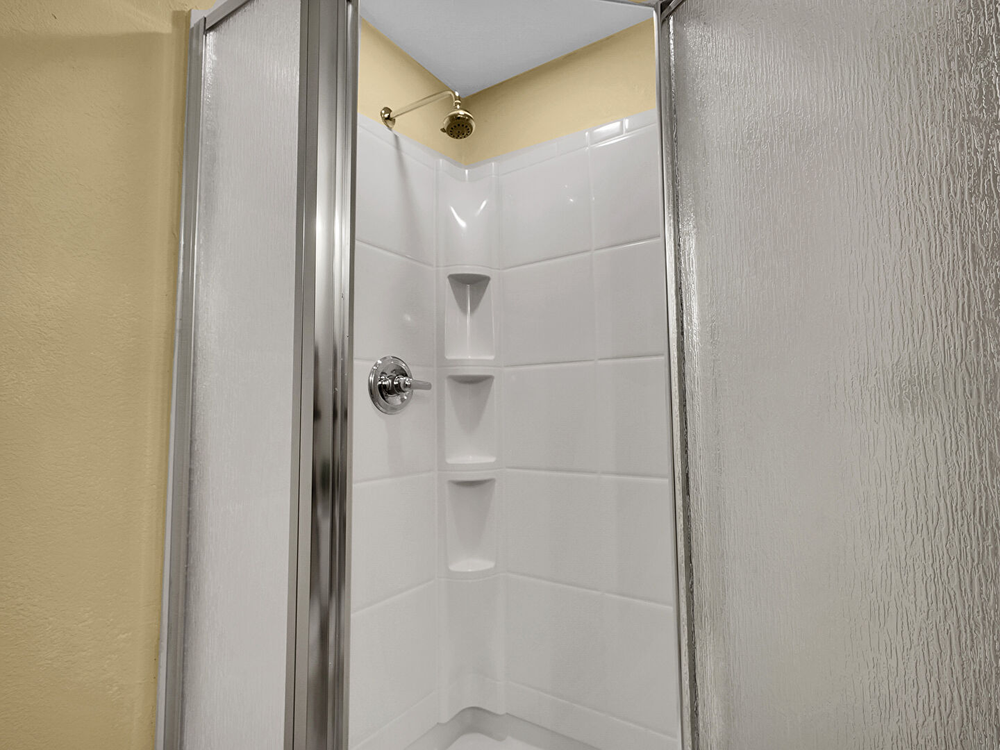 Baseboards Wall, Combined Bath Shower, Full Bathroom, Tile Floor, Vanity, Vent, Textured Wall
