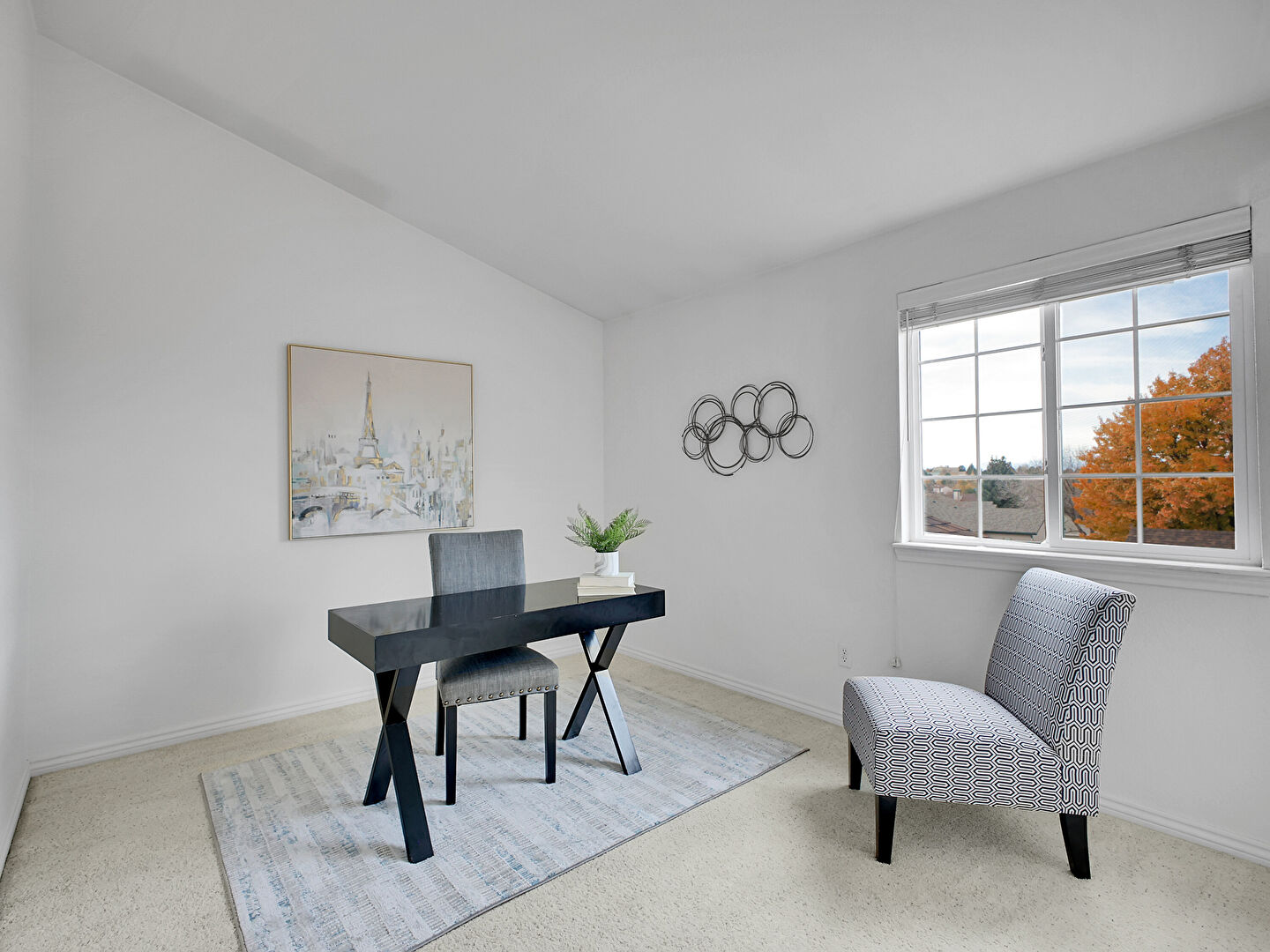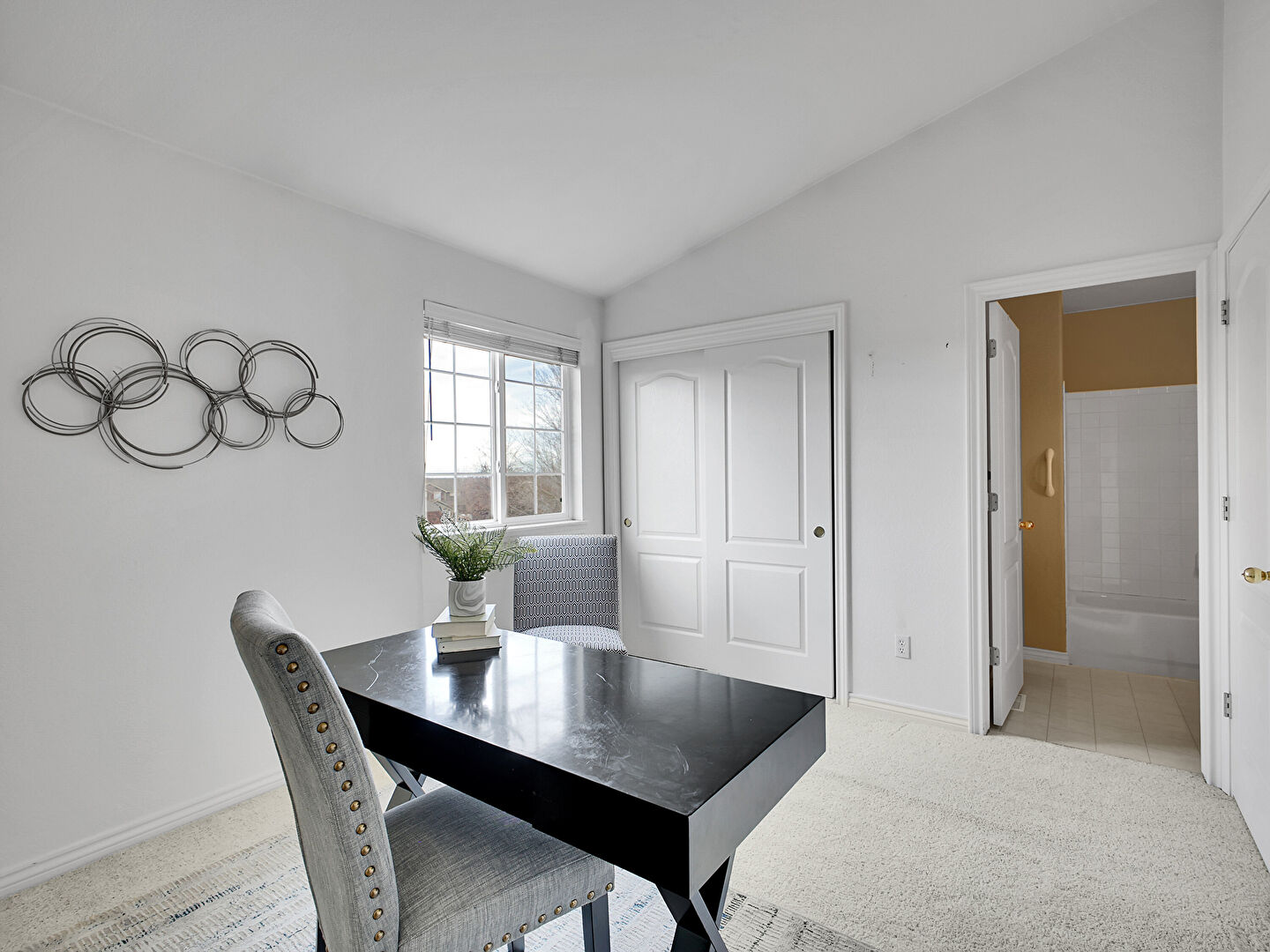 Baseboards Wall, Carpet, Drywall, Natural Light, Office Area, Vaulted Ceiling, Carpet, Natural Light