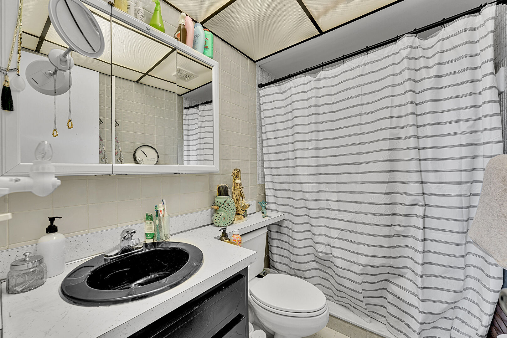 Drywall, Full Bathroom, Tile Floor, Tile Wall, Vent, Vanity