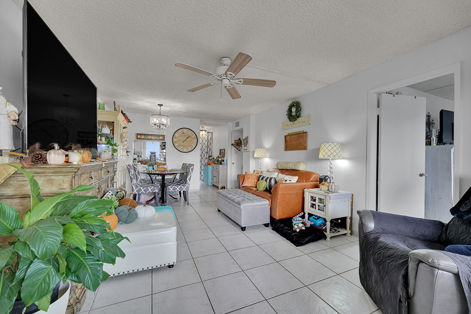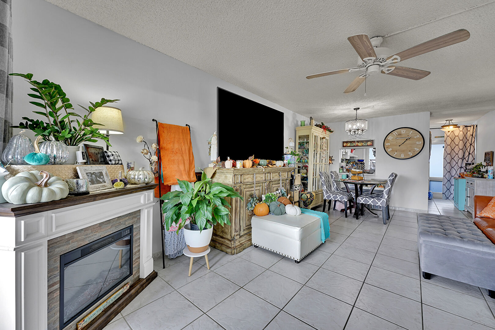 Ceiling Fan, Drywall, Fireplace, Natural Light, Notable Chandelier, Textured Ceiling, Tile Floor, Ceiling Fan, Notable Chandelier, Textured Ceiling