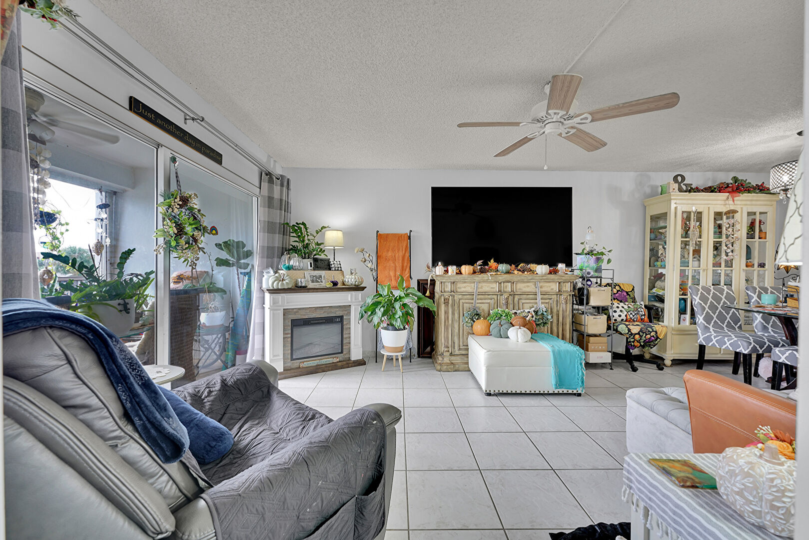 Ceiling Fan, Drywall, Fireplace, Natural Light, Textured Ceiling, Tile Floor, Ceiling Fan, Tile Floor