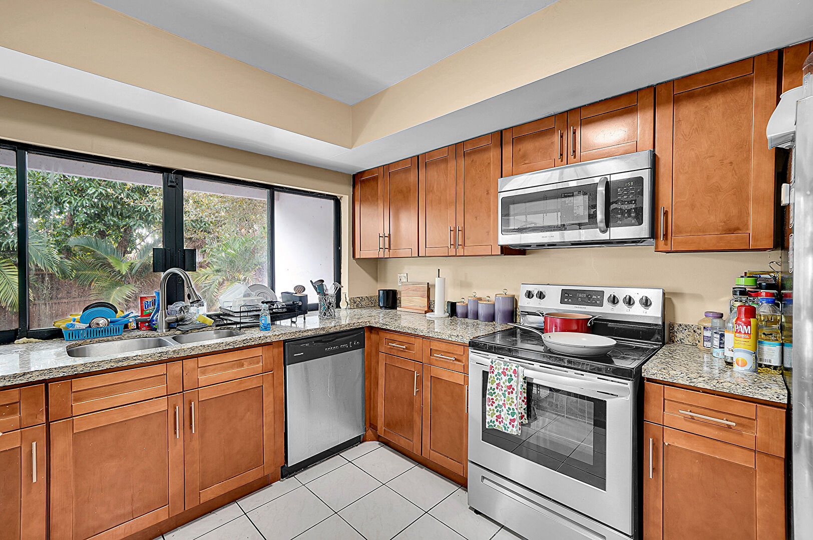 Drywall, Medium Brown Cabinets, Natural Light, Shaker Cabinets, Stone Countertops, Tile Floor, Natural Light, Stone Countertops, Tray Ceiling