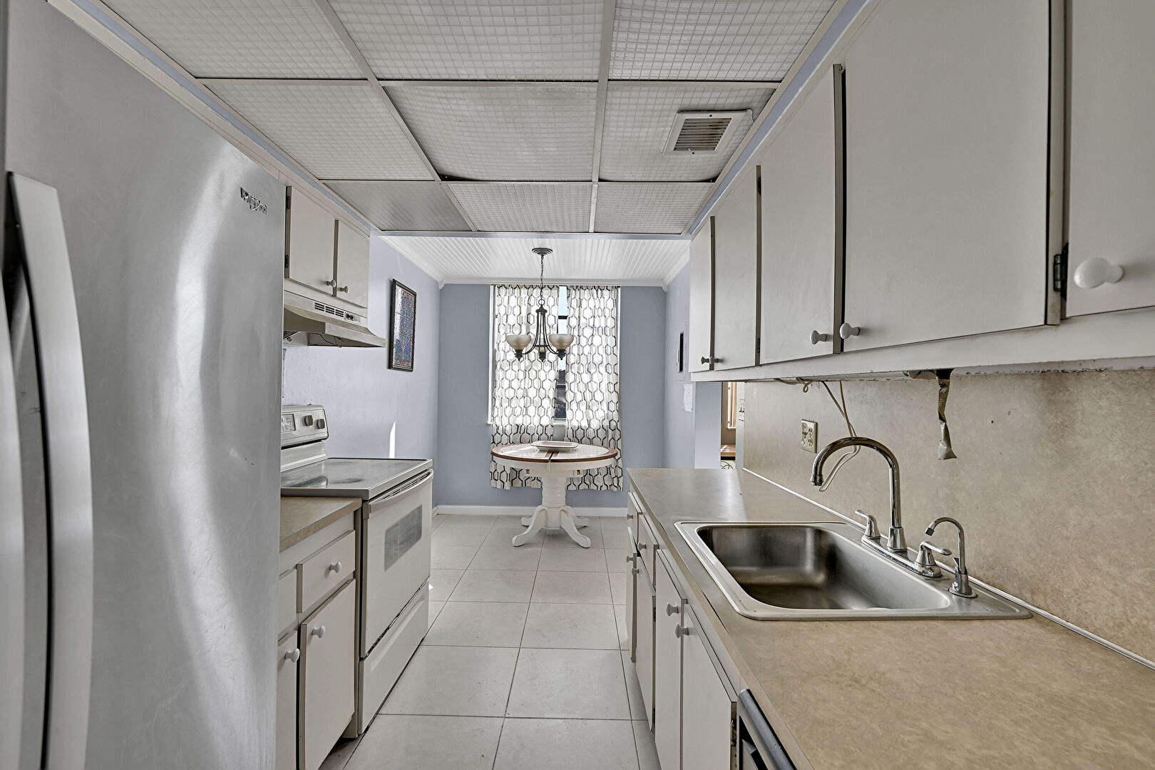 Baseboards Wall, Crown Molding Cabinets, Drywall, Galley Kitchen, Natural Light, Notable Chandelier, Pendant Lighting, Tile Floor, Vent, Visible Hinge Cabinets, Drywall, Natural Light, Pendant Lighting