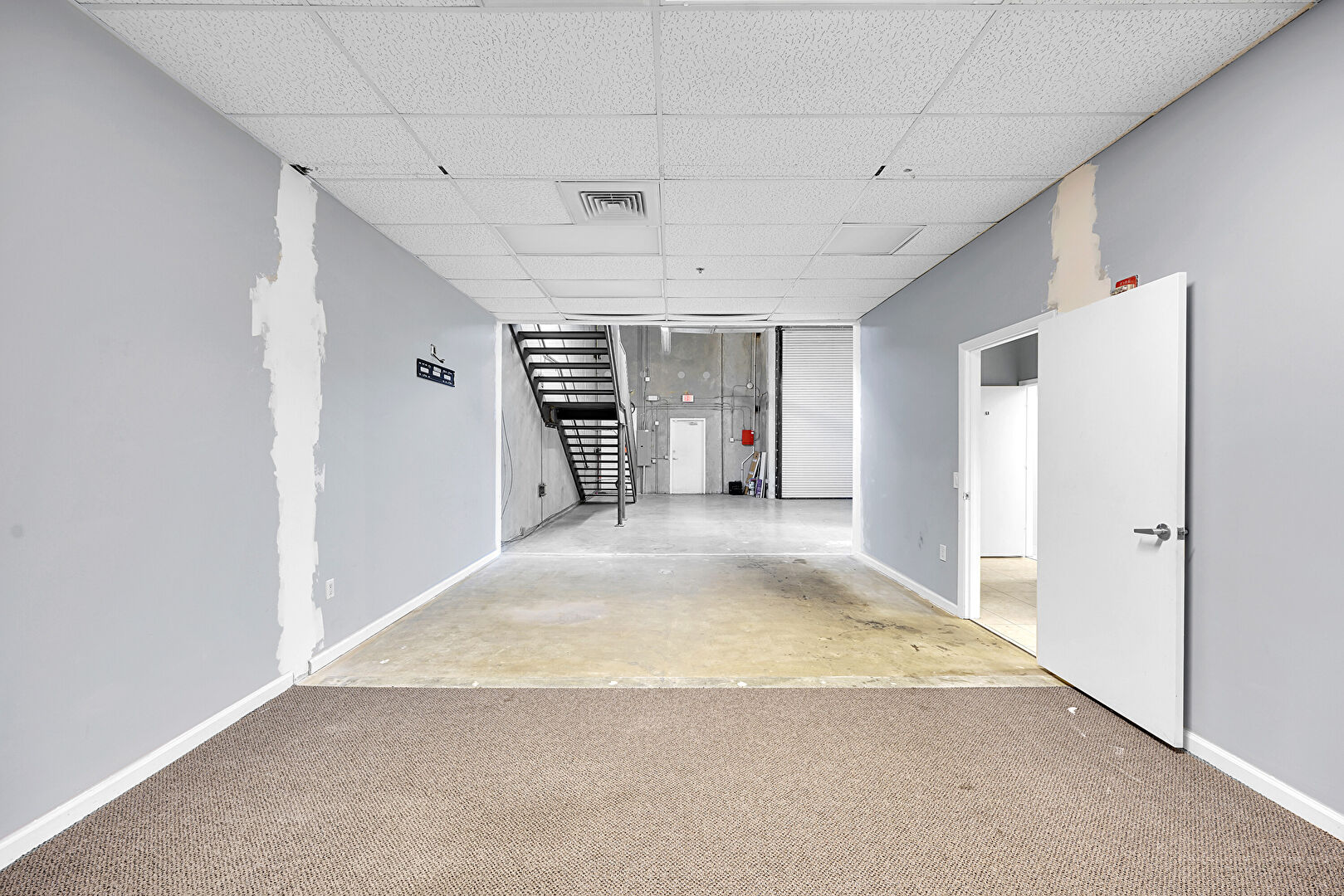 Baseboards Wall, Carpet, Concrete Floor, Drop Ceiling, Drywall, Fire Extinguisher, Natural Light, Stairs, Tile Floor, Vent, Carpet, Drywall, Fire Alarm