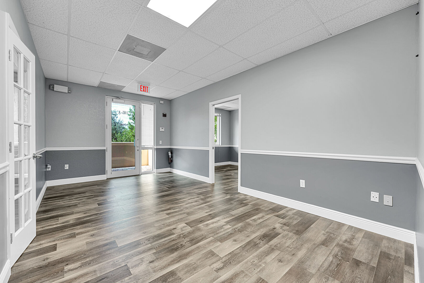 Baseboards Wall, Basement, Drop Ceiling, Drywall, Fire Extinguisher, French Doors, Natural Light, Office Area, Textured Wall, Tile Floor, Vent, Wood Finish Floor, Baseboards Wall, Carpet, Drop Ceiling, Wood Finish Floor