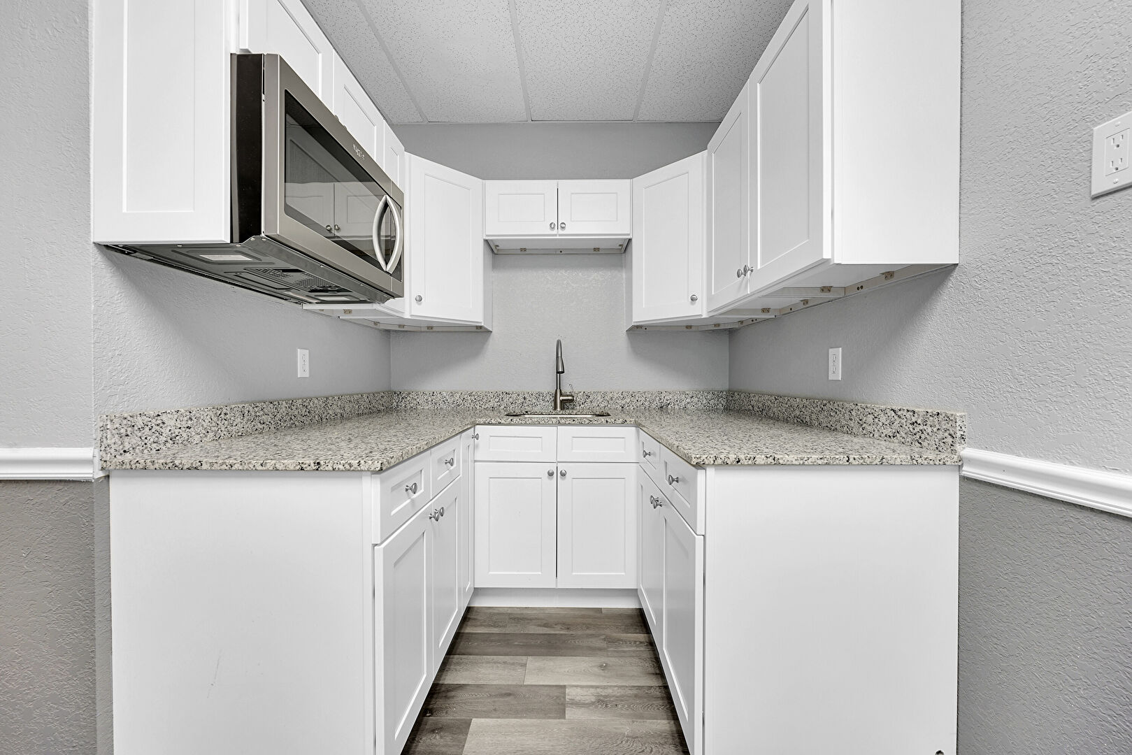 Baseboards Wall, Drop Ceiling, Shaker Cabinets, Stone Countertops, Textured Wall, Vent, Wood Finish Floor, Drop Ceiling, Shaker Cabinets