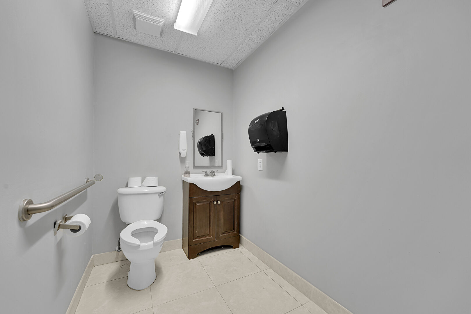 Baseboards Wall, Drop Ceiling, Drywall, Half Bathroom, Tile Floor, Vanity, Vent, Wood Finish Floor, Baseboards Wall, Drywall