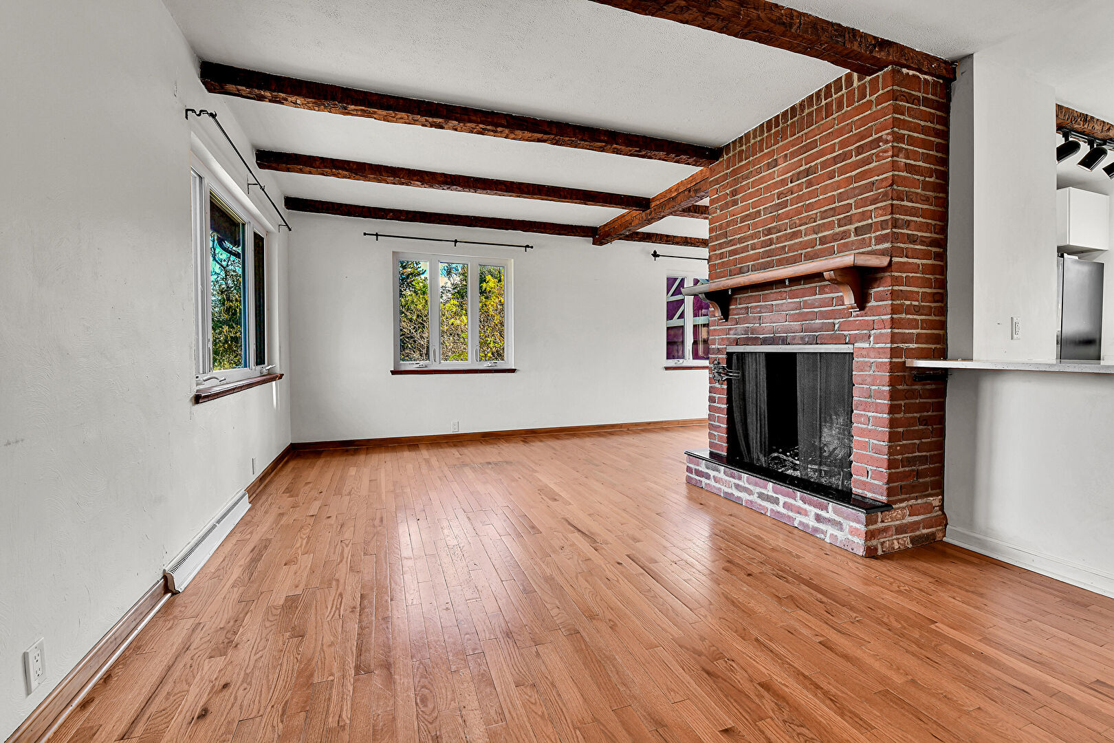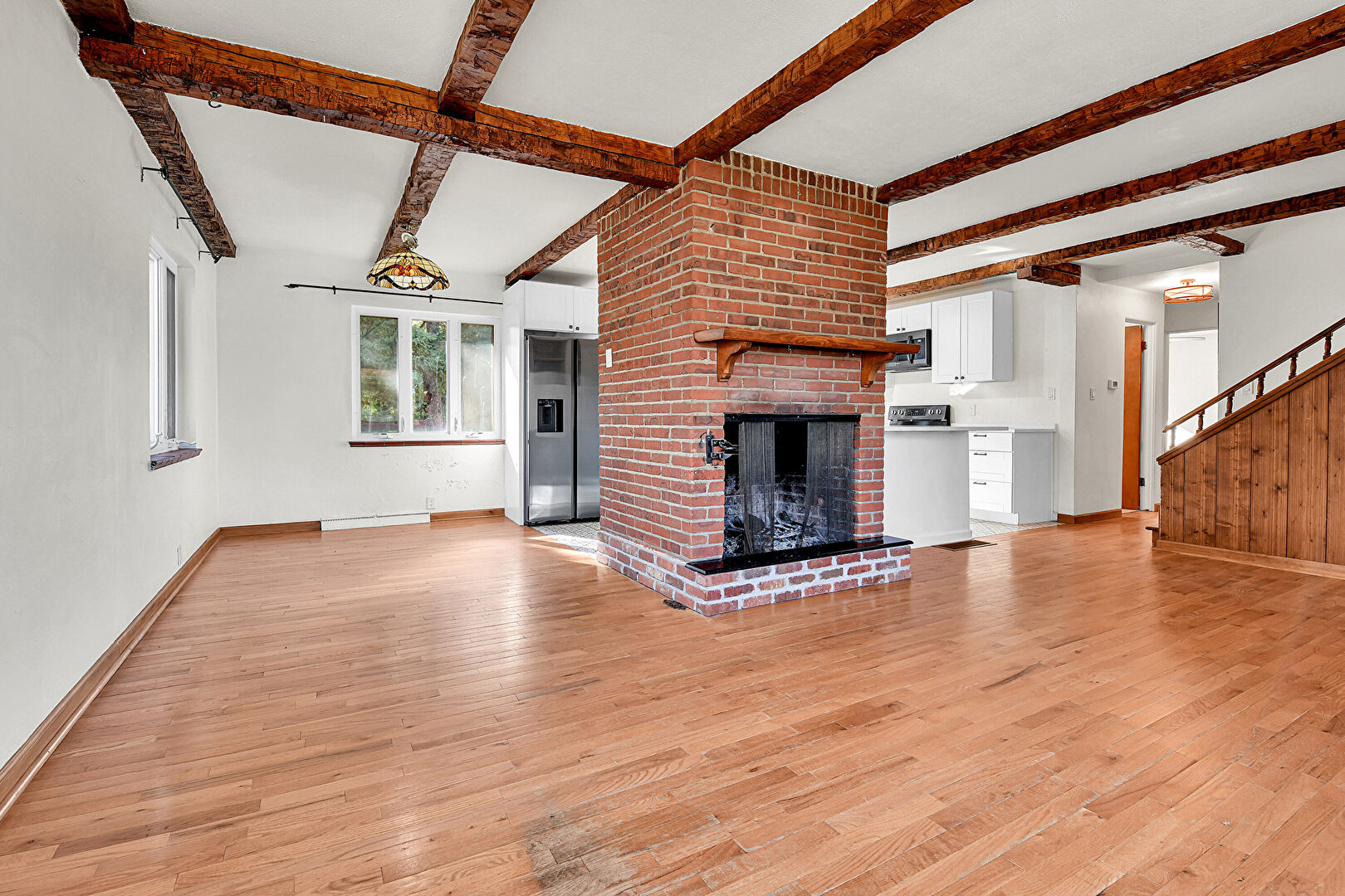 Baseboard Radiator, Baseboards Wall, Drywall, Fireplace, Natural Light, Stairs, Wood Finish Floor, Wood Wall, Beamed Ceiling