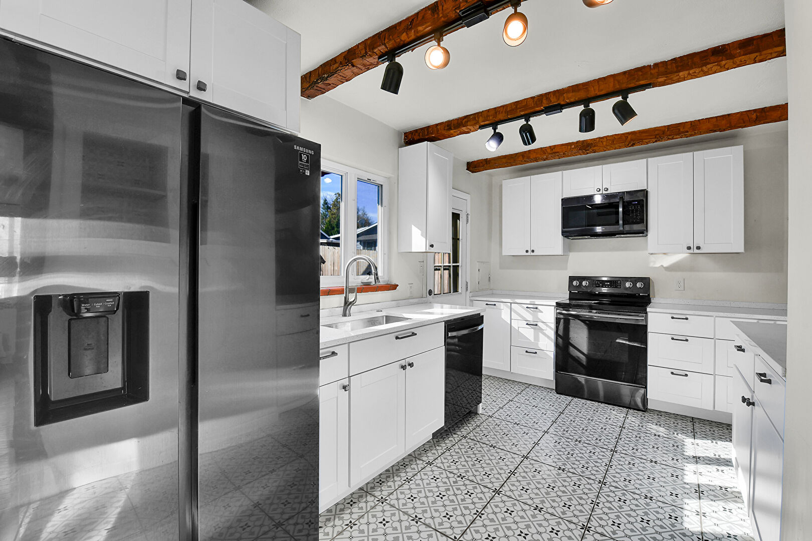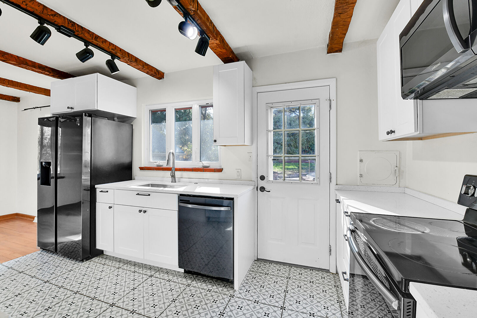 Baseboards Wall, Beamed Ceiling, Drywall, Natural Light, Shaker Cabinets, Stone Countertops, Track Lighting, Vinyl Floor, Drywall, Natural Light