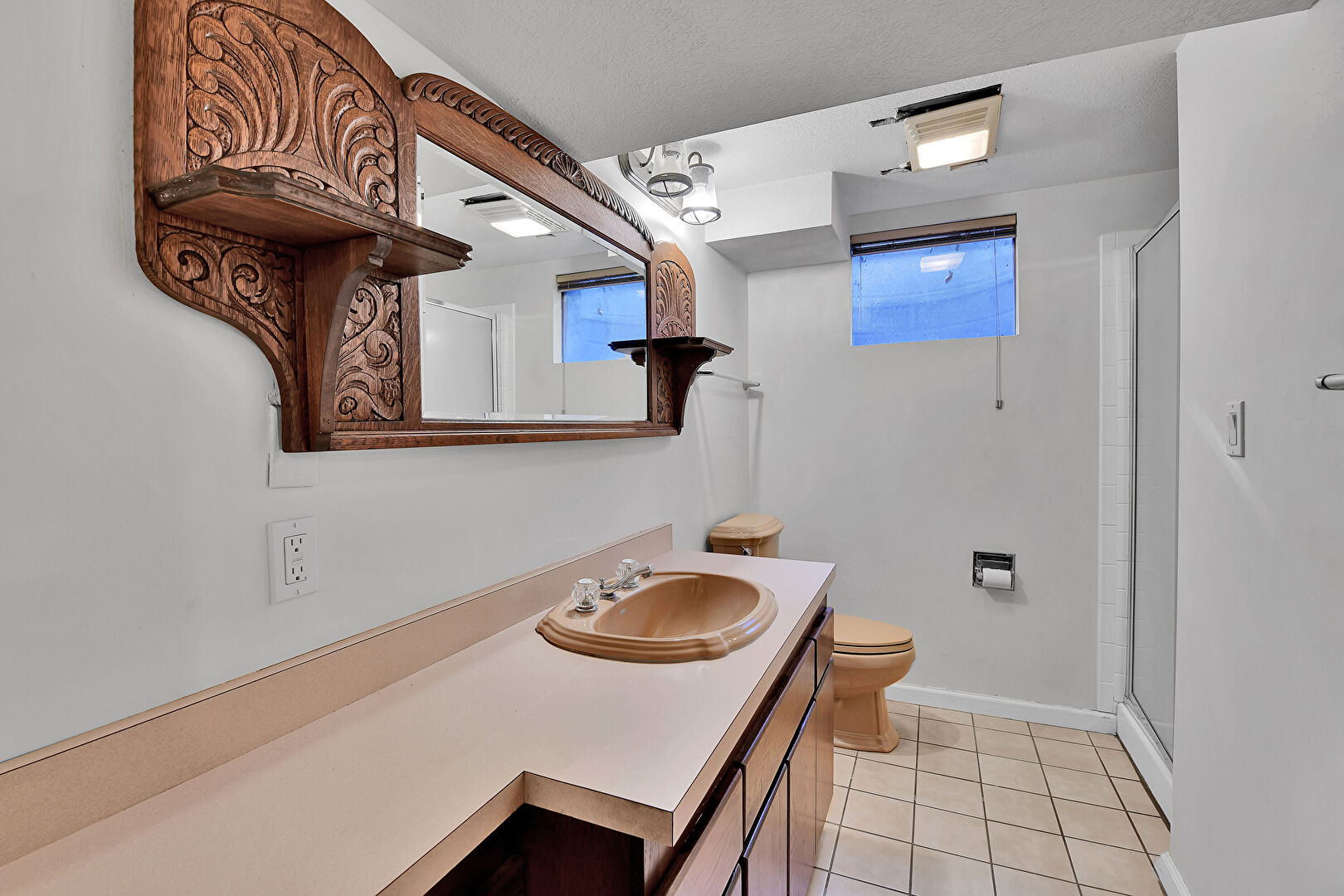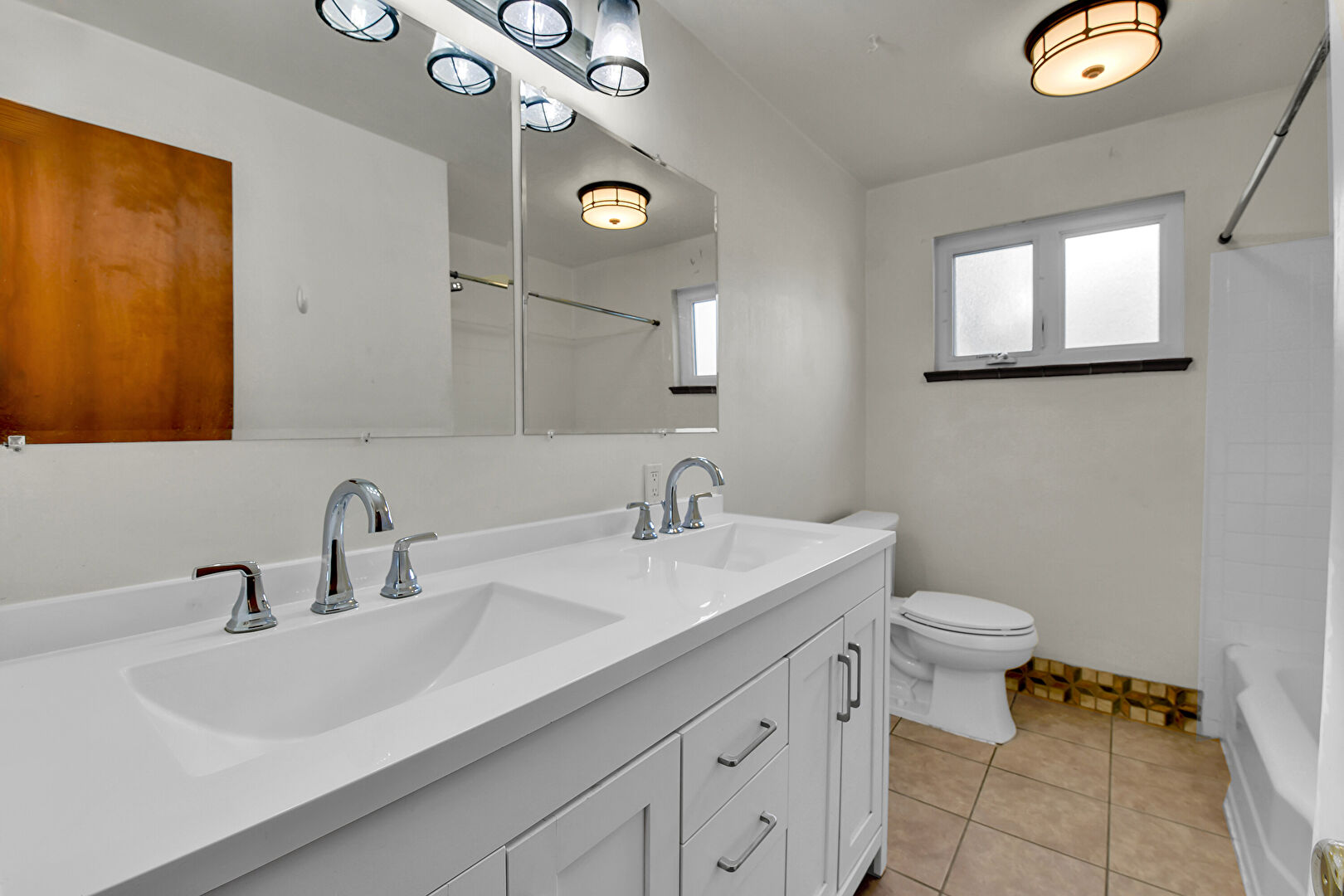 Baseboards Wall, Basement, Combined Bath Shower, Double Vanity, Drywall, Full Bathroom, Natural Light, Tile Floor, Vanity, Drywall, Tile Floor