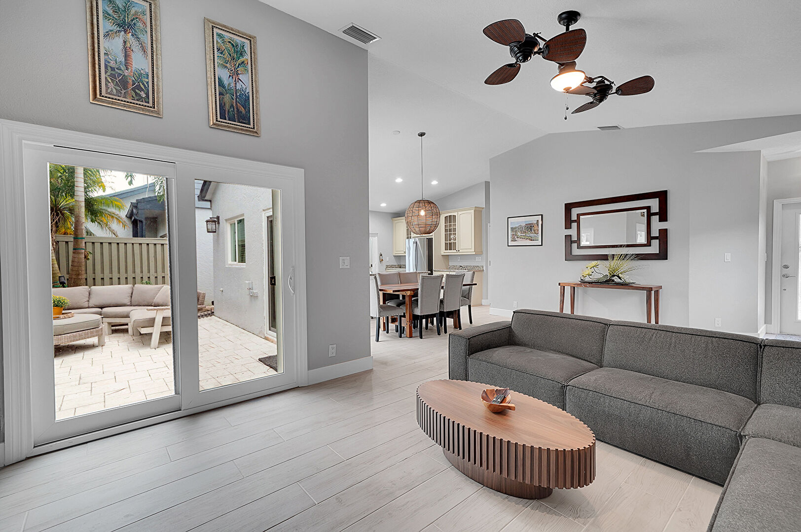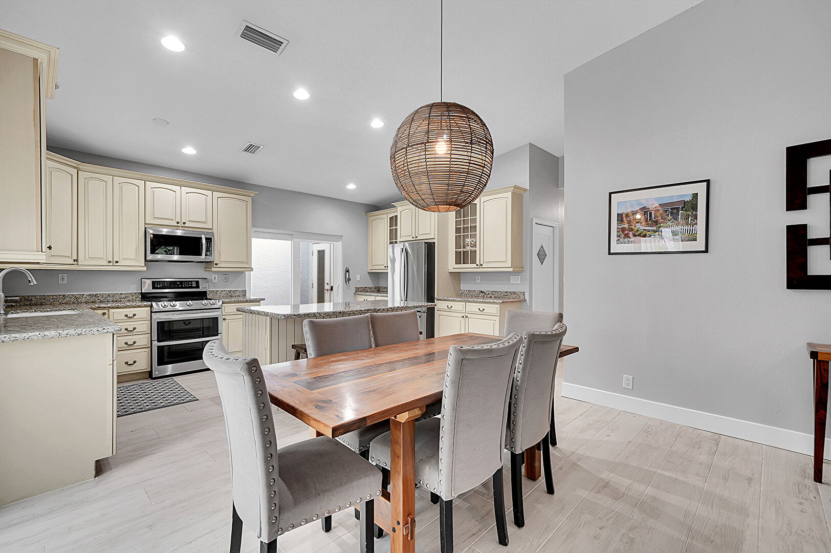 Baseboards Wall, Ceiling Fan, Drywall, Fireplace, High Ceiling, Natural Light, Recessed Lighting, U Shaped Kitchen, Vaulted Ceiling, Vent, Wood Finish Floor, Baseboards Wall, L Shaped Kitchen, Vaulted Ceiling