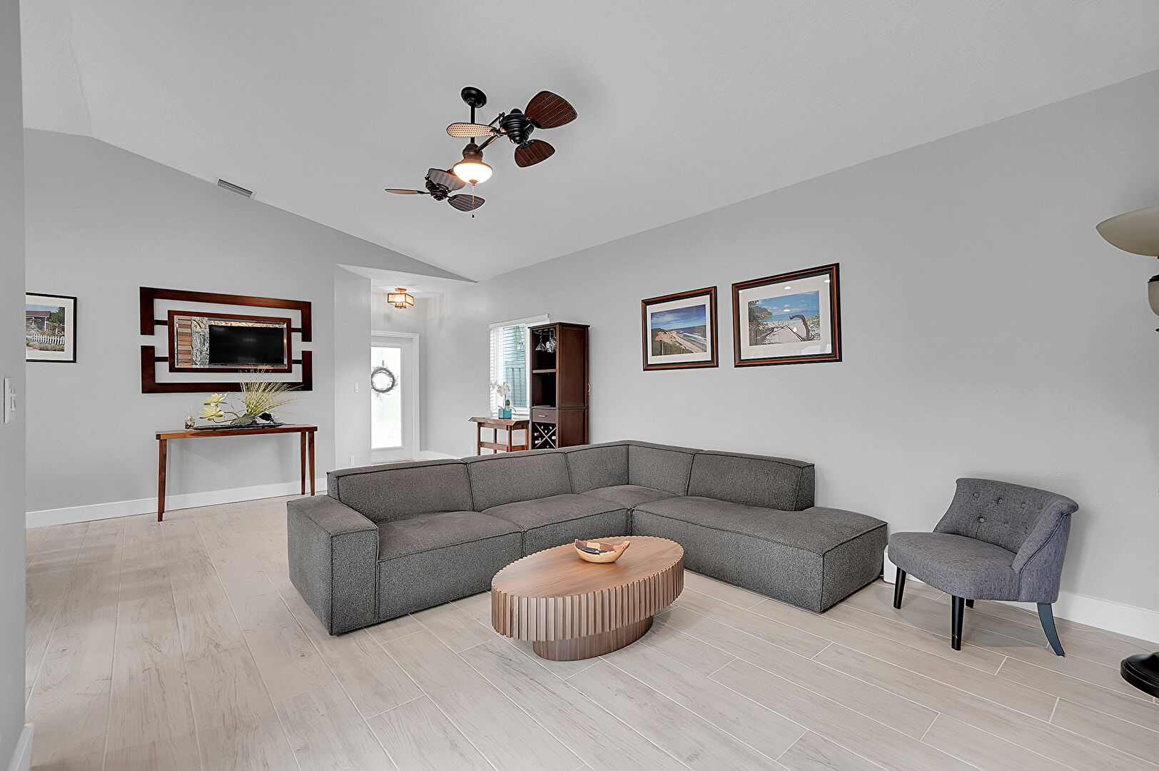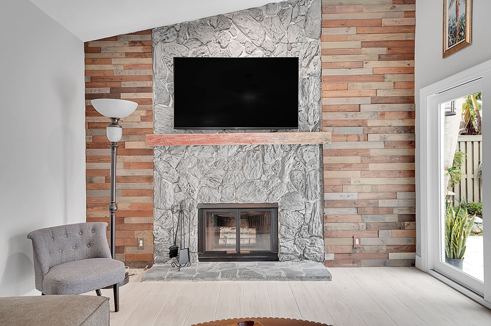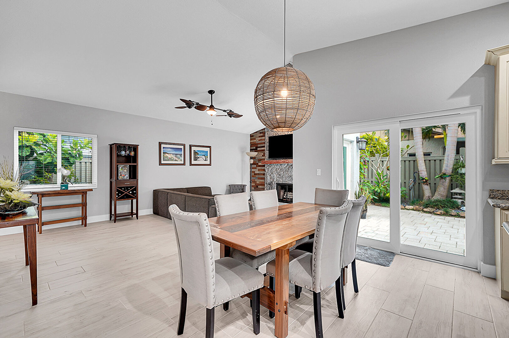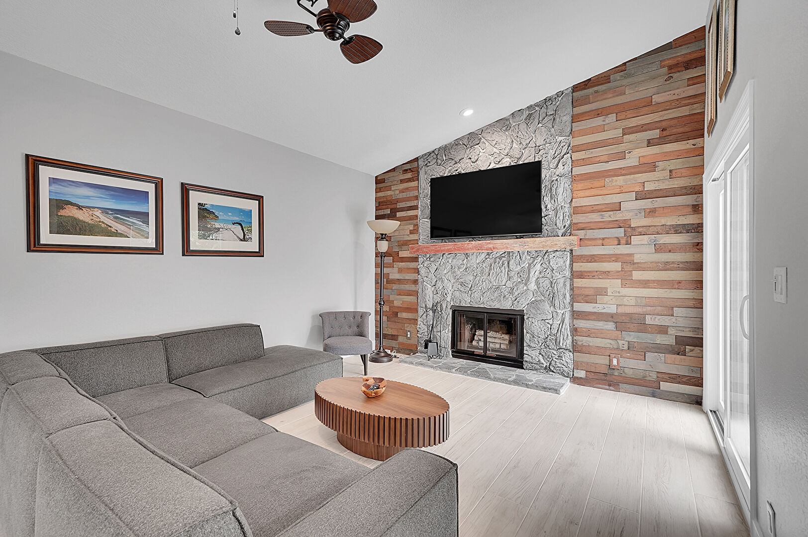Baseboards Wall, Ceiling Fan, Drywall, Fireplace, High Ceiling, Natural Light, Recessed Lighting, Stone Wall, Vaulted Ceiling, Vent, Wood Finish Floor, Baseboards Wall, Drywall, High Ceiling, Vaulted Ceiling