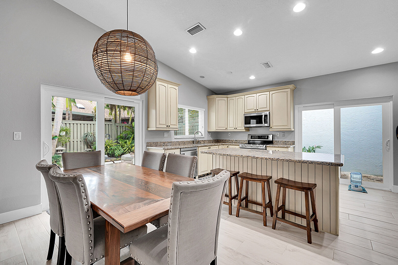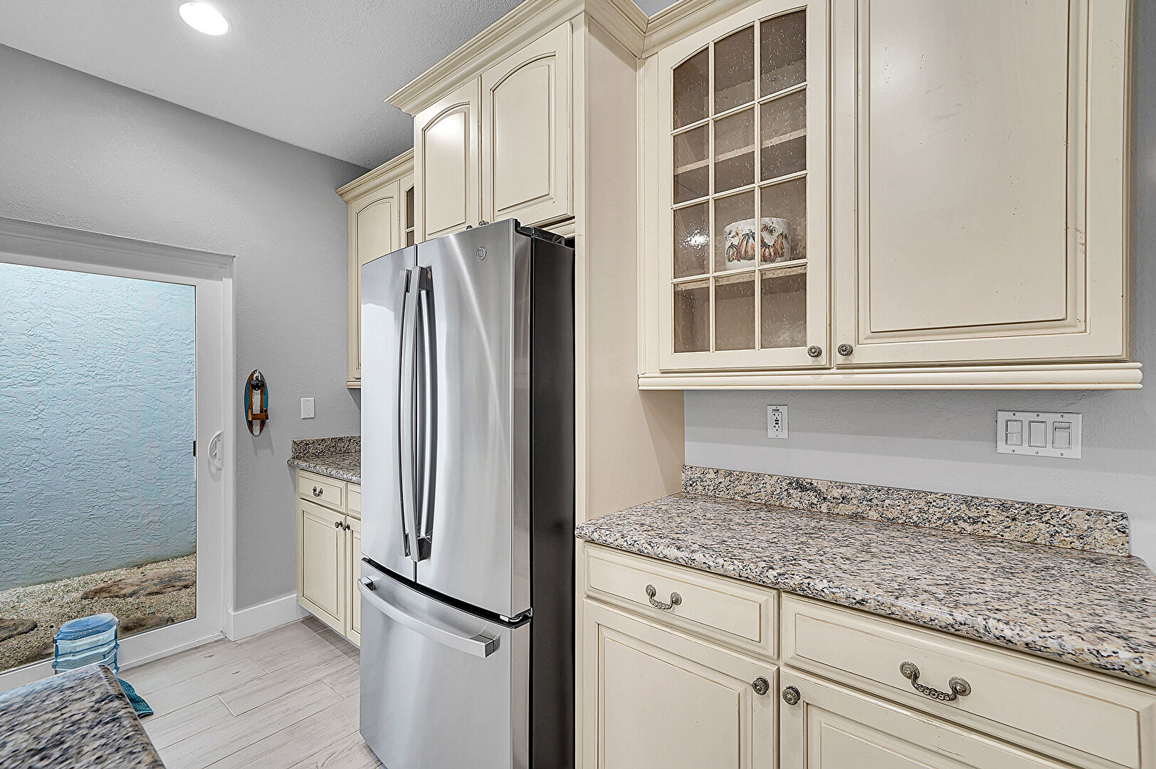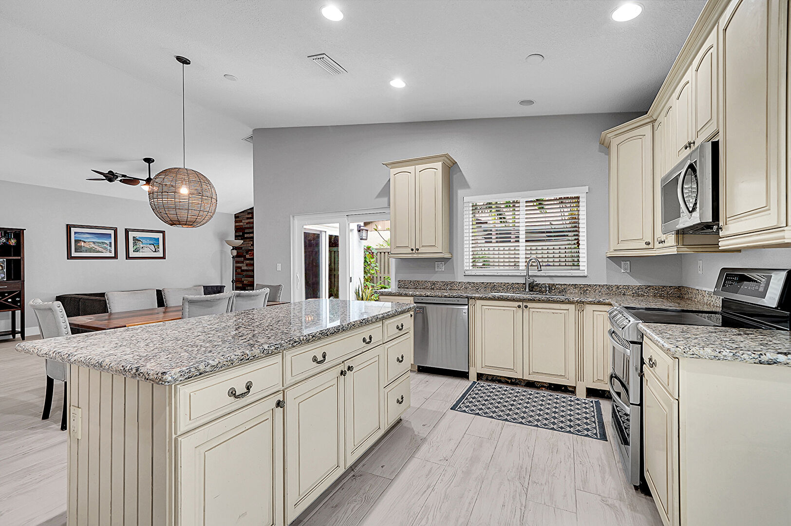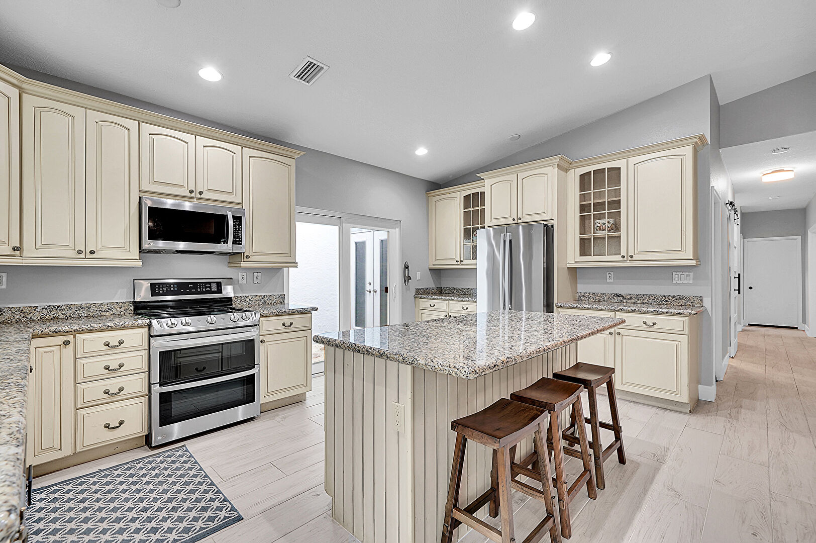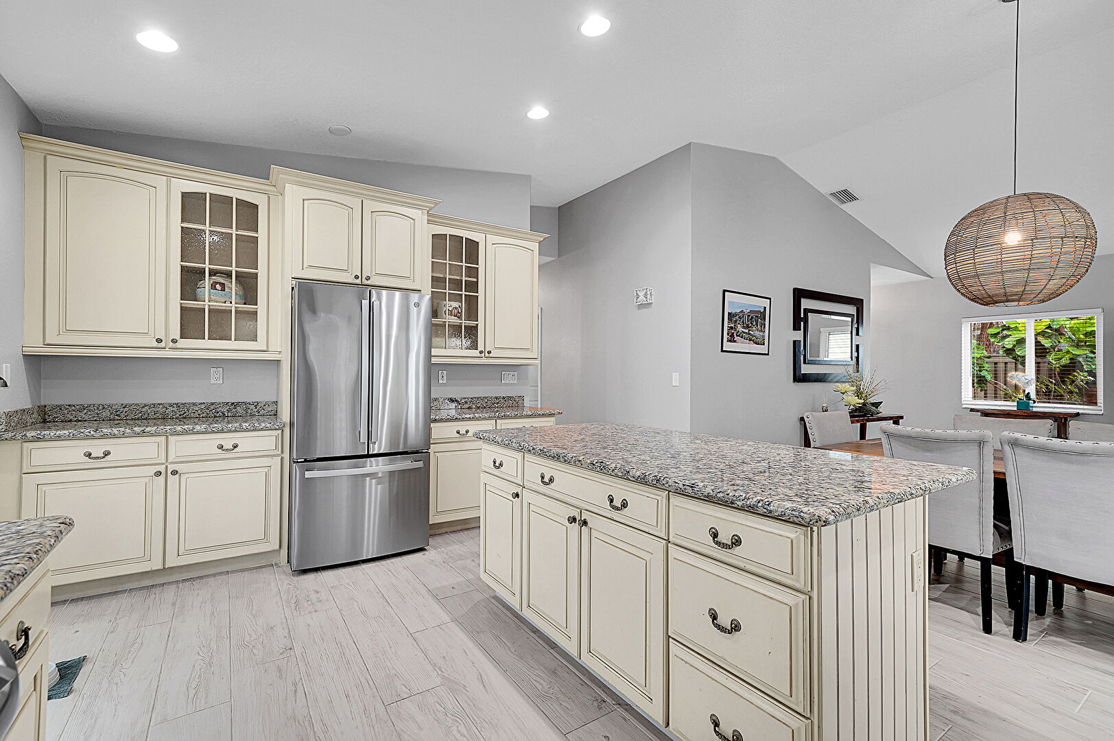 Arched Cabinets, Baseboards Wall, Ceiling Fan, Cream Cabinets, Crown Molding Cabinets, Drywall, Glass Insert Cabinets, Kitchen Bar, Kitchen Island, Natural Light, Opens To Living Area, Pendant Lighting, Raised Cabinets, Recessed Lighting, Stone Countertops, Vaulted Ceiling, Vent, Wood Finish Floor, Crown Molding Cabinets, Drywall, Natural Light