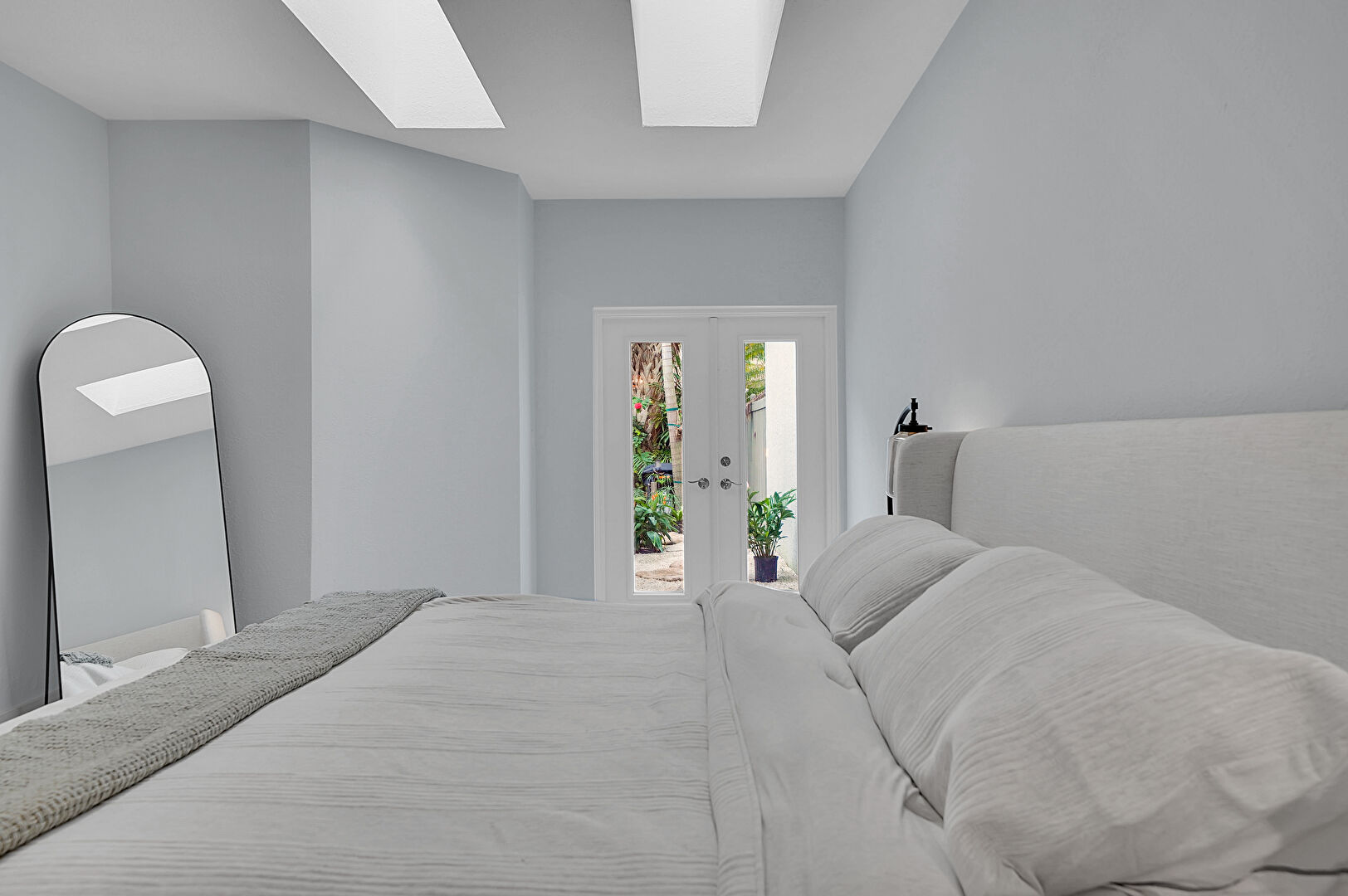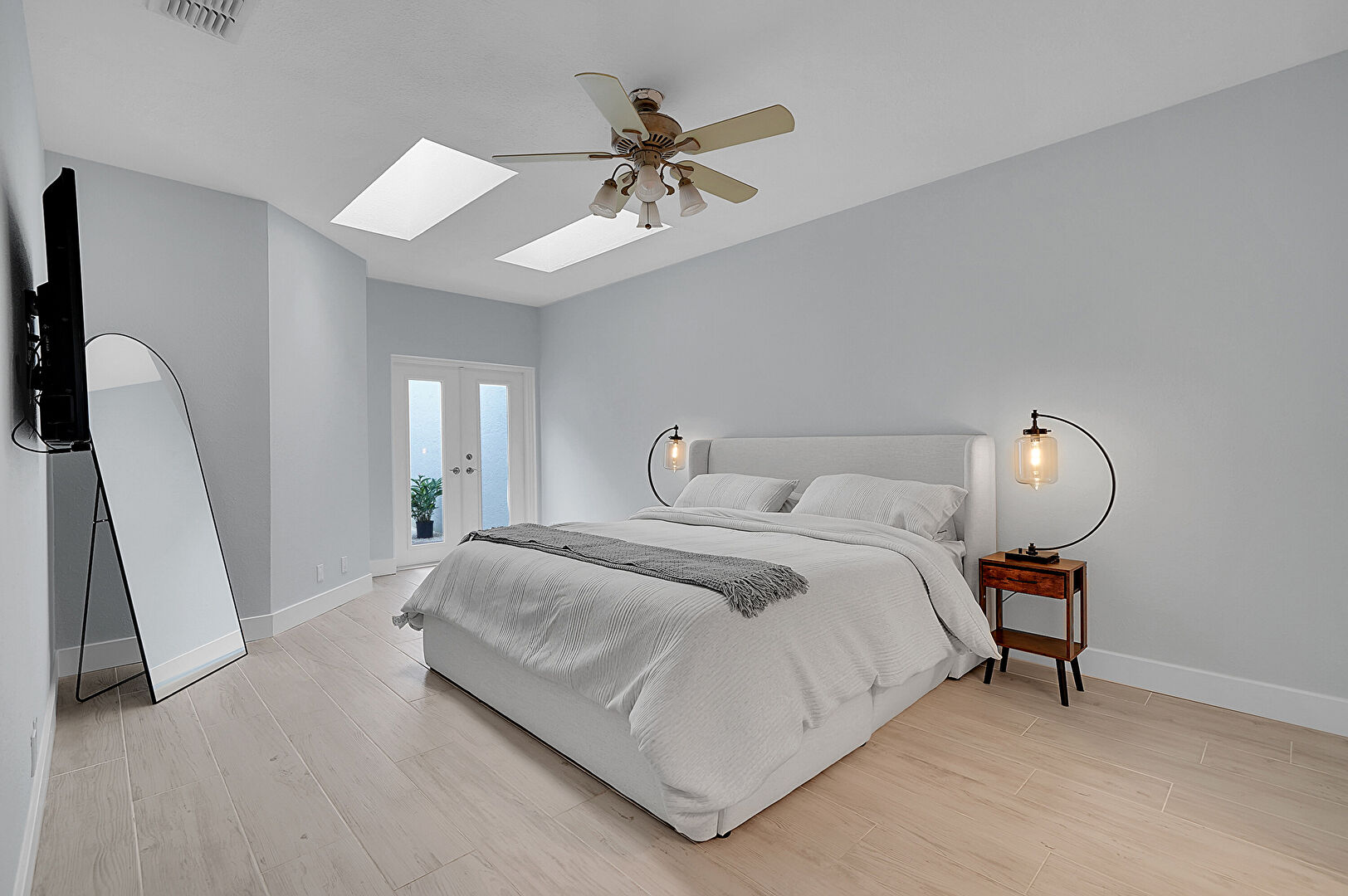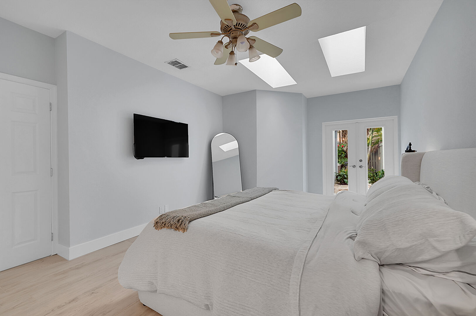 Access To Exterior, Baseboards Wall, Ceiling Fan, Drywall, Ensuite Bathroom, French Doors, Natural Light, Skylight, Vent, Wood Finish Floor, Drywall, French Doors, Skylight