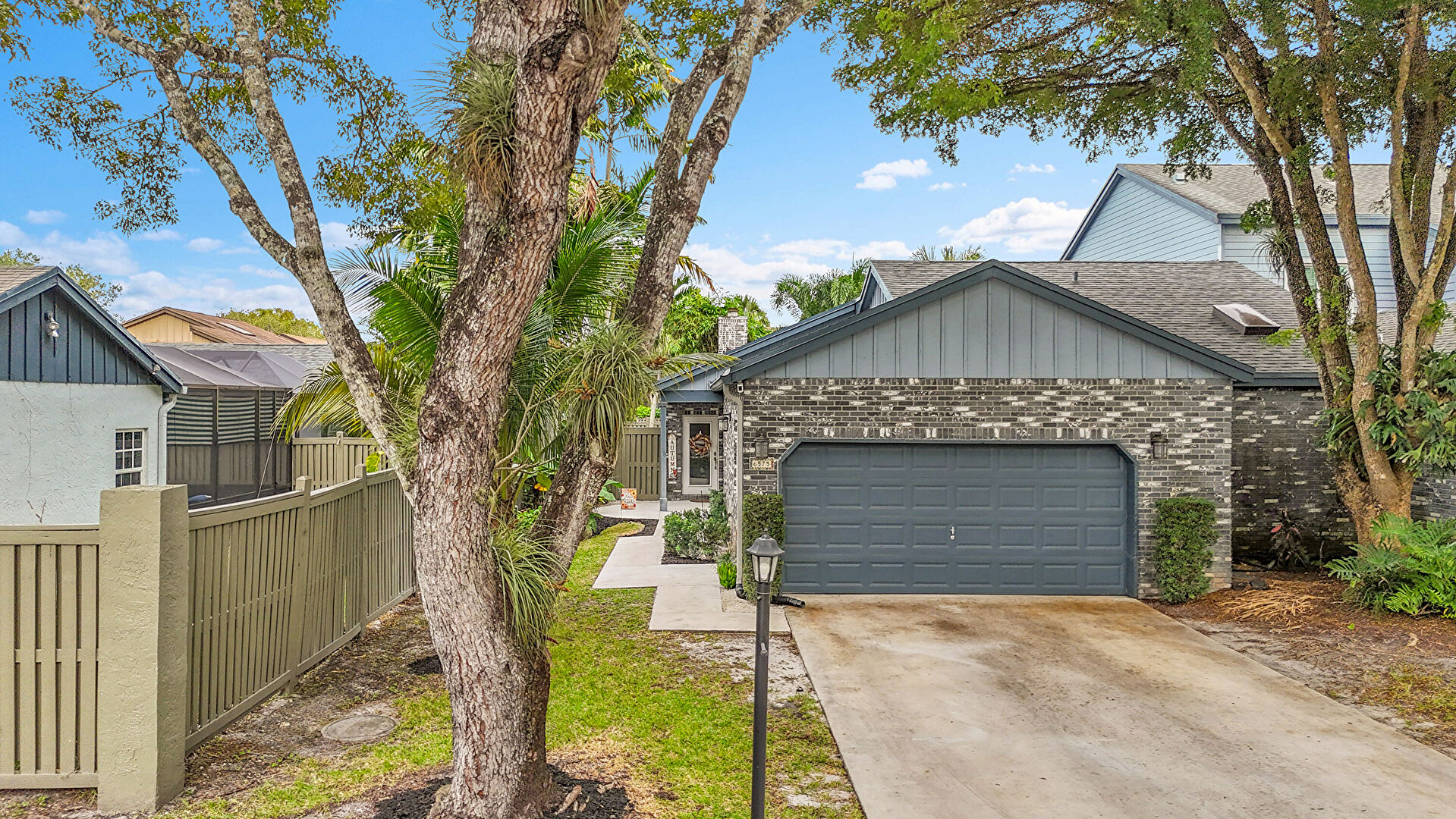 Board Batten Siding, Brick Siding, Chimney, Fence, Patio, Vertical Siding, Brick Siding, Gate
