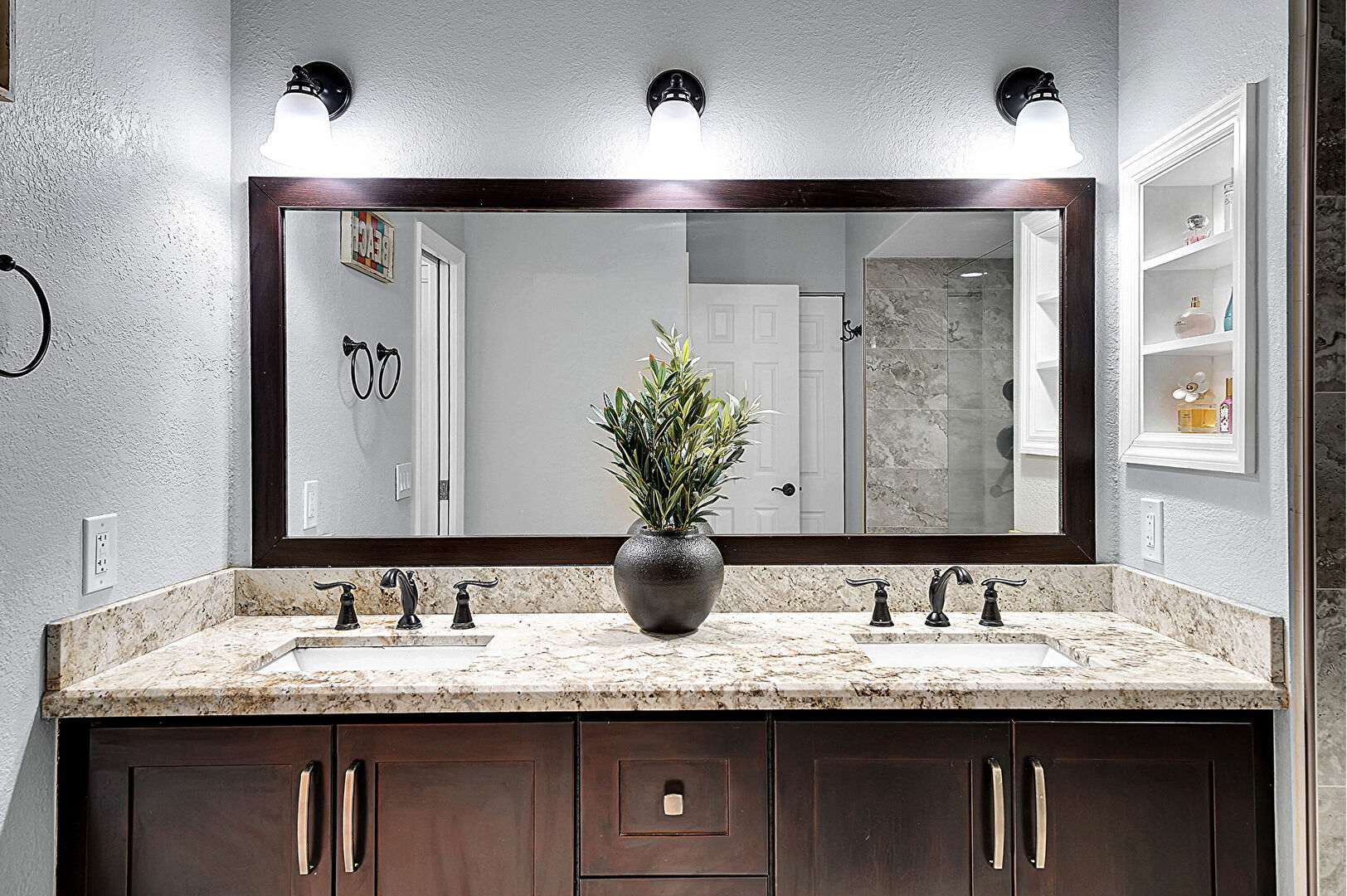 Baseboards Wall, Built In Shelves, Double Vanity, Drywall, Half Bathroom, Recessed Lighting, Textured Wall, Vanity, Vent, Full Bathroom, Textured Wall, Tile Floor