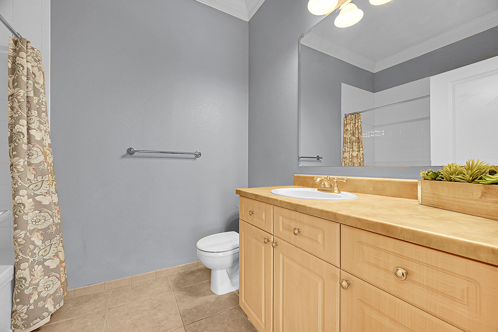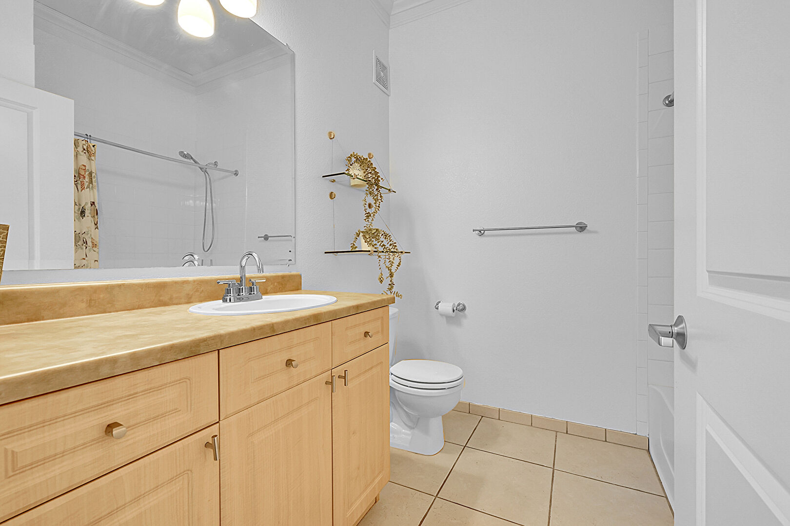 Baseboards Wall, Combined Bath Shower, Crown Molding, Drywall, Full Bathroom, Textured Wall, Tile Floor, Vanity, Baseboards Wall, Vanity, Vent