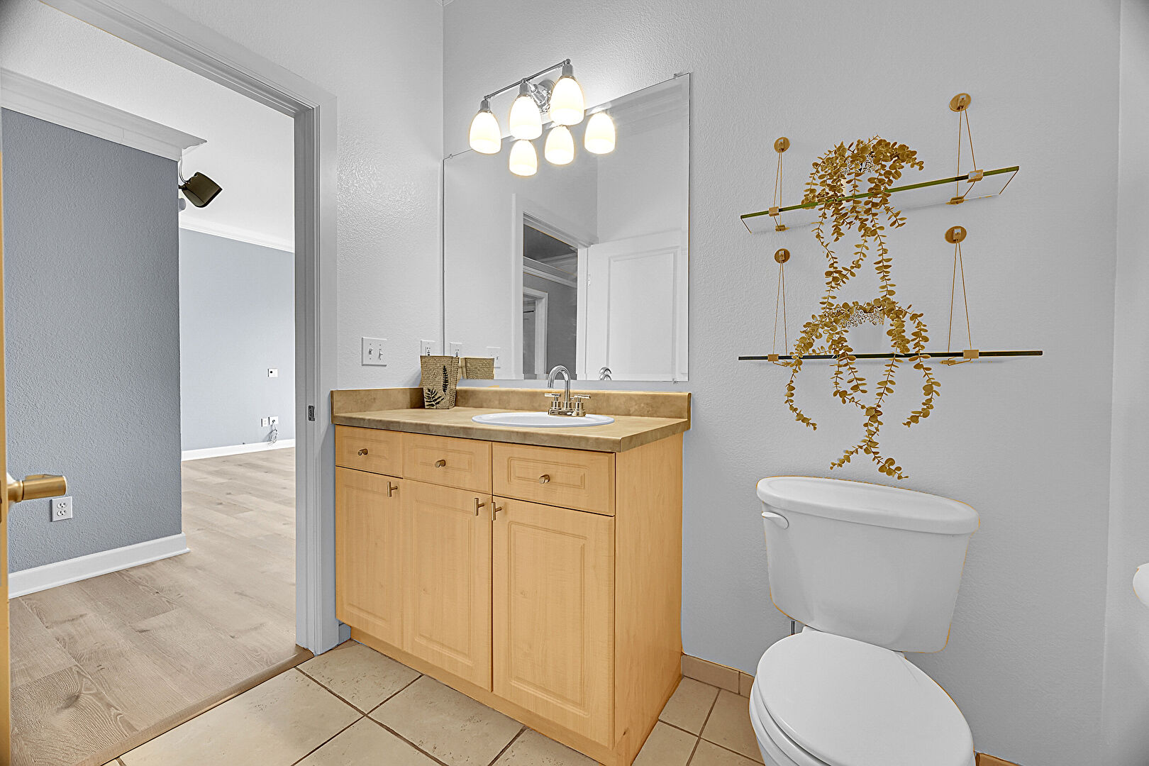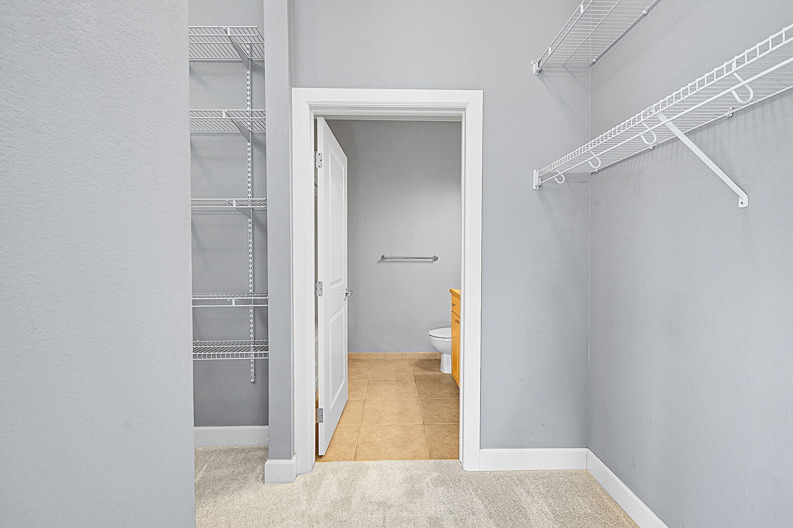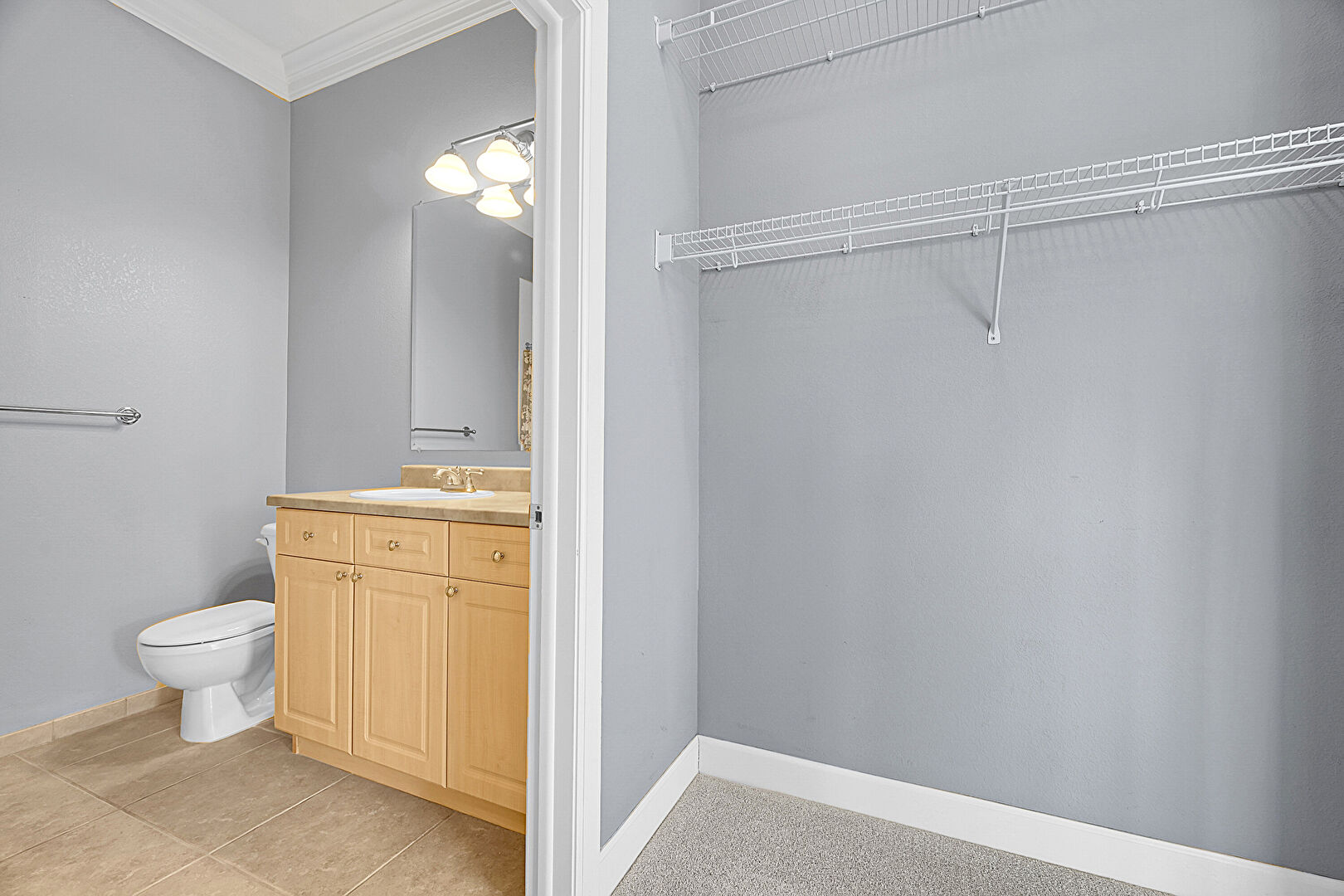 Baseboards Wall, Crown Molding, Drywall, Half Bathroom, Tile Floor, Vanity, Carpet, Closet