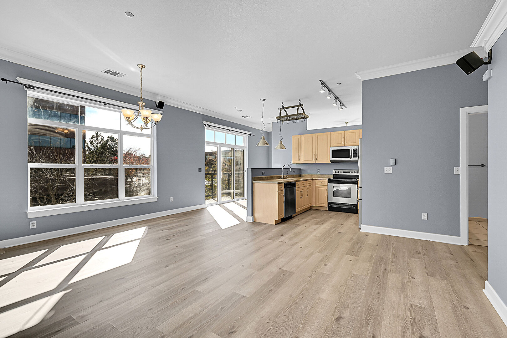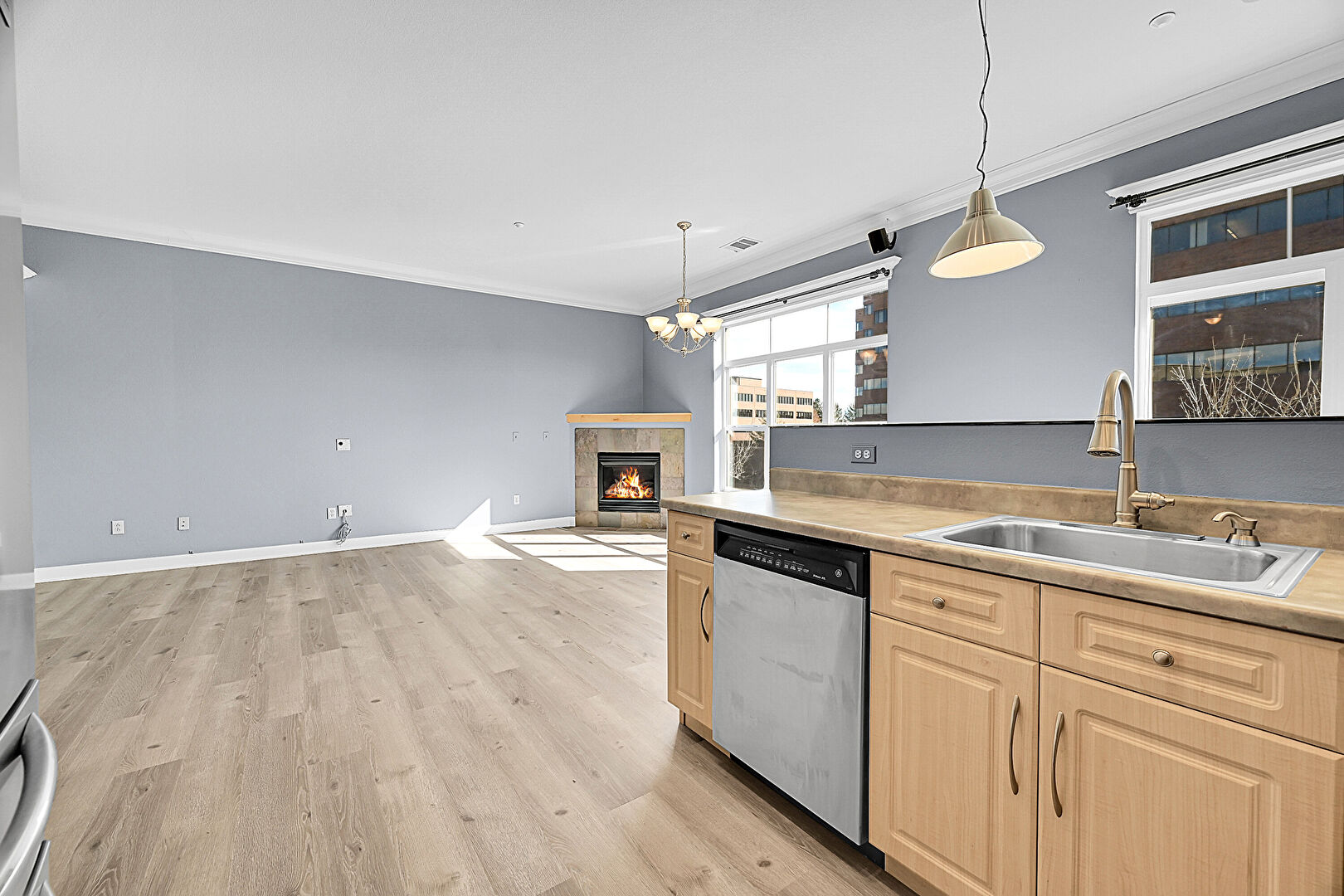 Baseboards Wall, Crown Molding, Drywall, Fireplace, Kitchen Peninsula, Natural Light, Notable Chandelier, Opens To Living Area, Pendant Lighting, Raised Cabinets, Track Lighting, Vent, Wood Finish Floor, Crown Molding, Drywall, Wood Finish Floor