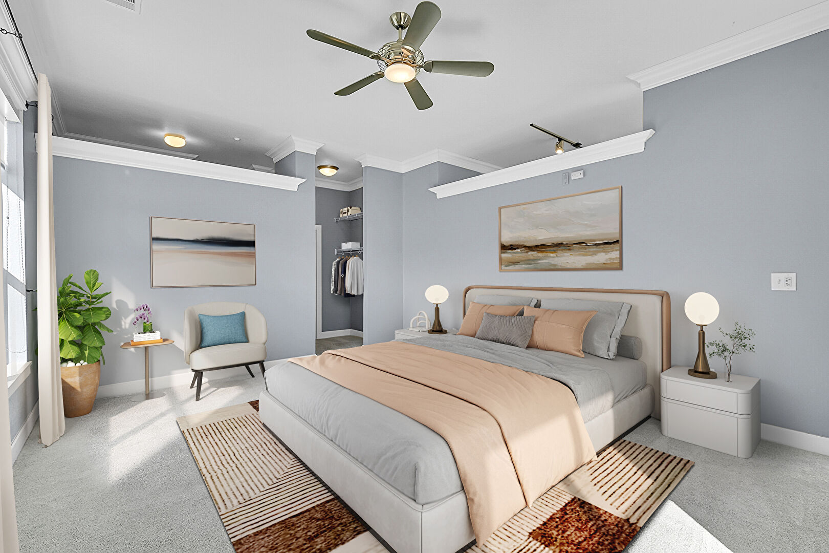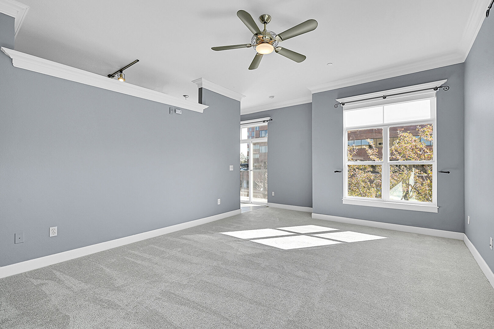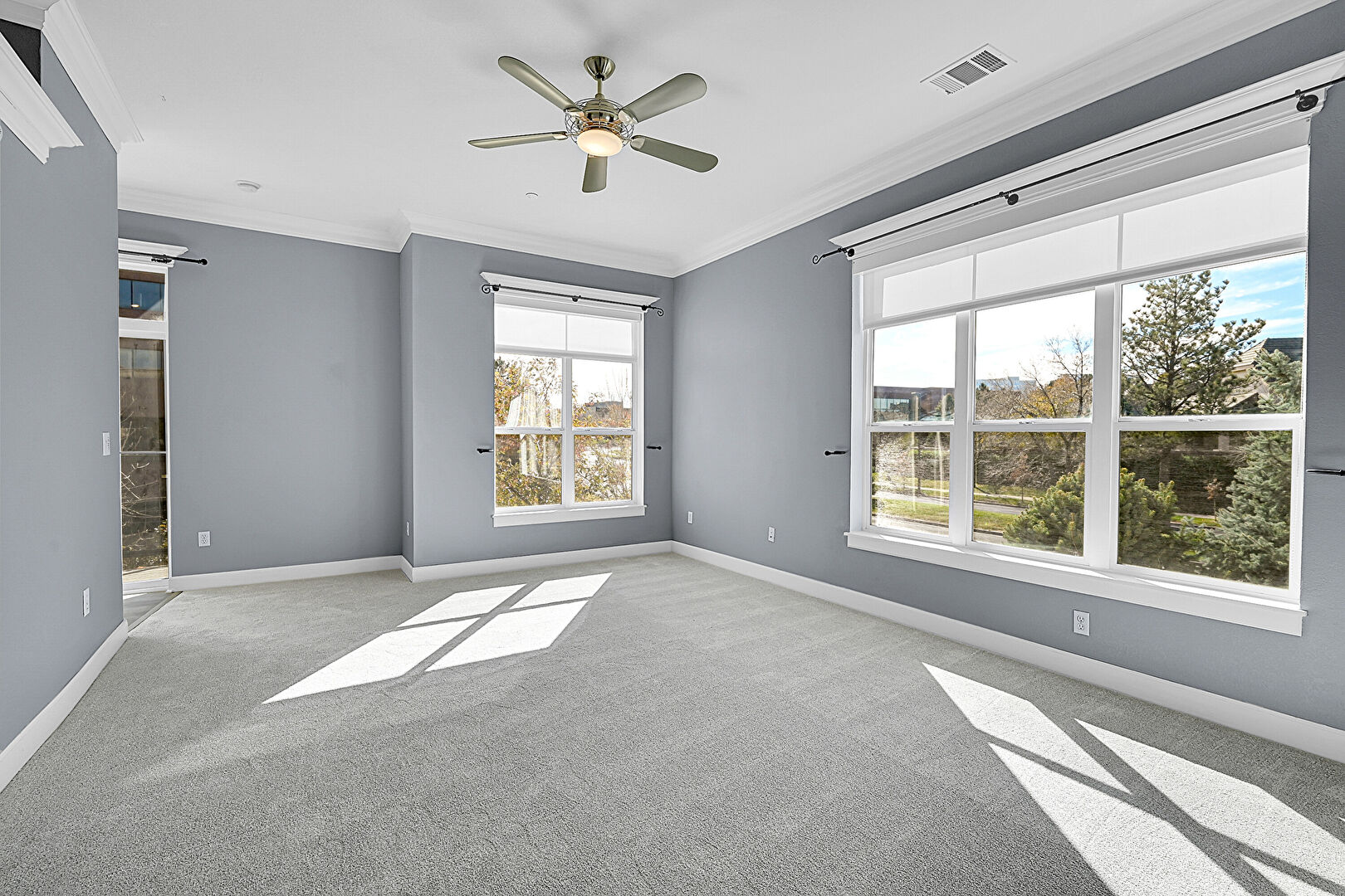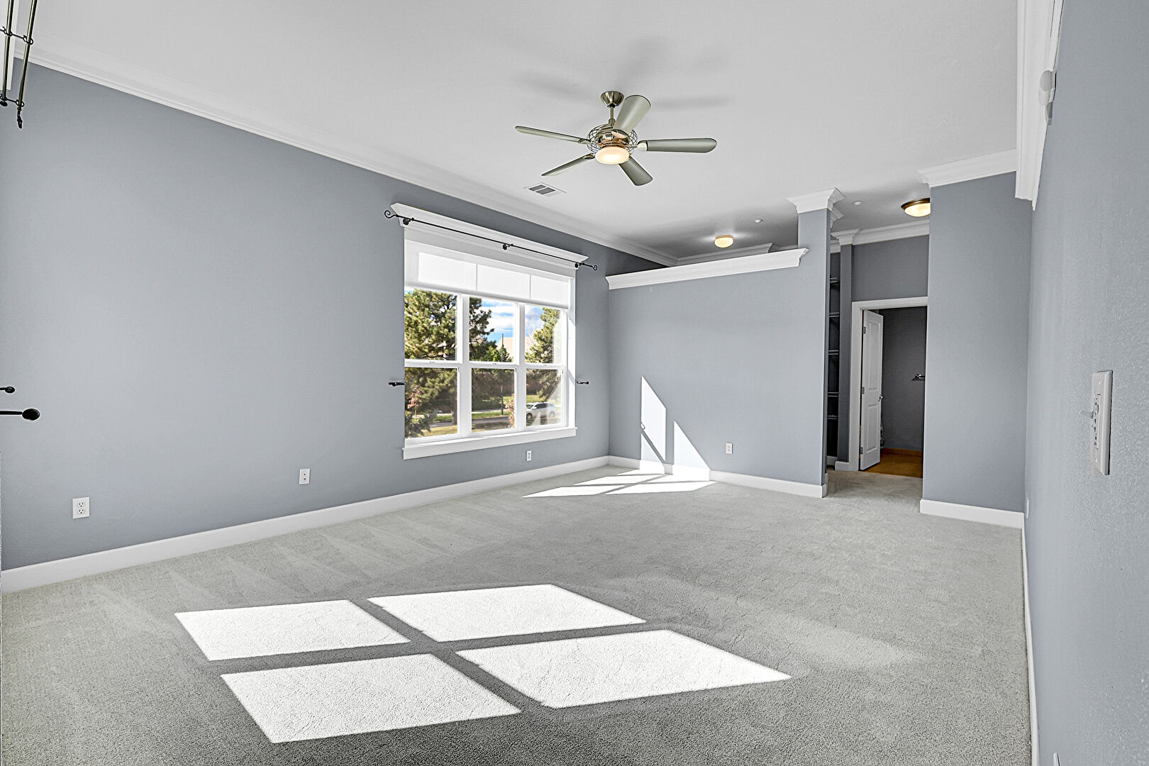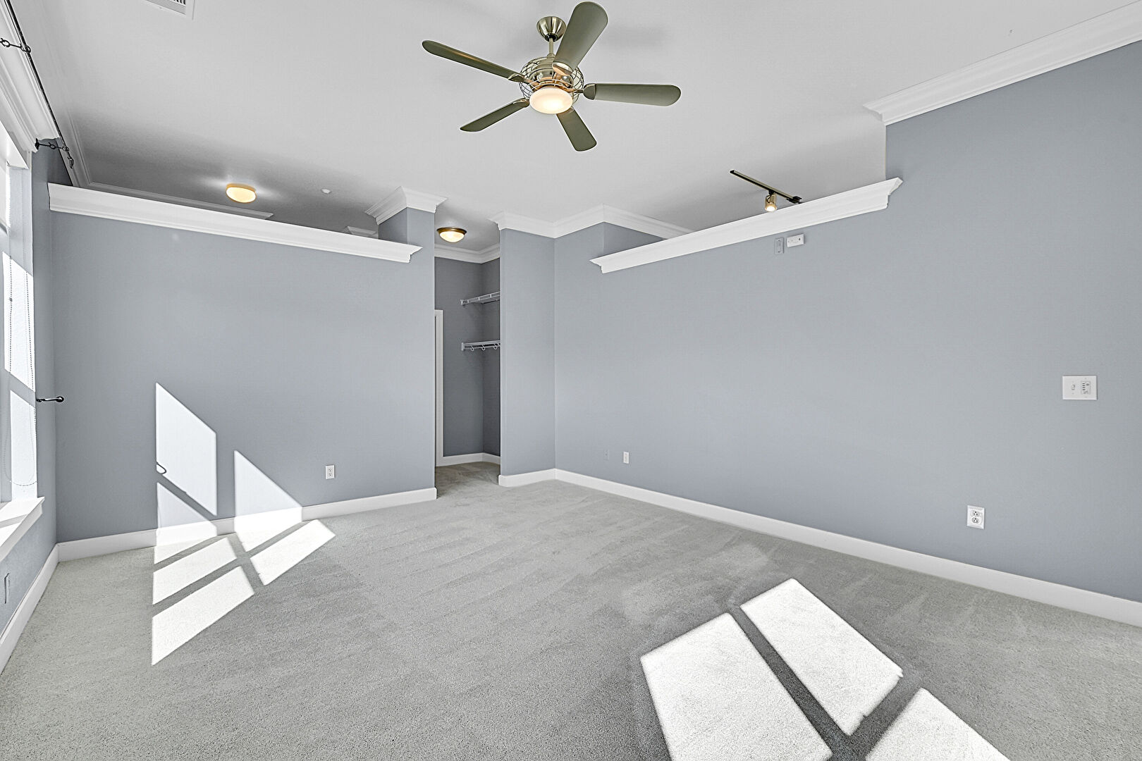 Baseboards Wall, Carpet, Ceiling Fan, Crown Molding, Drywall, Natural Light, Vent, Carpet, Closet, Drywall, Vent