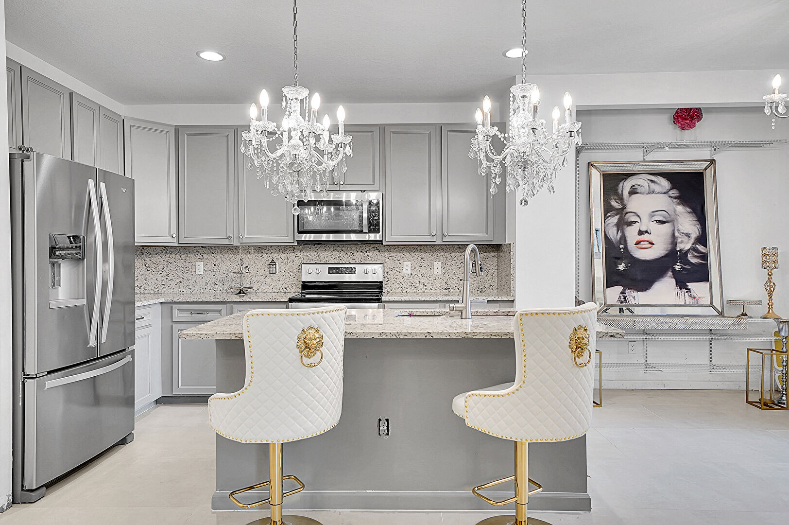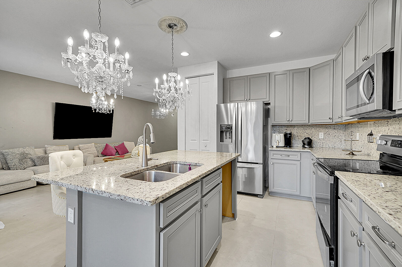 Baseboards Wall, Drywall, Gray Cabinets, Kitchen Bar, Kitchen Island, L Shaped Kitchen, Natural Light, Notable Chandelier, Opens To Living Area, Pendant Lighting, Recessed Lighting, Shaker Cabinets, Stone Countertops, Tile Floor, Vent, Gray Cabinets, Kitchen Island, Natural Light, Notable Chandelier, Textured Ceiling